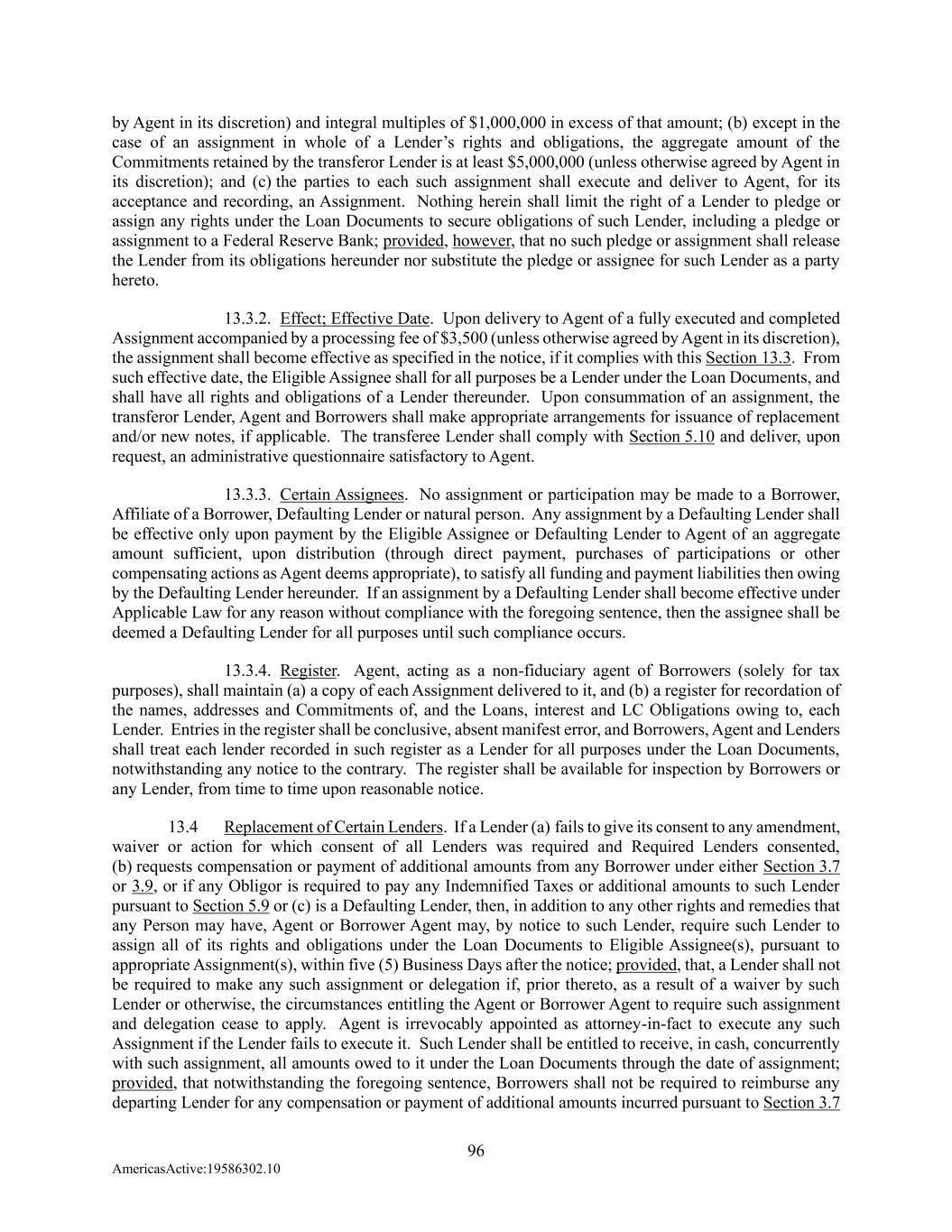 96 AmericasActive:19586302.10 by Agent in its discretion) and integral multiples of $1,000,000 in excess of that amount; (b) except in the case of an assignment in whole of a Lender’s rights and obligations, the aggregate amount of the Commitments retained by the transferor Lender is at least $5,000,000 (unless otherwise agreed by Agent in its discretion); and (c) the parties to each such assignment shall execute and deliver to Agent, for its acceptance and recording, an Assignment. Nothing herein shall limit the right of a Lender to pledge or assign any rights under the Loan Documents to secure obligations of such Lender, including a pledge or assignment to a Federal Reserve Bank; provided, however, that no such pledge or assignment shall release the Lender from its obligations hereunder nor substitute the pledge or assignee for such Lender as a party hereto. 13.3.2. Effect; Effective Date. Upon delivery to Agent of a fully executed and completed Assignment accompanied by a processing fee of $3,500 (unless otherwise agreed by Agent in its discretion), the assignment shall become effective as specified in the notice, if it complies with this Section 13.3. From such effective date, the Eligible Assignee shall for all purposes be a Lender under the Loan Documents, and shall have all rights and obligations of a Lender thereunder. Upon consummation of an assignment, the transferor Lender, Agent and Borrowers shall make appropriate arrangements for issuance of replacement and/or new notes, if applicable. The transferee Lender shall comply with Section 5.10 and deliver, upon request, an administrative questionnaire satisfactory to Agent. 13.3.3. Certain Assignees. No assignment or participation may be made to a Borrower, Affiliate of a Borrower, Defaulting Lender or natural person. Any assignment by a Defaulting Lender shall be effective only upon payment by the Eligible Assignee or Defaulting Lender to Agent of an aggregate amount sufficient, upon distribution (through direct payment, purchases of participations or other compensating actions as Agent deems appropriate), to satisfy all funding and payment liabilities then owing by the Defaulting Lender hereunder. If an assignment by a Defaulting Lender shall become effective under Applicable Law for any reason without compliance with the foregoing sentence, then the assignee shall be deemed a Defaulting Lender for all purposes until such compliance occurs. 13.3.4. Register. Agent, acting as a non-fiduciary agent of Borrowers (solely for tax purposes), shall maintain (a) a copy of each Assignment delivered to it, and (b) a register for recordation of the names, addresses and Commitments of, and the Loans, interest and LC Obligations owing to, each Lender. Entries in the register shall be conclusive, absent manifest error, and Borrowers, Agent and Lenders shall treat each lender recorded in such register as a Lender for all purposes under the Loan Documents, notwithstanding any notice to the contrary. The register shall be available for inspection by Borrowers or any Lender, from time to time upon reasonable notice. 13.4 Replacement of Certain Lenders. If a Lender (a) fails to give its consent to any amendment, waiver or action for which consent of all Lenders was required and Required Lenders consented, (b) requests compensation or payment of additional amounts from any Borrower under either Section 3.7 or 3.9, or if any Obligor is required to pay any Indemnified Taxes or additional amounts to such Lender pursuant to Section 5.9 or (c) is a Defaulting Lender, then, in addition to any other rights and remedies that any Person may have, Agent or Borrower Agent may, by notice to such Lender, require such Lender to assign all of its rights and obligations under the Loan Documents to Eligible Assignee(s), pursuant to appropriate Assignment(s), within five (5) Business Days after the notice; provided, that, a Lender shall not be required to make any such assignment or delegation if, prior thereto, as a result of a waiver by such Lender or otherwise, the circumstances entitling the Agent or Borrower Agent to require such assignment and delegation cease to apply. Agent is irrevocably appointed as attorney-in-fact to execute any such Assignment if the Lender fails to execute it. Such Lender shall be entitled to receive, in cash, concurrently with such assignment, all amounts owed to it under the Loan Documents through the date of assignment; provided, that notwithstanding the foregoing sentence, Borrowers shall not be required to reimburse any departing Lender for any compensation or payment of additional amounts incurred pursuant to Section 3.7
