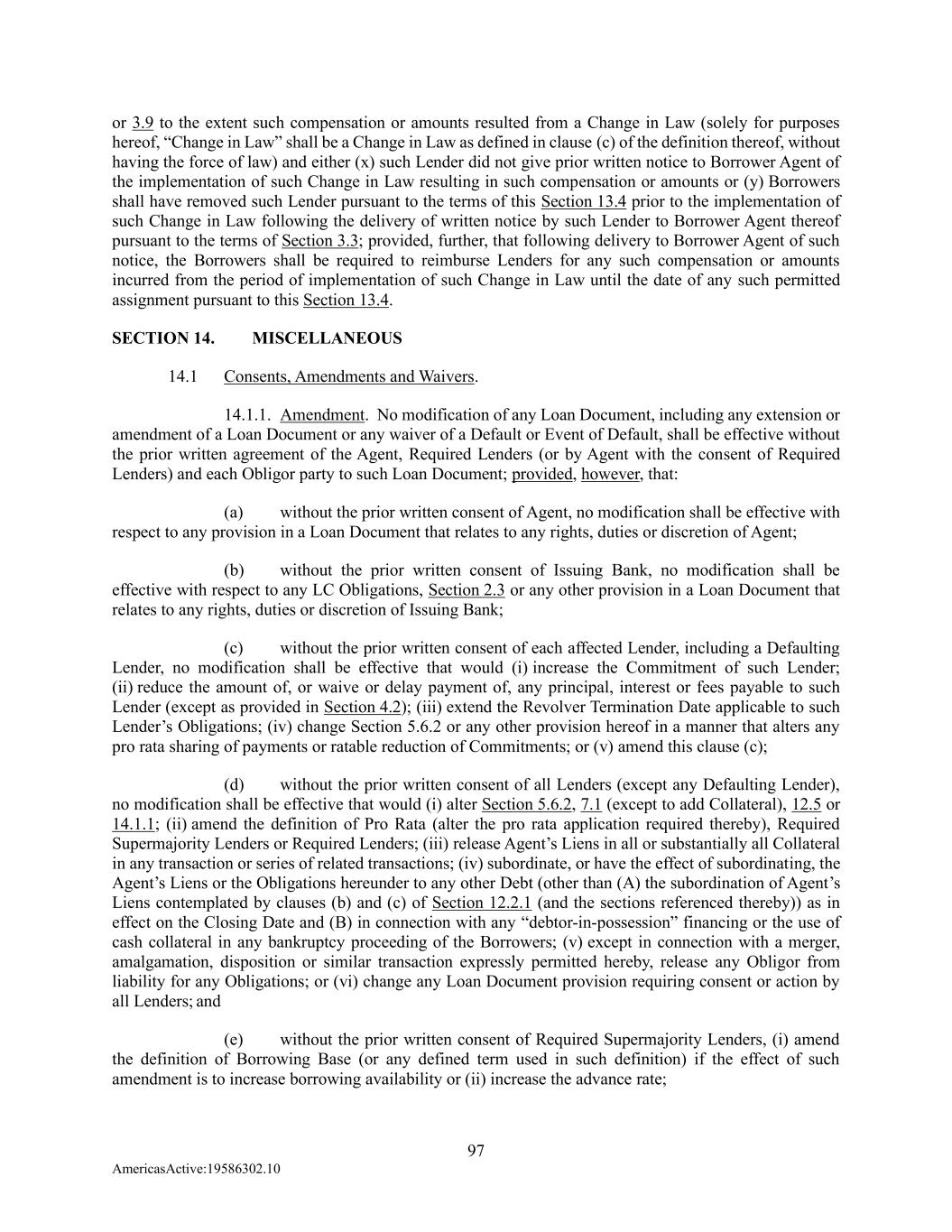 97 AmericasActive:19586302.10 or 3.9 to the extent such compensation or amounts resulted from a Change in Law (solely for purposes hereof, “Change in Law” shall be a Change in Law as defined in clause (c) of the definition thereof, without having the force of law) and either (x) such Lender did not give prior written notice to Borrower Agent of the implementation of such Change in Law resulting in such compensation or amounts or (y) Borrowers shall have removed such Lender pursuant to the terms of this Section 13.4 prior to the implementation of such Change in Law following the delivery of written notice by such Lender to Borrower Agent thereof pursuant to the terms of Section 3.3; provided, further, that following delivery to Borrower Agent of such notice, the Borrowers shall be required to reimburse Lenders for any such compensation or amounts incurred from the period of implementation of such Change in Law until the date of any such permitted assignment pursuant to this Section 13.4. SECTION 14. MISCELLANEOUS 14.1 Consents, Amendments and Waivers. 14.1.1. Amendment. No modification of any Loan Document, including any extension or amendment of a Loan Document or any waiver of a Default or Event of Default, shall be effective without the prior written agreement of the Agent, Required Lenders (or by Agent with the consent of Required Lenders) and each Obligor party to such Loan Document; provided, however, that: (a) without the prior written consent of Agent, no modification shall be effective with respect to any provision in a Loan Document that relates to any rights, duties or discretion of Agent; (b) without the prior written consent of Issuing Bank, no modification shall be effective with respect to any LC Obligations, Section 2.3 or any other provision in a Loan Document that relates to any rights, duties or discretion of Issuing Bank; (c) without the prior written consent of each affected Lender, including a Defaulting Lender, no modification shall be effective that would (i) increase the Commitment of such Lender; (ii) reduce the amount of, or waive or delay payment of, any principal, interest or fees payable to such Lender (except as provided in Section 4.2); (iii) extend the Revolver Termination Date applicable to such Lender’s Obligations; (iv) change Section 5.6.2 or any other provision hereof in a manner that alters any pro rata sharing of payments or ratable reduction of Commitments; or (v) amend this clause (c); (d) without the prior written consent of all Lenders (except any Defaulting Lender), no modification shall be effective that would (i) alter Section 5.6.2, 7.1 (except to add Collateral), 12.5 or 14.1.1; (ii) amend the definition of Pro Rata (alter the pro rata application required thereby), Required Supermajority Lenders or Required Lenders; (iii) release Agent’s Liens in all or substantially all Collateral in any transaction or series of related transactions; (iv) subordinate, or have the effect of subordinating, the Agent’s Liens or the Obligations hereunder to any other Debt (other than (A) the subordination of Agent’s Liens contemplated by clauses (b) and (c) of Section 12.2.1 (and the sections referenced thereby)) as in effect on the Closing Date and (B) in connection with any “debtor-in-possession” financing or the use of cash collateral in any bankruptcy proceeding of the Borrowers; (v) except in connection with a merger, amalgamation, disposition or similar transaction expressly permitted hereby, release any Obligor from liability for any Obligations; or (vi) change any Loan Document provision requiring consent or action by all Lenders; and (e) without the prior written consent of Required Supermajority Lenders, (i) amend the definition of Borrowing Base (or any defined term used in such definition) if the effect of such amendment is to increase borrowing availability or (ii) increase the advance rate;