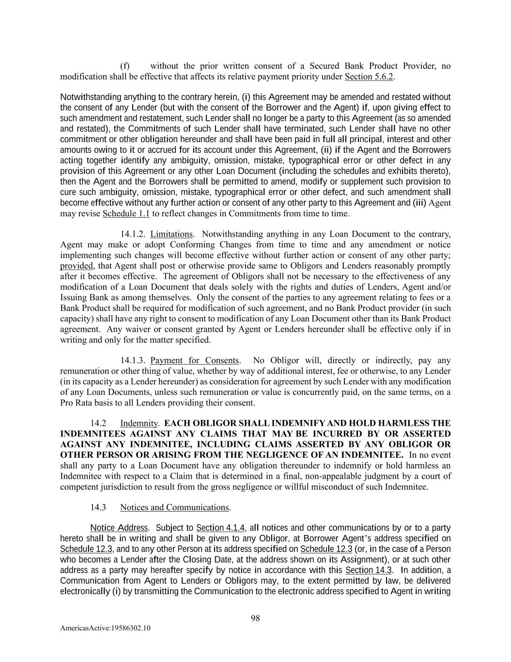 98 AmericasActive:19586302.10 (f) without the prior written consent of a Secured Bank Product Provider, no modification shall be effective that affects its relative payment priority under Section 5.6.2. Notwithstanding anything to the contrary herein, (i) this Agreement may be amended and restated without the consent of any Lender (but with the consent of the Borrower and the Agent) if, upon giving effect to such amendment and restatement, such Lender shall no longer be a party to this Agreement (as so amended and restated), the Commitments of such Lender shall have terminated, such Lender shall have no other commitment or other obligation hereunder and shall have been paid in full all principal, interest and other amounts owing to it or accrued for its account under this Agreement, (ii) if the Agent and the Borrowers acting together identify any ambiguity, omission, mistake, typographical error or other defect in any provision of this Agreement or any other Loan Document (including the schedules and exhibits thereto), then the Agent and the Borrowers shall be permitted to amend, modify or supplement such provision to cure such ambiguity, omission, mistake, typographical error or other defect, and such amendment shall become effective without any further action or consent of any other party to this Agreement and (iii) Agent may revise Schedule 1.1 to reflect changes in Commitments from time to time. 14.1.2. Limitations. Notwithstanding anything in any Loan Document to the contrary, Agent may make or adopt Conforming Changes from time to time and any amendment or notice implementing such changes will become effective without further action or consent of any other party; provided, that Agent shall post or otherwise provide same to Obligors and Lenders reasonably promptly after it becomes effective. The agreement of Obligors shall not be necessary to the effectiveness of any modification of a Loan Document that deals solely with the rights and duties of Lenders, Agent and/or Issuing Bank as among themselves. Only the consent of the parties to any agreement relating to fees or a Bank Product shall be required for modification of such agreement, and no Bank Product provider (in such capacity) shall have any right to consent to modification of any Loan Document other than its Bank Product agreement. Any waiver or consent granted by Agent or Lenders hereunder shall be effective only if in writing and only for the matter specified. 14.1.3. Payment for Consents. No Obligor will, directly or indirectly, pay any remuneration or other thing of value, whether by way of additional interest, fee or otherwise, to any Lender (in its capacity as a Lender hereunder) as consideration for agreement by such Lender with any modification of any Loan Documents, unless such remuneration or value is concurrently paid, on the same terms, on a Pro Rata basis to all Lenders providing their consent. 14.2 Indemnity. EACH OBLIGOR SHALL INDEMNIFY AND HOLD HARMLESS THE INDEMNITEES AGAINST ANY CLAIMS THAT MAY BE INCURRED BY OR ASSERTED AGAINST ANY INDEMNITEE, INCLUDING CLAIMS ASSERTED BY ANY OBLIGOR OR OTHER PERSON OR ARISING FROM THE NEGLIGENCE OF AN INDEMNITEE. In no event shall any party to a Loan Document have any obligation thereunder to indemnify or hold harmless an Indemnitee with respect to a Claim that is determined in a final, non-appealable judgment by a court of competent jurisdiction to result from the gross negligence or willful misconduct of such Indemnitee. 14.3 Notices and Communications. Notice Address. Subject to Section 4.1.4, all notices and other communications by or to a party hereto shall be in writing and shall be given to any Obligor, at Borrower Agent’s address specified on Schedule 12.3, and to any other Person at its address specified on Schedule 12.3 (or, in the case of a Person who becomes a Lender after the Closing Date, at the address shown on its Assignment), or at such other address as a party may hereafter specify by notice in accordance with this Section 14.3. In addition, a Communication from Agent to Lenders or Obligors may, to the extent permitted by law, be delivered electronically (i) by transmitting the Communication to the electronic address specified to Agent in writing