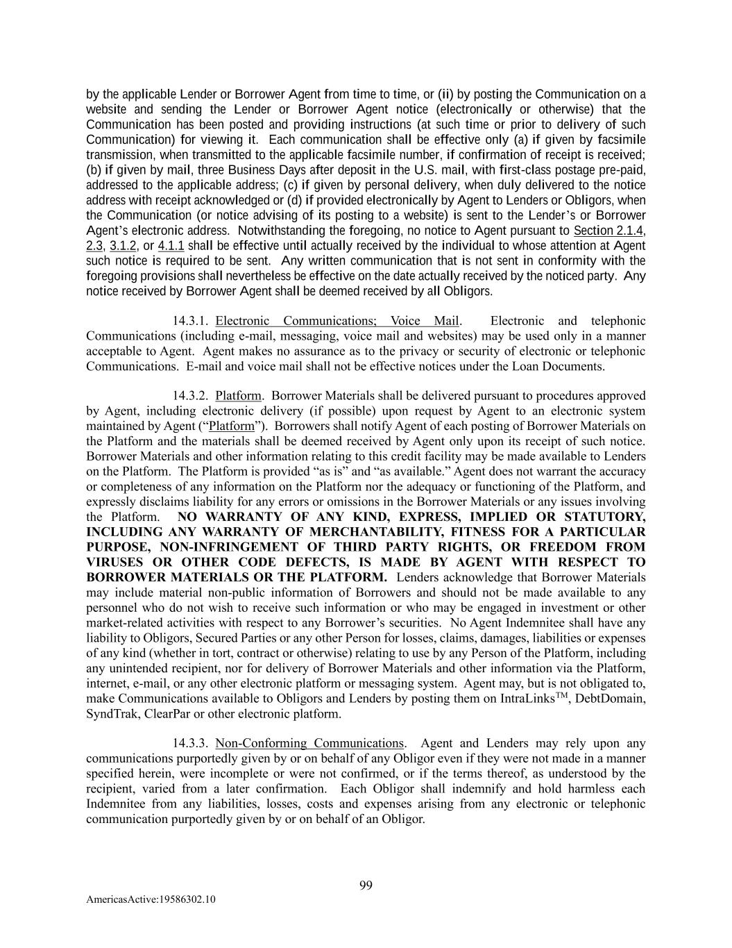 99 AmericasActive:19586302.10 by the applicable Lender or Borrower Agent from time to time, or (ii) by posting the Communication on a website and sending the Lender or Borrower Agent notice (electronically or otherwise) that the Communication has been posted and providing instructions (at such time or prior to delivery of such Communication) for viewing it. Each communication shall be effective only (a) if given by facsimile transmission, when transmitted to the applicable facsimile number, if confirmation of receipt is received; (b) if given by mail, three Business Days after deposit in the U.S. mail, with first-class postage pre-paid, addressed to the applicable address; (c) if given by personal delivery, when duly delivered to the notice address with receipt acknowledged or (d) if provided electronically by Agent to Lenders or Obligors, when the Communication (or notice advising of its posting to a website) is sent to the Lender’s or Borrower Agent’s electronic address. Notwithstanding the foregoing, no notice to Agent pursuant to Section 2.1.4, 2.3, 3.1.2, or 4.1.1 shall be effective until actually received by the individual to whose attention at Agent such notice is required to be sent. Any written communication that is not sent in conformity with the foregoing provisions shall nevertheless be effective on the date actually received by the noticed party. Any notice received by Borrower Agent shall be deemed received by all Obligors. 14.3.1. Electronic Communications; Voice Mail. Electronic and telephonic Communications (including e-mail, messaging, voice mail and websites) may be used only in a manner acceptable to Agent. Agent makes no assurance as to the privacy or security of electronic or telephonic Communications. E-mail and voice mail shall not be effective notices under the Loan Documents. 14.3.2. Platform. Borrower Materials shall be delivered pursuant to procedures approved by Agent, including electronic delivery (if possible) upon request by Agent to an electronic system maintained by Agent (“Platform”). Borrowers shall notify Agent of each posting of Borrower Materials on the Platform and the materials shall be deemed received by Agent only upon its receipt of such notice. Borrower Materials and other information relating to this credit facility may be made available to Lenders on the Platform. The Platform is provided “as is” and “as available.” Agent does not warrant the accuracy or completeness of any information on the Platform nor the adequacy or functioning of the Platform, and expressly disclaims liability for any errors or omissions in the Borrower Materials or any issues involving the Platform. NO WARRANTY OF ANY KIND, EXPRESS, IMPLIED OR STATUTORY, INCLUDING ANY WARRANTY OF MERCHANTABILITY, FITNESS FOR A PARTICULAR PURPOSE, NON-INFRINGEMENT OF THIRD PARTY RIGHTS, OR FREEDOM FROM VIRUSES OR OTHER CODE DEFECTS, IS MADE BY AGENT WITH RESPECT TO BORROWER MATERIALS OR THE PLATFORM. Lenders acknowledge that Borrower Materials may include material non-public information of Borrowers and should not be made available to any personnel who do not wish to receive such information or who may be engaged in investment or other market-related activities with respect to any Borrower’s securities. No Agent Indemnitee shall have any liability to Obligors, Secured Parties or any other Person for losses, claims, damages, liabilities or expenses of any kind (whether in tort, contract or otherwise) relating to use by any Person of the Platform, including any unintended recipient, nor for delivery of Borrower Materials and other information via the Platform, internet, e-mail, or any other electronic platform or messaging system. Agent may, but is not obligated to, make Communications available to Obligors and Lenders by posting them on IntraLinksTM, DebtDomain, SyndTrak, ClearPar or other electronic platform. 14.3.3. Non-Conforming Communications. Agent and Lenders may rely upon any communications purportedly given by or on behalf of any Obligor even if they were not made in a manner specified herein, were incomplete or were not confirmed, or if the terms thereof, as understood by the recipient, varied from a later confirmation. Each Obligor shall indemnify and hold harmless each Indemnitee from any liabilities, losses, costs and expenses arising from any electronic or telephonic communication purportedly given by or on behalf of an Obligor.