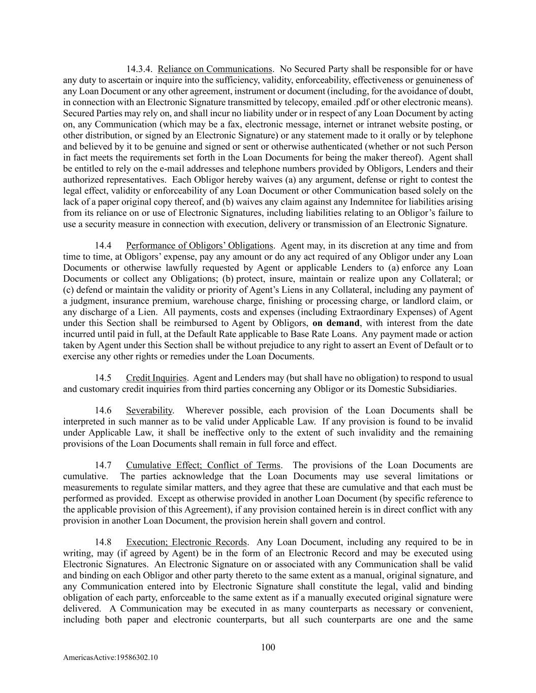 100 AmericasActive:19586302.10 14.3.4. Reliance on Communications. No Secured Party shall be responsible for or have any duty to ascertain or inquire into the sufficiency, validity, enforceability, effectiveness or genuineness of any Loan Document or any other agreement, instrument or document (including, for the avoidance of doubt, in connection with an Electronic Signature transmitted by telecopy, emailed .pdf or other electronic means). Secured Parties may rely on, and shall incur no liability under or in respect of any Loan Document by acting on, any Communication (which may be a fax, electronic message, internet or intranet website posting, or other distribution, or signed by an Electronic Signature) or any statement made to it orally or by telephone and believed by it to be genuine and signed or sent or otherwise authenticated (whether or not such Person in fact meets the requirements set forth in the Loan Documents for being the maker thereof). Agent shall be entitled to rely on the e-mail addresses and telephone numbers provided by Obligors, Lenders and their authorized representatives. Each Obligor hereby waives (a) any argument, defense or right to contest the legal effect, validity or enforceability of any Loan Document or other Communication based solely on the lack of a paper original copy thereof, and (b) waives any claim against any Indemnitee for liabilities arising from its reliance on or use of Electronic Signatures, including liabilities relating to an Obligor’s failure to use a security measure in connection with execution, delivery or transmission of an Electronic Signature. 14.4 Performance of Obligors’ Obligations. Agent may, in its discretion at any time and from time to time, at Obligors’ expense, pay any amount or do any act required of any Obligor under any Loan Documents or otherwise lawfully requested by Agent or applicable Lenders to (a) enforce any Loan Documents or collect any Obligations; (b) protect, insure, maintain or realize upon any Collateral; or (c) defend or maintain the validity or priority of Agent’s Liens in any Collateral, including any payment of a judgment, insurance premium, warehouse charge, finishing or processing charge, or landlord claim, or any discharge of a Lien. All payments, costs and expenses (including Extraordinary Expenses) of Agent under this Section shall be reimbursed to Agent by Obligors, on demand, with interest from the date incurred until paid in full, at the Default Rate applicable to Base Rate Loans. Any payment made or action taken by Agent under this Section shall be without prejudice to any right to assert an Event of Default or to exercise any other rights or remedies under the Loan Documents. 14.5 Credit Inquiries. Agent and Lenders may (but shall have no obligation) to respond to usual and customary credit inquiries from third parties concerning any Obligor or its Domestic Subsidiaries. 14.6 Severability. Wherever possible, each provision of the Loan Documents shall be interpreted in such manner as to be valid under Applicable Law. If any provision is found to be invalid under Applicable Law, it shall be ineffective only to the extent of such invalidity and the remaining provisions of the Loan Documents shall remain in full force and effect. 14.7 Cumulative Effect; Conflict of Terms. The provisions of the Loan Documents are cumulative. The parties acknowledge that the Loan Documents may use several limitations or measurements to regulate similar matters, and they agree that these are cumulative and that each must be performed as provided. Except as otherwise provided in another Loan Document (by specific reference to the applicable provision of this Agreement), if any provision contained herein is in direct conflict with any provision in another Loan Document, the provision herein shall govern and control. 14.8 Execution; Electronic Records. Any Loan Document, including any required to be in writing, may (if agreed by Agent) be in the form of an Electronic Record and may be executed using Electronic Signatures. An Electronic Signature on or associated with any Communication shall be valid and binding on each Obligor and other party thereto to the same extent as a manual, original signature, and any Communication entered into by Electronic Signature shall constitute the legal, valid and binding obligation of each party, enforceable to the same extent as if a manually executed original signature were delivered. A Communication may be executed in as many counterparts as necessary or convenient, including both paper and electronic counterparts, but all such counterparts are one and the same