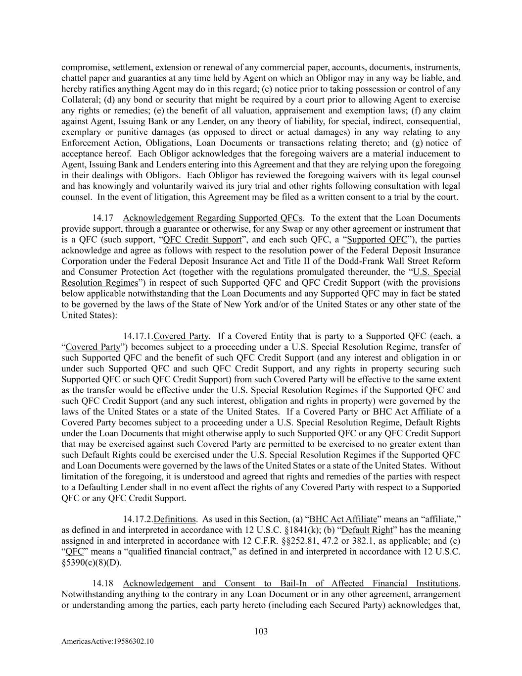 103 AmericasActive:19586302.10 compromise, settlement, extension or renewal of any commercial paper, accounts, documents, instruments, chattel paper and guaranties at any time held by Agent on which an Obligor may in any way be liable, and hereby ratifies anything Agent may do in this regard; (c) notice prior to taking possession or control of any Collateral; (d) any bond or security that might be required by a court prior to allowing Agent to exercise any rights or remedies; (e) the benefit of all valuation, appraisement and exemption laws; (f) any claim against Agent, Issuing Bank or any Lender, on any theory of liability, for special, indirect, consequential, exemplary or punitive damages (as opposed to direct or actual damages) in any way relating to any Enforcement Action, Obligations, Loan Documents or transactions relating thereto; and (g) notice of acceptance hereof. Each Obligor acknowledges that the foregoing waivers are a material inducement to Agent, Issuing Bank and Lenders entering into this Agreement and that they are relying upon the foregoing in their dealings with Obligors. Each Obligor has reviewed the foregoing waivers with its legal counsel and has knowingly and voluntarily waived its jury trial and other rights following consultation with legal counsel. In the event of litigation, this Agreement may be filed as a written consent to a trial by the court. 14.17 Acknowledgement Regarding Supported QFCs. To the extent that the Loan Documents provide support, through a guarantee or otherwise, for any Swap or any other agreement or instrument that is a QFC (such support, “QFC Credit Support”, and each such QFC, a “Supported QFC”), the parties acknowledge and agree as follows with respect to the resolution power of the Federal Deposit Insurance Corporation under the Federal Deposit Insurance Act and Title II of the Dodd-Frank Wall Street Reform and Consumer Protection Act (together with the regulations promulgated thereunder, the “U.S. Special Resolution Regimes”) in respect of such Supported QFC and QFC Credit Support (with the provisions below applicable notwithstanding that the Loan Documents and any Supported QFC may in fact be stated to be governed by the laws of the State of New York and/or of the United States or any other state of the United States): 14.17.1. Covered Party. If a Covered Entity that is party to a Supported QFC (each, a “Covered Party”) becomes subject to a proceeding under a U.S. Special Resolution Regime, transfer of such Supported QFC and the benefit of such QFC Credit Support (and any interest and obligation in or under such Supported QFC and such QFC Credit Support, and any rights in property securing such Supported QFC or such QFC Credit Support) from such Covered Party will be effective to the same extent as the transfer would be effective under the U.S. Special Resolution Regimes if the Supported QFC and such QFC Credit Support (and any such interest, obligation and rights in property) were governed by the laws of the United States or a state of the United States. If a Covered Party or BHC Act Affiliate of a Covered Party becomes subject to a proceeding under a U.S. Special Resolution Regime, Default Rights under the Loan Documents that might otherwise apply to such Supported QFC or any QFC Credit Support that may be exercised against such Covered Party are permitted to be exercised to no greater extent than such Default Rights could be exercised under the U.S. Special Resolution Regimes if the Supported QFC and Loan Documents were governed by the laws of the United States or a state of the United States. Without limitation of the foregoing, it is understood and agreed that rights and remedies of the parties with respect to a Defaulting Lender shall in no event affect the rights of any Covered Party with respect to a Supported QFC or any QFC Credit Support. 14.17.2. Definitions. As used in this Section, (a) “BHC Act Affiliate” means an “affiliate,” as defined in and interpreted in accordance with 12 U.S.C. §1841(k); (b) “Default Right” has the meaning assigned in and interpreted in accordance with 12 C.F.R. §§252.81, 47.2 or 382.1, as applicable; and (c) “QFC” means a “qualified financial contract,” as defined in and interpreted in accordance with 12 U.S.C. §5390(c)(8)(D). 14.18 Acknowledgement and Consent to Bail-In of Affected Financial Institutions. Notwithstanding anything to the contrary in any Loan Document or in any other agreement, arrangement or understanding among the parties, each party hereto (including each Secured Party) acknowledges that,