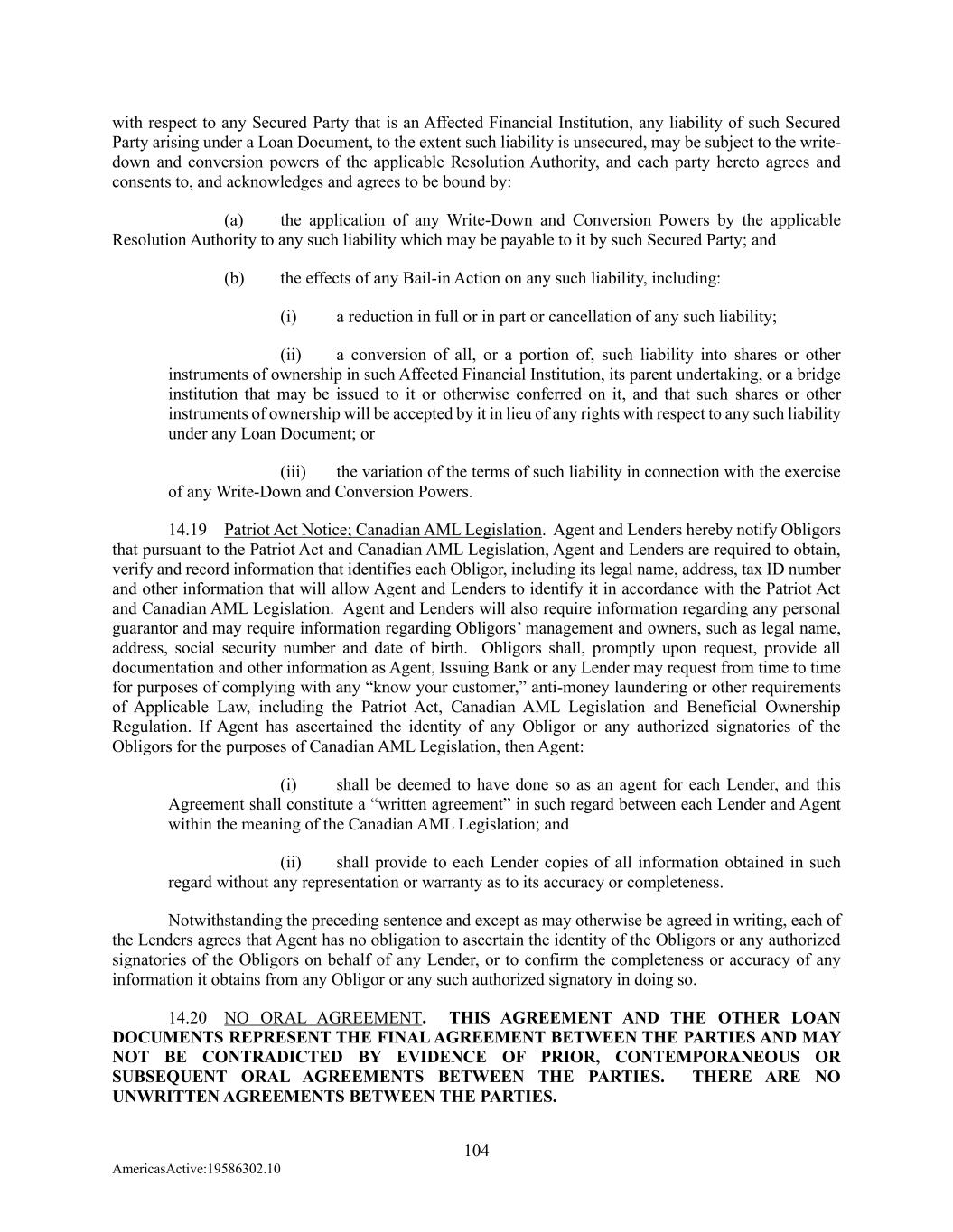 104 AmericasActive:19586302.10 with respect to any Secured Party that is an Affected Financial Institution, any liability of such Secured Party arising under a Loan Document, to the extent such liability is unsecured, may be subject to the write- down and conversion powers of the applicable Resolution Authority, and each party hereto agrees and consents to, and acknowledges and agrees to be bound by: (a) the application of any Write-Down and Conversion Powers by the applicable Resolution Authority to any such liability which may be payable to it by such Secured Party; and (b) the effects of any Bail-in Action on any such liability, including: (i) a reduction in full or in part or cancellation of any such liability; (ii) a conversion of all, or a portion of, such liability into shares or other instruments of ownership in such Affected Financial Institution, its parent undertaking, or a bridge institution that may be issued to it or otherwise conferred on it, and that such shares or other instruments of ownership will be accepted by it in lieu of any rights with respect to any such liability under any Loan Document; or (iii) the variation of the terms of such liability in connection with the exercise of any Write-Down and Conversion Powers. 14.19 Patriot Act Notice; Canadian AML Legislation. Agent and Lenders hereby notify Obligors that pursuant to the Patriot Act and Canadian AML Legislation, Agent and Lenders are required to obtain, verify and record information that identifies each Obligor, including its legal name, address, tax ID number and other information that will allow Agent and Lenders to identify it in accordance with the Patriot Act and Canadian AML Legislation. Agent and Lenders will also require information regarding any personal guarantor and may require information regarding Obligors’ management and owners, such as legal name, address, social security number and date of birth. Obligors shall, promptly upon request, provide all documentation and other information as Agent, Issuing Bank or any Lender may request from time to time for purposes of complying with any “know your customer,” anti-money laundering or other requirements of Applicable Law, including the Patriot Act, Canadian AML Legislation and Beneficial Ownership Regulation. If Agent has ascertained the identity of any Obligor or any authorized signatories of the Obligors for the purposes of Canadian AML Legislation, then Agent: (i) shall be deemed to have done so as an agent for each Lender, and this Agreement shall constitute a “written agreement” in such regard between each Lender and Agent within the meaning of the Canadian AML Legislation; and (ii) shall provide to each Lender copies of all information obtained in such regard without any representation or warranty as to its accuracy or completeness. Notwithstanding the preceding sentence and except as may otherwise be agreed in writing, each of the Lenders agrees that Agent has no obligation to ascertain the identity of the Obligors or any authorized signatories of the Obligors on behalf of any Lender, or to confirm the completeness or accuracy of any information it obtains from any Obligor or any such authorized signatory in doing so. 14.20 NO ORAL AGREEMENT. THIS AGREEMENT AND THE OTHER LOAN DOCUMENTS REPRESENT THE FINAL AGREEMENT BETWEEN THE PARTIES AND MAY NOT BE CONTRADICTED BY EVIDENCE OF PRIOR, CONTEMPORANEOUS OR SUBSEQUENT ORAL AGREEMENTS BETWEEN THE PARTIES. THERE ARE NO UNWRITTEN AGREEMENTS BETWEEN THE PARTIES.