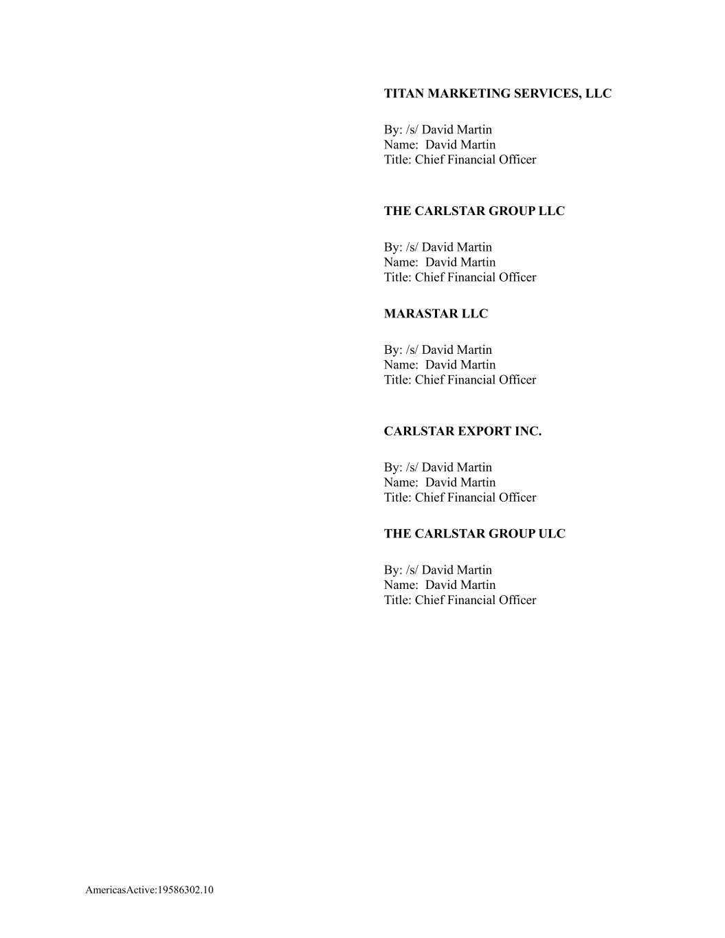AmericasActive:19586302.10 TITAN MARKETING SERVICES, LLC By: /s/ David Martin Name: David Martin Title: Chief Financial Officer THE CARLSTAR GROUP LLC By: /s/ David Martin Name: David Martin Title: Chief Financial Officer MARASTAR LLC By: /s/ David Martin Name: David Martin Title: Chief Financial Officer CARLSTAR EXPORT INC. By: /s/ David Martin Name: David Martin Title: Chief Financial Officer THE CARLSTAR GROUP ULC By: /s/ David Martin Name: David Martin Title: Chief Financial Officer