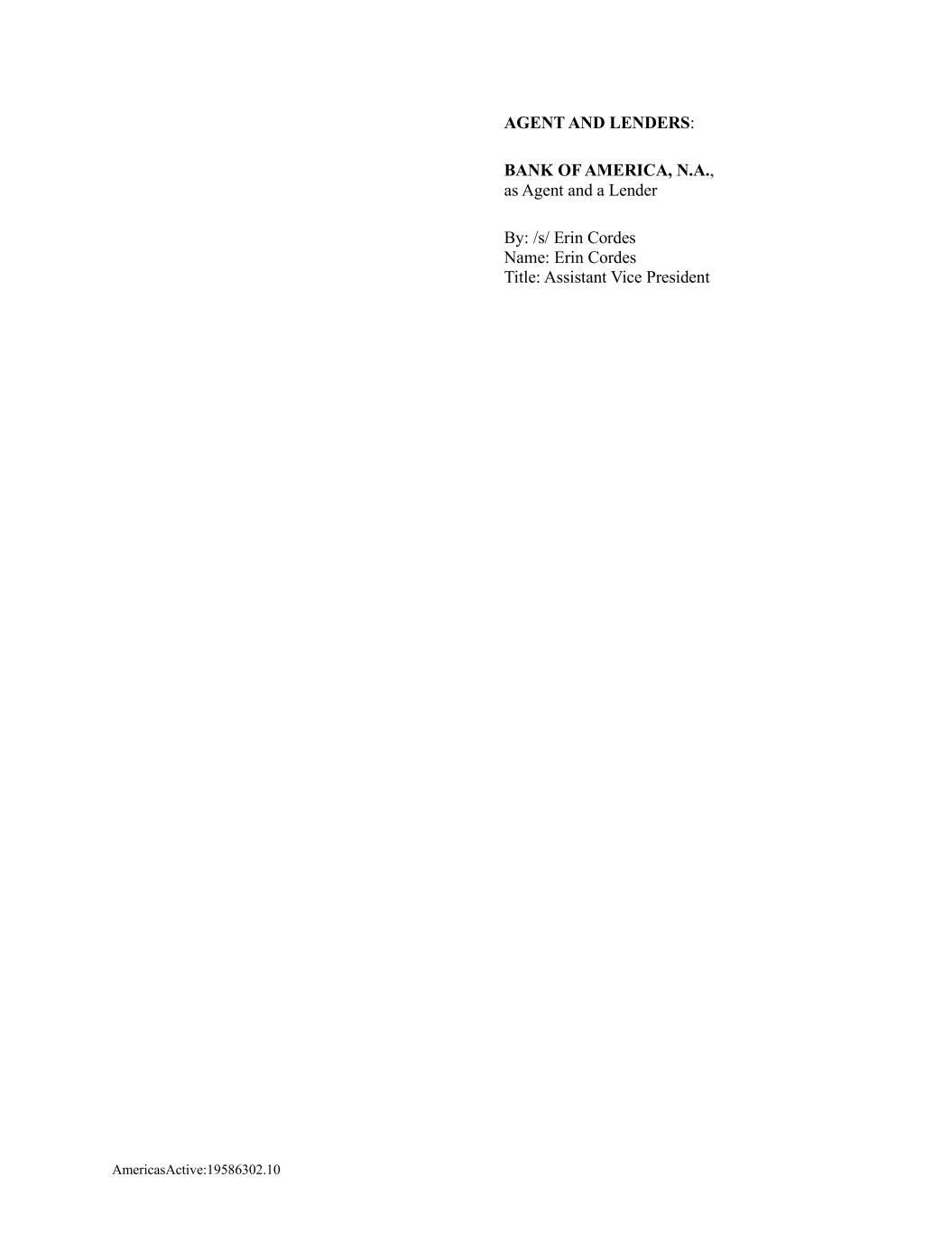 AmericasActive:19586302.10 AGENT AND LENDERS: BANK OF AMERICA, N.A., as Agent and a Lender By: /s/ Erin Cordes Name: Erin Cordes Title: Assistant Vice President