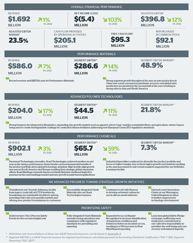 Our carbon and pavement businesses led the way in delivering record performance. Performance Materials delivered record revenue and segment EBITDA* and continued to see strong segment growth as global auto production recovered from diminished coronavirus pandemic era production levels over the course of the year. Advanced Polymer Technologies (“APT”), formerly known as our Engineered Polymers business, continued strong business development, expanding into growth markets such as apparel and agriculture. Our Performance Chemicals segment was a tale of two businesses in 2023 as we worked through the impacts of unprecedented crude tall oil price levels on our legacy Industrial Specialties business while Pavement Technologies, hereafter Road Technologies, continued its strong performance and had another record year.