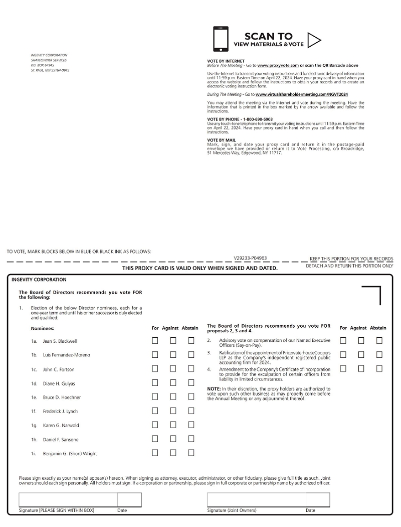 It is our pleasure to invite you to attend the 2024 annual meeting of stockholders (the “Annual Meeting”) of Ingevity Corporation (“Ingevity,” the “Company” or “us”). The Annual Meeting will be held virtually via live audio webcast on April 23, 2024, at 9:30 a.m. Eastern Time.