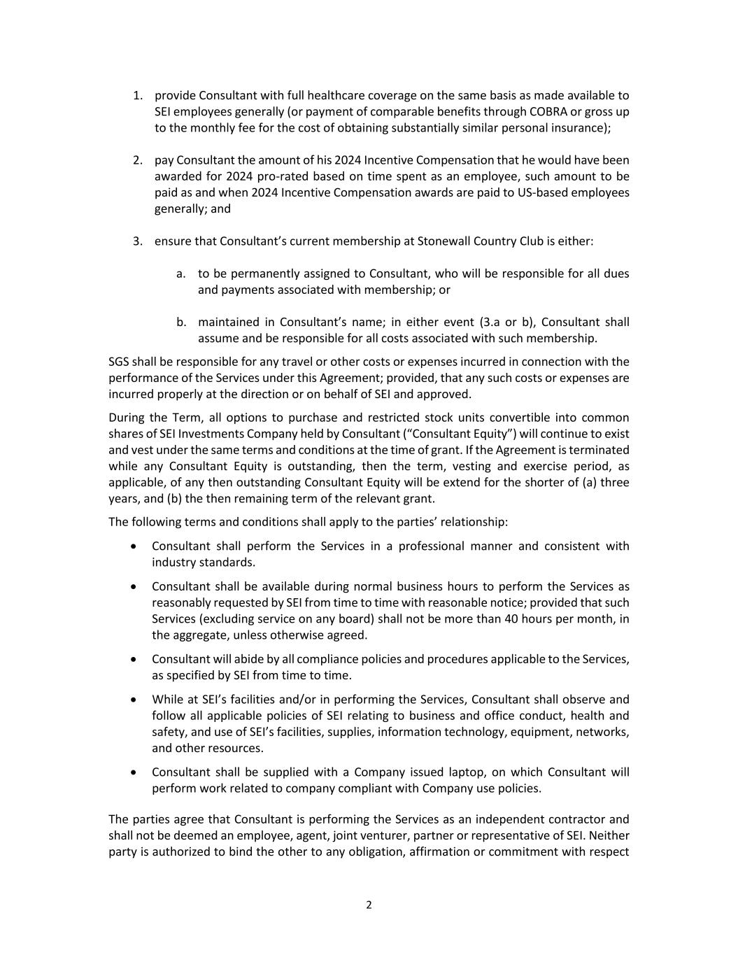2 1. provide Consultant with full healthcare coverage on the same basis as made available to SEI employees generally (or payment of comparable benefits through COBRA or gross up to the monthly fee for the cost of obtaining substantially similar personal insurance); 2. pay Consultant the amount of his 2024 Incentive Compensation that he would have been awarded for 2024 pro-rated based on time spent as an employee, such amount to be paid as and when 2024 Incentive Compensation awards are paid to US-based employees generally; and 3. ensure that Consultant’s current membership at Stonewall Country Club is either: a. to be permanently assigned to Consultant, who will be responsible for all dues and payments associated with membership; or b. maintained in Consultant’s name; in either event (3.a or b), Consultant shall assume and be responsible for all costs associated with such membership. SGS shall be responsible for any travel or other costs or expenses incurred in connection with the performance of the Services under this Agreement; provided, that any such costs or expenses are incurred properly at the direction or on behalf of SEI and approved. During the Term, all options to purchase and restricted stock units convertible into common shares of SEI Investments Company held by Consultant (“Consultant Equity”) will continue to exist and vest under the same terms and conditions at the time of grant. If the Agreement is terminated while any Consultant Equity is outstanding, then the term, vesting and exercise period, as applicable, of any then outstanding Consultant Equity will be extend for the shorter of (a) three years, and (b) the then remaining term of the relevant grant. The following terms and conditions shall apply to the parties’ relationship: Consultant shall perform the Services in a professional manner and consistent with industry standards. Consultant shall be available during normal business hours to perform the Services as reasonably requested by SEI from time to time with reasonable notice; provided that such Services (excluding service on any board) shall not be more than 40 hours per month, in the aggregate, unless otherwise agreed. Consultant will abide by all compliance policies and procedures applicable to the Services, as specified by SEI from time to time. While at SEI’s facilities and/or in performing the Services, Consultant shall observe and follow all applicable policies of SEI relating to business and office conduct, health and safety, and use of SEI’s facilities, supplies, information technology, equipment, networks, and other resources. Consultant shall be supplied with a Company issued laptop, on which Consultant will perform work related to company compliant with Company use policies. The parties agree that Consultant is performing the Services as an independent contractor and shall not be deemed an employee, agent, joint venturer, partner or representative of SEI. Neither party is authorized to bind the other to any obligation, affirmation or commitment with respect
