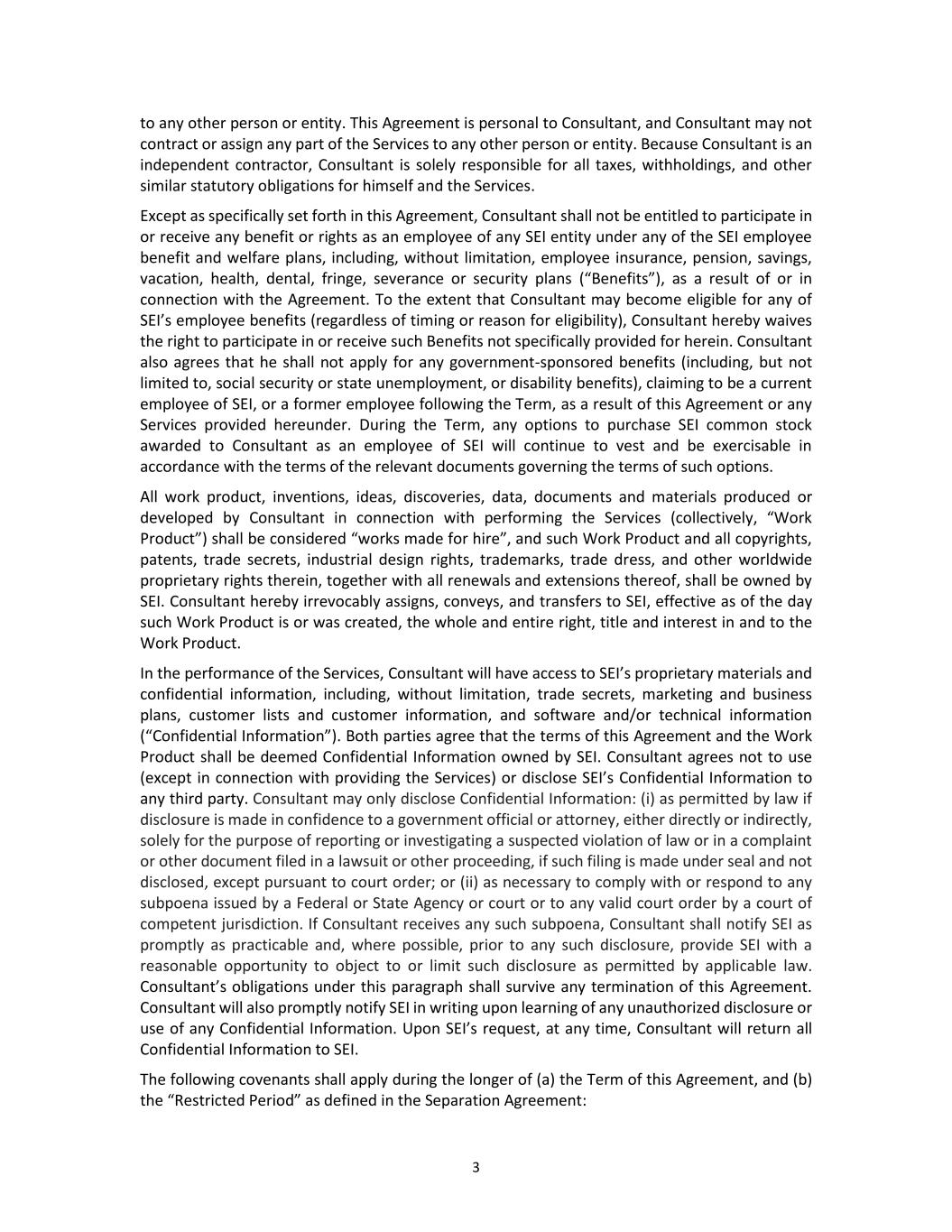 3 to any other person or entity. This Agreement is personal to Consultant, and Consultant may not contract or assign any part of the Services to any other person or entity. Because Consultant is an independent contractor, Consultant is solely responsible for all taxes, withholdings, and other similar statutory obligations for himself and the Services. Except as specifically set forth in this Agreement, Consultant shall not be entitled to participate in or receive any benefit or rights as an employee of any SEI entity under any of the SEI employee benefit and welfare plans, including, without limitation, employee insurance, pension, savings, vacation, health, dental, fringe, severance or security plans (“Benefits”), as a result of or in connection with the Agreement. To the extent that Consultant may become eligible for any of SEI’s employee benefits (regardless of timing or reason for eligibility), Consultant hereby waives the right to participate in or receive such Benefits not specifically provided for herein. Consultant also agrees that he shall not apply for any government-sponsored benefits (including, but not limited to, social security or state unemployment, or disability benefits), claiming to be a current employee of SEI, or a former employee following the Term, as a result of this Agreement or any Services provided hereunder. During the Term, any options to purchase SEI common stock awarded to Consultant as an employee of SEI will continue to vest and be exercisable in accordance with the terms of the relevant documents governing the terms of such options. All work product, inventions, ideas, discoveries, data, documents and materials produced or developed by Consultant in connection with performing the Services (collectively, “Work Product”) shall be considered “works made for hire”, and such Work Product and all copyrights, patents, trade secrets, industrial design rights, trademarks, trade dress, and other worldwide proprietary rights therein, together with all renewals and extensions thereof, shall be owned by SEI. Consultant hereby irrevocably assigns, conveys, and transfers to SEI, effective as of the day such Work Product is or was created, the whole and entire right, title and interest in and to the Work Product. In the performance of the Services, Consultant will have access to SEI’s proprietary materials and confidential information, including, without limitation, trade secrets, marketing and business plans, customer lists and customer information, and software and/or technical information (“Confidential Information”). Both parties agree that the terms of this Agreement and the Work Product shall be deemed Confidential Information owned by SEI. Consultant agrees not to use (except in connection with providing the Services) or disclose SEI’s Confidential Information to any third party. Consultant may only disclose Confidential Information: (i) as permitted by law if disclosure is made in confidence to a government official or attorney, either directly or indirectly, solely for the purpose of reporting or investigating a suspected violation of law or in a complaint or other document filed in a lawsuit or other proceeding, if such filing is made under seal and not disclosed, except pursuant to court order; or (ii) as necessary to comply with or respond to any subpoena issued by a Federal or State Agency or court or to any valid court order by a court of competent jurisdiction. If Consultant receives any such subpoena, Consultant shall notify SEI as promptly as practicable and, where possible, prior to any such disclosure, provide SEI with a reasonable opportunity to object to or limit such disclosure as permitted by applicable law. Consultant’s obligations under this paragraph shall survive any termination of this Agreement. Consultant will also promptly notify SEI in writing upon learning of any unauthorized disclosure or use of any Confidential Information. Upon SEI’s request, at any time, Consultant will return all Confidential Information to SEI. The following covenants shall apply during the longer of (a) the Term of this Agreement, and (b) the “Restricted Period” as defined in the Separation Agreement: