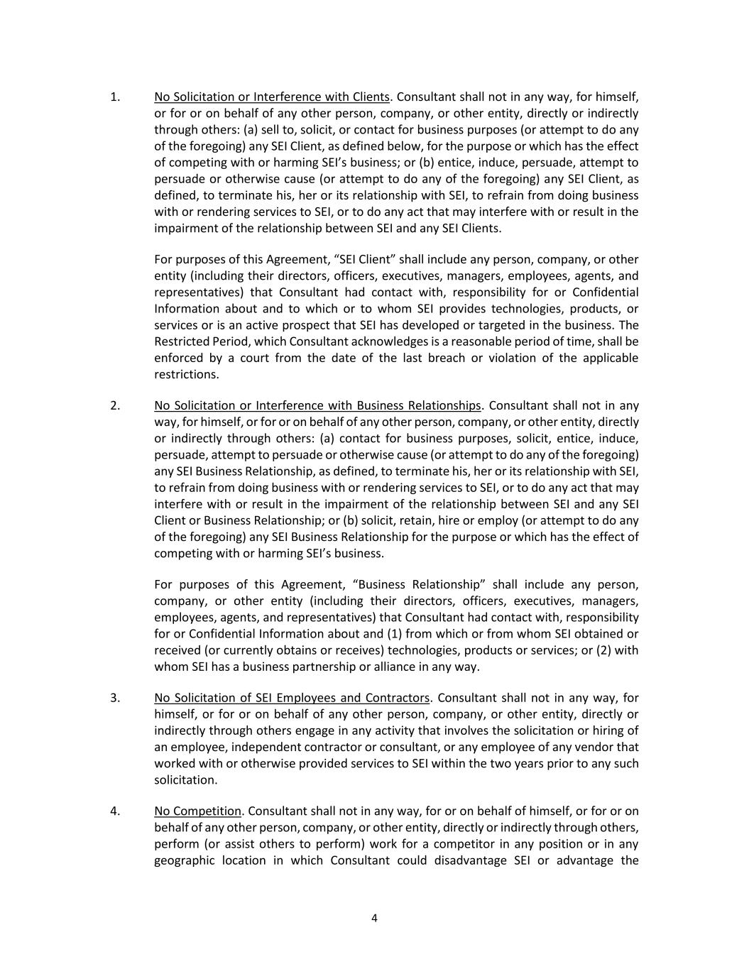 4 1. No Solicitation or Interference with Clients. Consultant shall not in any way, for himself, or for or on behalf of any other person, company, or other entity, directly or indirectly through others: (a) sell to, solicit, or contact for business purposes (or attempt to do any of the foregoing) any SEI Client, as defined below, for the purpose or which has the effect of competing with or harming SEI’s business; or (b) entice, induce, persuade, attempt to persuade or otherwise cause (or attempt to do any of the foregoing) any SEI Client, as defined, to terminate his, her or its relationship with SEI, to refrain from doing business with or rendering services to SEI, or to do any act that may interfere with or result in the impairment of the relationship between SEI and any SEI Clients. For purposes of this Agreement, “SEI Client” shall include any person, company, or other entity (including their directors, officers, executives, managers, employees, agents, and representatives) that Consultant had contact with, responsibility for or Confidential Information about and to which or to whom SEI provides technologies, products, or services or is an active prospect that SEI has developed or targeted in the business. The Restricted Period, which Consultant acknowledges is a reasonable period of time, shall be enforced by a court from the date of the last breach or violation of the applicable restrictions. 2. No Solicitation or Interference with Business Relationships. Consultant shall not in any way, for himself, or for or on behalf of any other person, company, or other entity, directly or indirectly through others: (a) contact for business purposes, solicit, entice, induce, persuade, attempt to persuade or otherwise cause (or attempt to do any of the foregoing) any SEI Business Relationship, as defined, to terminate his, her or its relationship with SEI, to refrain from doing business with or rendering services to SEI, or to do any act that may interfere with or result in the impairment of the relationship between SEI and any SEI Client or Business Relationship; or (b) solicit, retain, hire or employ (or attempt to do any of the foregoing) any SEI Business Relationship for the purpose or which has the effect of competing with or harming SEI’s business. For purposes of this Agreement, “Business Relationship” shall include any person, company, or other entity (including their directors, officers, executives, managers, employees, agents, and representatives) that Consultant had contact with, responsibility for or Confidential Information about and (1) from which or from whom SEI obtained or received (or currently obtains or receives) technologies, products or services; or (2) with whom SEI has a business partnership or alliance in any way. 3. No Solicitation of SEI Employees and Contractors. Consultant shall not in any way, for himself, or for or on behalf of any other person, company, or other entity, directly or indirectly through others engage in any activity that involves the solicitation or hiring of an employee, independent contractor or consultant, or any employee of any vendor that worked with or otherwise provided services to SEI within the two years prior to any such solicitation. 4. No Competition. Consultant shall not in any way, for or on behalf of himself, or for or on behalf of any other person, company, or other entity, directly or indirectly through others, perform (or assist others to perform) work for a competitor in any position or in any geographic location in which Consultant could disadvantage SEI or advantage the