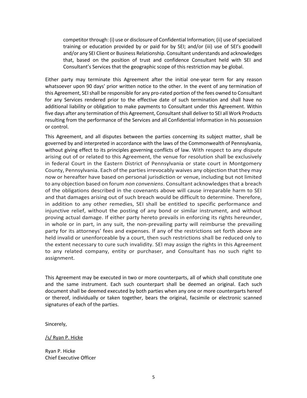 5 competitor through: (i) use or disclosure of Confidential Information; (ii) use of specialized training or education provided by or paid for by SEI; and/or (iii) use of SEI’s goodwill and/or any SEI Client or Business Relationship. Consultant understands and acknowledges that, based on the position of trust and confidence Consultant held with SEI and Consultant’s Services that the geographic scope of this restriction may be global. Either party may terminate this Agreement after the initial one-year term for any reason whatsoever upon 90 days' prior written notice to the other. In the event of any termination of this Agreement, SEI shall be responsible for any pro-rated portion of the fees owned to Consultant for any Services rendered prior to the effective date of such termination and shall have no additional liability or obligation to make payments to Consultant under this Agreement. Within five days after any termination of this Agreement, Consultant shall deliver to SEI all Work Products resulting from the performance of the Services and all Confidential Information in his possession or control. This Agreement, and all disputes between the parties concerning its subject matter, shall be governed by and interpreted in accordance with the laws of the Commonwealth of Pennsylvania, without giving effect to its principles governing conflicts of law. With respect to any dispute arising out of or related to this Agreement, the venue for resolution shall be exclusively in federal Court in the Eastern District of Pennsylvania or state court in Montgomery County, Pennsylvania. Each of the parties irrevocably waives any objection that they may now or hereafter have based on personal jurisdiction or venue, including but not limited to any objection based on forum non conveniens. Consultant acknowledges that a breach of the obligations described in the covenants above will cause irreparable harm to SEI and that damages arising out of such breach would be difficult to determine. Therefore, in addition to any other remedies, SEI shall be entitled to specific performance and injunctive relief, without the posting of any bond or similar instrument, and without proving actual damage. If either party hereto prevails in enforcing its rights hereunder, in whole or in part, in any suit, the non-prevailing party will reimburse the prevailing party for its attorneys’ fees and expenses. If any of the restrictions set forth above are held invalid or unenforceable by a court, then such restrictions shall be reduced only to the extent necessary to cure such invalidity. SEI may assign the rights in this Agreement to any related company, entity or purchaser, and Consultant has no such right to assignment. This Agreement may be executed in two or more counterparts, all of which shall constitute one and the same instrument. Each such counterpart shall be deemed an original. Each such document shall be deemed executed by both parties when any one or more counterparts hereof or thereof, individually or taken together, bears the original, facsimile or electronic scanned signatures of each of the parties. Sincerely, /s/ Ryan P. Hicke Ryan P. Hicke Chief Executive Officer