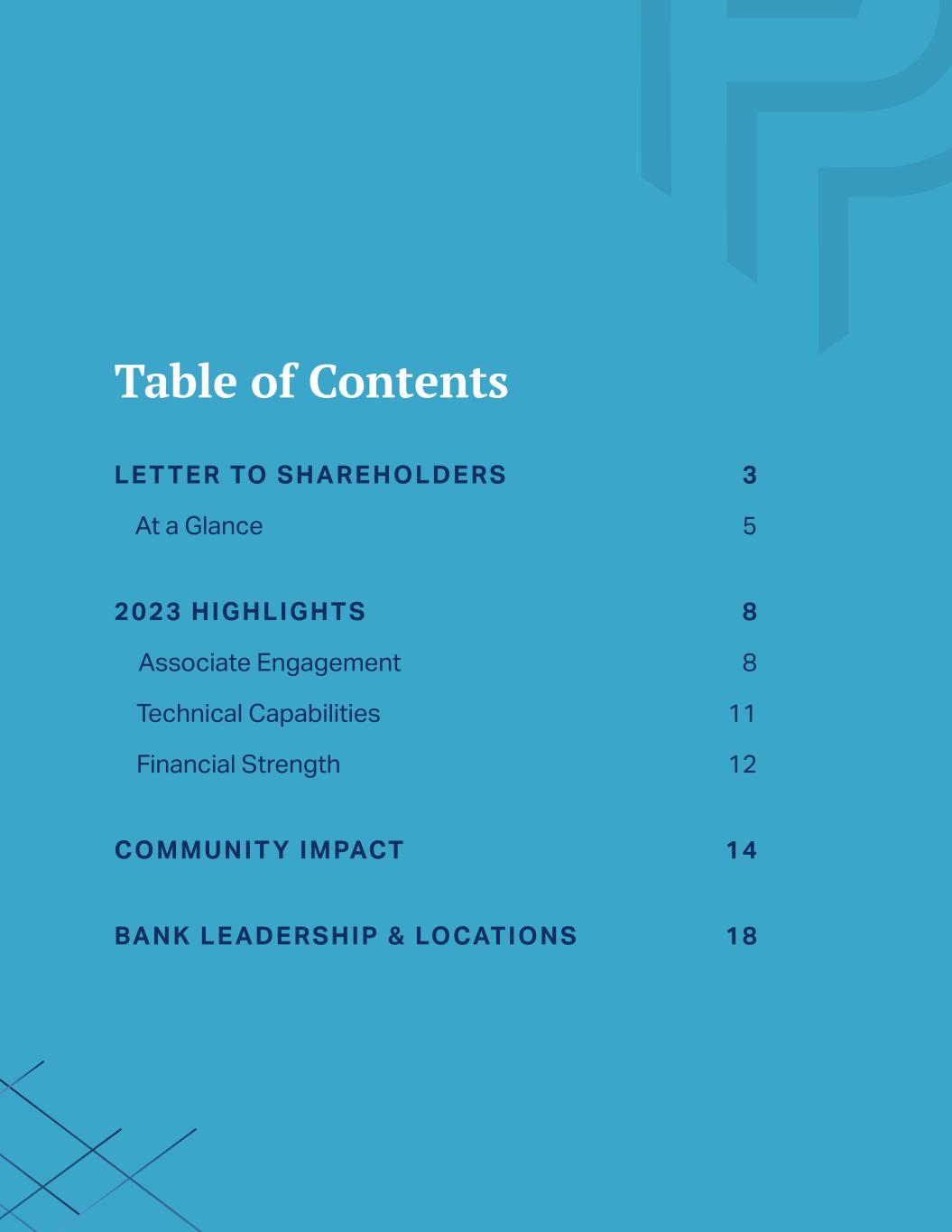 Table of Contents LET TER TO SHAREHOLDERS 3 At a Glance 5 2023 HIGHLIGHTS 8 Associate Engagement 8 Technical Capabilities 11 Financial Strength 12 COMMUNIT Y IMPACT 14 BANK LE ADERSHIP & LOCATIONS 18