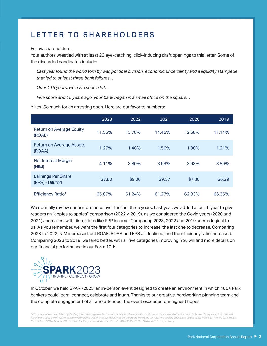 Park National Corporation Annual Report ▶ 3 L E T T E R T O S H A R E H O L D E R S Fellow shareholders, Your authors wrestled with at least 20 eye-catching, click-inducing draft openings to this letter. Some of the discarded candidates include: Last year found the world torn by war, political division, economic uncertainty and a liquidity stampede that led to at least three bank failures… Over 115 years, we have seen a lot… Five score and 15 years ago, your bank began in a small office on the square… Yikes. So much for an arresting open. Here are our favorite numbers: 2023 2022 2021 2020 2019 Return on Average Equity (ROAE) 11.55% 13.78% 14.45% 12.68% 11.14% Return on Average Assets (ROAA) 1.27% 1.48% 1.56% 1.38% 1.21% Net Interest Margin (NIM) 4.11% 3.80% 3.69% 3.93% 3.89% Earnings Per Share (EPS) - Diluted $7.80 $9.06 $9.37 $7.80 $6.29 Efficiency Ratio1 65.87% 61.24% 61.27% 62.83% 66.35% We normally review our performance over the last three years. Last year, we added a fourth year to give readers an “apples to apples” comparison (2022 v. 2019), as we considered the Covid years (2020 and 2021) anomalies, with distortions like PPP income. Comparing 2023, 2022 and 2019 seems logical to us. As you remember, we want the first four categories to increase, the last one to decrease. Comparing 2023 to 2022, NIM increased, but ROAE, ROAA and EPS all declined, and the efficiency ratio increased. Comparing 2023 to 2019, we fared better, with all five categories improving. You will find more details on our financial performance in our Form 10-K. In October, we held SPARK2023, an in-person event designed to create an environment in which 400+ Park bankers could learn, connect, celebrate and laugh. Thanks to our creative, hardworking planning team and the complete engagement of all who attended, the event exceeded our highest hopes. 1 Efficiency ratio is calculated by dividing total other expense by the sum of fully taxable equivalent net interest income and other income. Fully taxable equivalent net interest income includes the effects of taxable equivalent adjustments using a 21% federal corporate income tax rate. The taxable equivalent adjustments were $3.7 million, $3.5 million, $2.9 million, $2.9 million, and $3.0 million for the years ended December 31, 2023, 2022, 2021, 2020 and 2019 respectively.