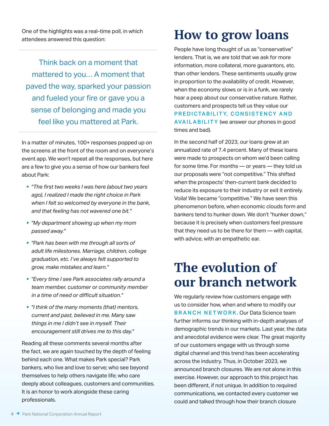 4 ◀ Park National Corporation Annual Report One of the highlights was a real-time poll, in which attendees answered this question: Think back on a moment that mattered to you… A moment that paved the way, sparked your passion and fueled your fire or gave you a sense of belonging and made you feel like you mattered at Park. In a matter of minutes, 100+ responses popped up on the screens at the front of the room and on everyone’s event app. We won’t repeat all the responses, but here are a few to give you a sense of how our bankers feel about Park: • "The first two weeks I was here (about two years ago), I realized I made the right choice in Park when I felt so welcomed by everyone in the bank, and that feeling has not wavered one bit." • "My department showing up when my mom passed away." • "Park has been with me through all sorts of adult life milestones. Marriage, children, college graduation, etc. I’ve always felt supported to grow, make mistakes and learn." • "Every time I see Park associates rally around a team member, customer or community member in a time of need or difficult situation." • "I think of the many moments (that) mentors, current and past, believed in me. Many saw things in me I didn’t see in myself. Their encouragement still drives me to this day." Reading all these comments several months after the fact, we are again touched by the depth of feeling behind each one. What makes Park special? Park bankers, who live and love to serve; who see beyond themselves to help others navigate life; who care deeply about colleagues, customers and communities. It is an honor to work alongside these caring professionals. How to grow loans People have long thought of us as “conservative” lenders. That is, we are told that we ask for more information, more collateral, more guarantors, etc. than other lenders. These sentiments usually grow in proportion to the availability of credit. However, when the economy slows or is in a funk, we rarely hear a peep about our conservative nature. Rather, customers and prospects tell us they value our P R E D I C TA B I L I T Y, C O N S I S T E N C Y A N D AVA I L A B I L I T Y (we answer our phones in good times and bad). In the second half of 2023, our loans grew at an annualized rate of 7.4 percent. Many of these loans were made to prospects on whom we’d been calling for some time. For months — or years — they told us our proposals were “not competitive.” This shifted when the prospects’ then-current bank decided to reduce its exposure to their industry or exit it entirely. Voila! We became “competitive.” We have seen this phenomenon before, when economic clouds form and bankers tend to hunker down. We don’t “hunker down,” because it is precisely when customers feel pressure that they need us to be there for them — with capital, with advice, with an empathetic ear. The evolution of our branch network We regularly review how customers engage with us to consider how, when and where to modify our B R A N C H N E T W O R K . Our Data Science team further informs our thinking with in-depth analyses of demographic trends in our markets. Last year, the data and anecdotal evidence were clear. The great majority of our customers engage with us through some digital channel and this trend has been accelerating across the industry. Thus, in October 2023, we announced branch closures. We are not alone in this exercise. However, our approach to this project has been different, if not unique. In addition to required communications, we contacted every customer we could and talked through how their branch closure
