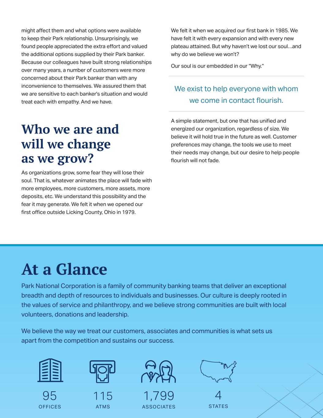 Park National Corporation Annual Report ▶ 5 might affect them and what options were available to keep their Park relationship. Unsurprisingly, we found people appreciated the extra effort and valued the additional options supplied by their Park banker. Because our colleagues have built strong relationships over many years, a number of customers were more concerned about their Park banker than with any inconvenience to themselves. We assured them that we are sensitive to each banker's situation and would treat each with empathy. And we have. Who we are and will we change as we grow? As organizations grow, some fear they will lose their soul. That is, whatever animates the place will fade with more employees, more customers, more assets, more deposits, etc. We understand this possibility and the fear it may generate. We felt it when we opened our first office outside Licking County, Ohio in 1979. We felt it when we acquired our first bank in 1985. We have felt it with every expansion and with every new plateau attained. But why haven’t we lost our soul…and why do we believe we won’t? Our soul is our embedded in our “Why.” We exist to help everyone with whom we come in contact flourish. A simple statement, but one that has unified and energized our organization, regardless of size. We believe it will hold true in the future as well. Customer preferences may change, the tools we use to meet their needs may change, but our desire to help people flourish will not fade. At a Glance Park National Corporation is a family of community banking teams that deliver an exceptional breadth and depth of resources to individuals and businesses. Our culture is deeply rooted in the values of service and philanthropy, and we believe strong communities are built with local volunteers, donations and leadership. We believe the way we treat our customers, associates and communities is what sets us apart from the competition and sustains our success. 95 OFFICES 115 ATMS 1,799 AS SOCIATES 4 STATES