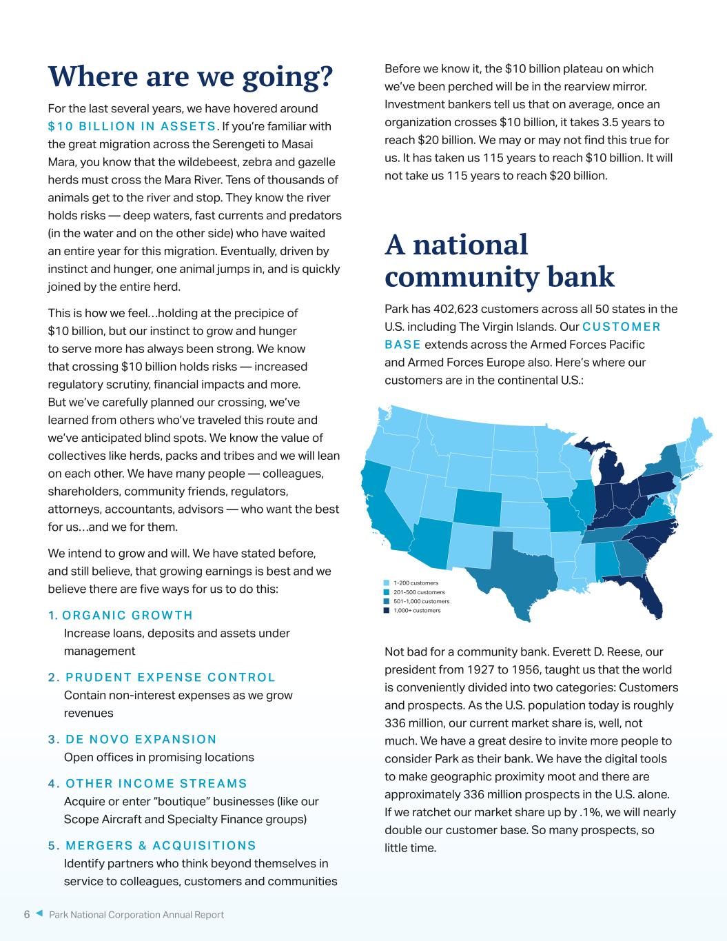 6 ◀ Park National Corporation Annual Report 1-200 customers 201-500 customers 501-1,000 customers 1,000+ customers Where are we going? For the last several years, we have hovered around $ 1 0 B I L L I O N I N A S S E T S . If you’re familiar with the great migration across the Serengeti to Masai Mara, you know that the wildebeest, zebra and gazelle herds must cross the Mara River. Tens of thousands of animals get to the river and stop. They know the river holds risks — deep waters, fast currents and predators (in the water and on the other side) who have waited an entire year for this migration. Eventually, driven by instinct and hunger, one animal jumps in, and is quickly joined by the entire herd. This is how we feel…holding at the precipice of $10 billion, but our instinct to grow and hunger to serve more has always been strong. We know that crossing $10 billion holds risks — increased regulatory scrutiny, financial impacts and more. But we’ve carefully planned our crossing, we’ve learned from others who’ve traveled this route and we’ve anticipated blind spots. We know the value of collectives like herds, packs and tribes and we will lean on each other. We have many people — colleagues, shareholders, community friends, regulators, attorneys, accountants, advisors — who want the best for us…and we for them. We intend to grow and will. We have stated before, and still believe, that growing earnings is best and we believe there are five ways for us to do this: 1. O R G A N I C G R O W T H Increase loans, deposits and assets under management 2 . P R U D E N T E X P E N S E C O N T R O L Contain non-interest expenses as we grow revenues 3 . D E N O V O E X PA N S I O N Open offices in promising locations 4 . O T H E R I N C O M E S T R E A M S Acquire or enter “boutique” businesses (like our Scope Aircraft and Specialty Finance groups) 5 . M E R G E R S & AC Q U I S I T I O N S Identify partners who think beyond themselves in service to colleagues, customers and communities Before we know it, the $10 billion plateau on which we’ve been perched will be in the rearview mirror. Investment bankers tell us that on average, once an organization crosses $10 billion, it takes 3.5 years to reach $20 billion. We may or may not find this true for us. It has taken us 115 years to reach $10 billion. It will not take us 115 years to reach $20 billion. A national community bank Park has 402,623 customers across all 50 states in the U.S. including The Virgin Islands. Our C U S T O M E R B A S E extends across the Armed Forces Pacific and Armed Forces Europe also. Here’s where our customers are in the continental U.S.: Not bad for a community bank. Everett D. Reese, our president from 1927 to 1956, taught us that the world is conveniently divided into two categories: Customers and prospects. As the U.S. population today is roughly 336 million, our current market share is, well, not much. We have a great desire to invite more people to consider Park as their bank. We have the digital tools to make geographic proximity moot and there are approximately 336 million prospects in the U.S. alone. If we ratchet our market share up by .1%, we will nearly double our customer base. So many prospects, so little time.