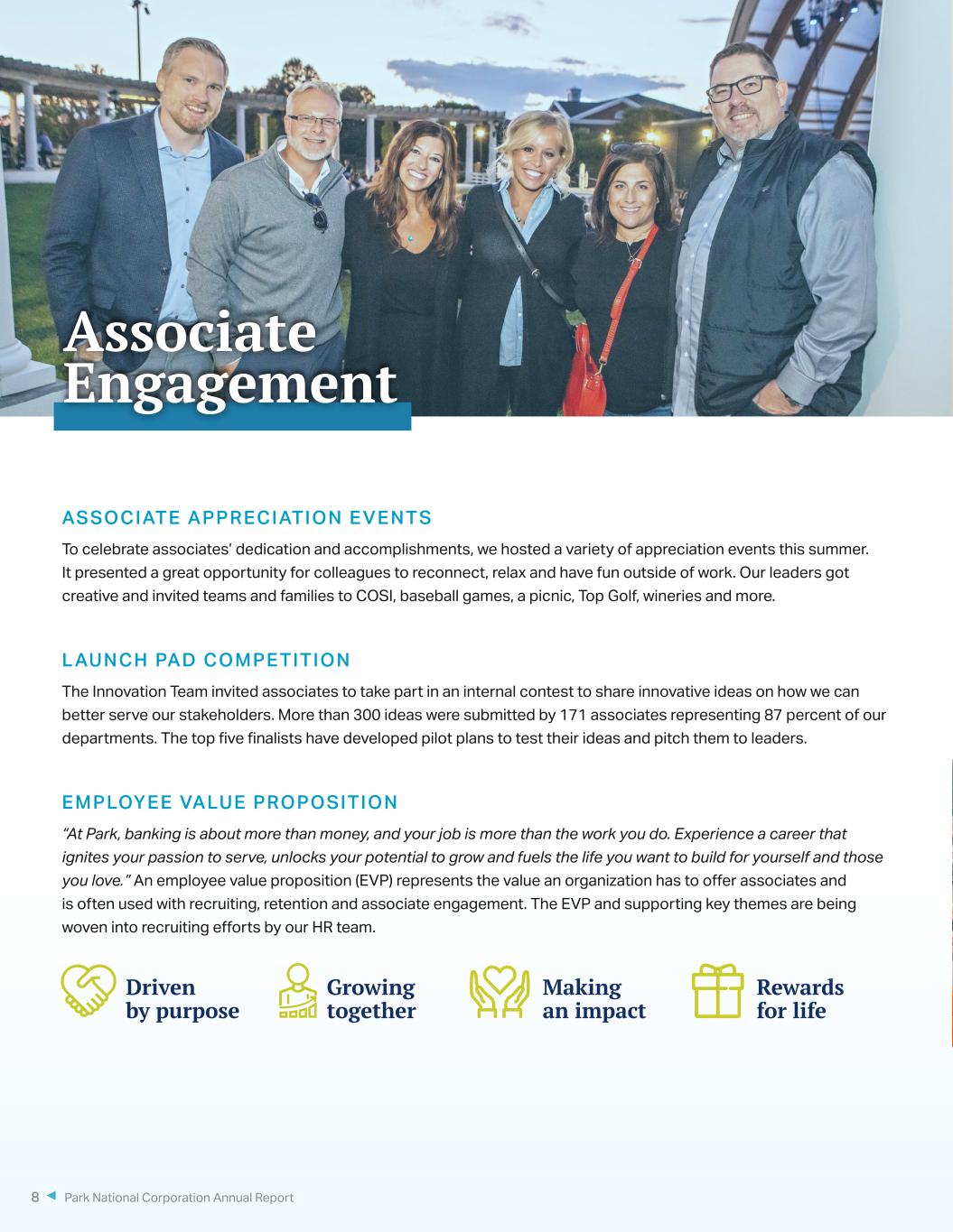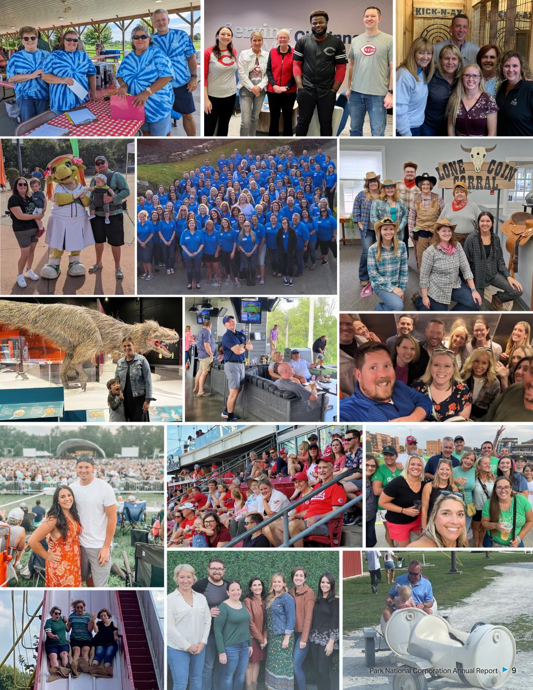 8 ◀ Park National Corporation Annual Report Associate Engagement Driven by purpose I N T E G R I T Y | S E R V I C E | C O M PA S S I O N Helping people is what we’re all about. We call it Serving More, and it’s what drives us. We genuinely care about helping our customers and communities, and we do the right thing, whether that means taking time to listen, seeing the world through someone else’s eyes or doing what’s best for them, not us. It all adds up to work that’s deeply meaningful and so much more than just a job. Growing together P R O F E S S I O N A L D E V E LO P M E N T | C A R E E R PAT H WAY S | M E N TO R S H I P Imagine all the right ingredients coming together to help you grow and thrive – a culture that puts compassion before competition, a safe space to share your ideas, freedom to own your journey and genuine support from leaders who want to see you succeed. How far will your talent, ambition and passion take you? Making an impact V O L U N T E E R I S M | P H I L A N T H R O P Y | L E A D E R S H I P When you bring together amazing people, they do amazing things. Serving on a non-profit board or digging in to a hands-on volunteer project, we invite you to roll up your sleeves, pitch in and give back in a way that fits you, because our commitment to our community is more than words. Rewards for life P E N S I O N | H E A LT H & W E L L B E I N G | E M P LOY E R M ATC H | PA I D T I M E O F F There’s more to life than work, and finding the right balance can mean everything. Get flexibility because family comes first, peace of mind that your future is secure, and time off to focus on what matters most… all without sacrificing your big dreams and goals. Investing in you is just one way to show our gratitude. Driven by purpose I N T E G R I T Y | S E R V I C E | C O M PA S S I O N Helping people is what we’re all about. We call it Serving More, and it’s what drives us. We genuinely care about helping our customers and communities, and we do the right thing, whether that means taking time to listen, seeing the world through someone else’s eyes or doing what’s best for them, not us. It all adds up to work that’s deeply meaningful and so much more than just a job. Growing together P R O F E S S I O N A L D E V E LO P M E N T | C A R E E R PAT H WAY S | M E N TO R S H I P Imagine all the right ingredients coming together to help you grow and thrive – a culture that puts compassion before competition, a safe space to share your ideas, freedom to own your journey and genuine support from leaders who want to see you succeed. How far will your talent, ambition and passion take you? Making an impact V O L U N T E E R I S M | P H I L A N T H R O P Y | L E A D E R S H I P When you bring together amazing people, they do amazing things. Serving on a non-profit board or digging in to a hands-on volunteer project, we invite you to roll up your sleeves, pitch in and give back in a way that fits you, because our commitment to our community is more than words. Rewards for life P E N S I O N | H E A LT H & W E L L B E I N G | E M P LOY E R M ATC H | PA I D T I M E O F F There’s more to life than work, and finding the right balance can mean everything. Get flexibility because family comes first, peace of mind that your future is secure, and time off to focus on what matters most… all without sacrificing your big dreams and goals. Investing in you is just one way to show our gratitude. Driven by purpose I N T E G R I T Y | S E R V I C E | C O M PA S S I O N Helping people is what we’re all about. We call it Serving More, and it’s what drives us. We genuinely care about helping our customers and communities, and we do the right thing, whether that means taking time to listen, seeing the world through someone else’s eyes or doing what’s best for them, not us. It all adds up to work that’s deeply meaningful and so much more than just a job. Growing together P R O F E S S I O N A L D E V E LO P M E N T | C A R E E R PAT H WAY S | M E N TO R S H I P Imagine all the right ingredients coming together to help you grow and thrive – a culture that puts compassion before competition, a safe space to share your ideas, freedom to own your journey and genuine support from leaders who want to see you succeed. How far will your talent, ambition and passion take you? Making an impact V O L U N T E E R I S M | P H I L A N T H R O P Y | L E A D E R S H I P When you bring together amazing people, they do amazing things. Serving on a non-profit board or digging in to a hands-on volunteer project, we invite you to roll up your sleeves, pitch in and give back in a way that fits you, because our commitment to our community is more than words. Rewards for life P E N S I O N | H E A LT H & W E L L B E I N G | E M P LOY E R M TC H | PA I D T I M E O F F There’s more to life than work, and finding th right balance can me everything. Get flexibility because family comes first, peace of mind that your future is secure, and time off to focus on what matt rs most… all without sacrificing your big dreams and goals. Investing in you is just one w y to show our gratitude. Driven by purpose I N T E G R I T Y | S E R V I C E | C O M PA S S I O N Helping people is what we’re all about. We call it Serving More, and it’s what drives us. We genuinely care about helping our customers and communities, and we do the right thing, whether that means taking time to listen, seeing the world through someone else’s eyes or doing what’s best for them, not us. It all adds up to work that’s deeply meaningful and so much more than just a job. Growing together P R O F E S S I O N A L D E V E LO P M E N T | C A E E R PAT H WAY S | M E N TO R S H I P Imagine all the right ingredients coming together to help you grow and thrive – a culture that puts compassion before competition, a safe space to share your ideas, freedom to own your journey and genuine support from leaders who want to see 