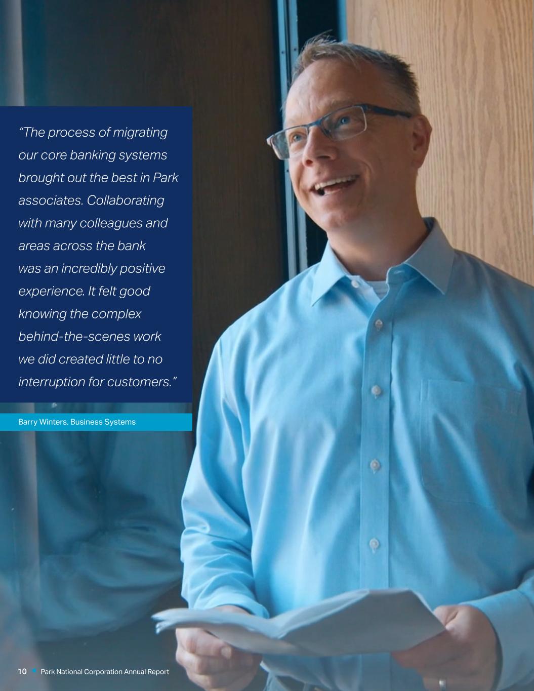 10 ◀ Park National Corporation Annual Report “The process of migrating our core banking systems brought out the best in Park associates. Collaborating with many colleagues and areas across the bank was an incredibly positive experience. It felt good knowing the complex behind-the-scenes work we did created little to no interruption for customers.” Barry Winters, Business Systems