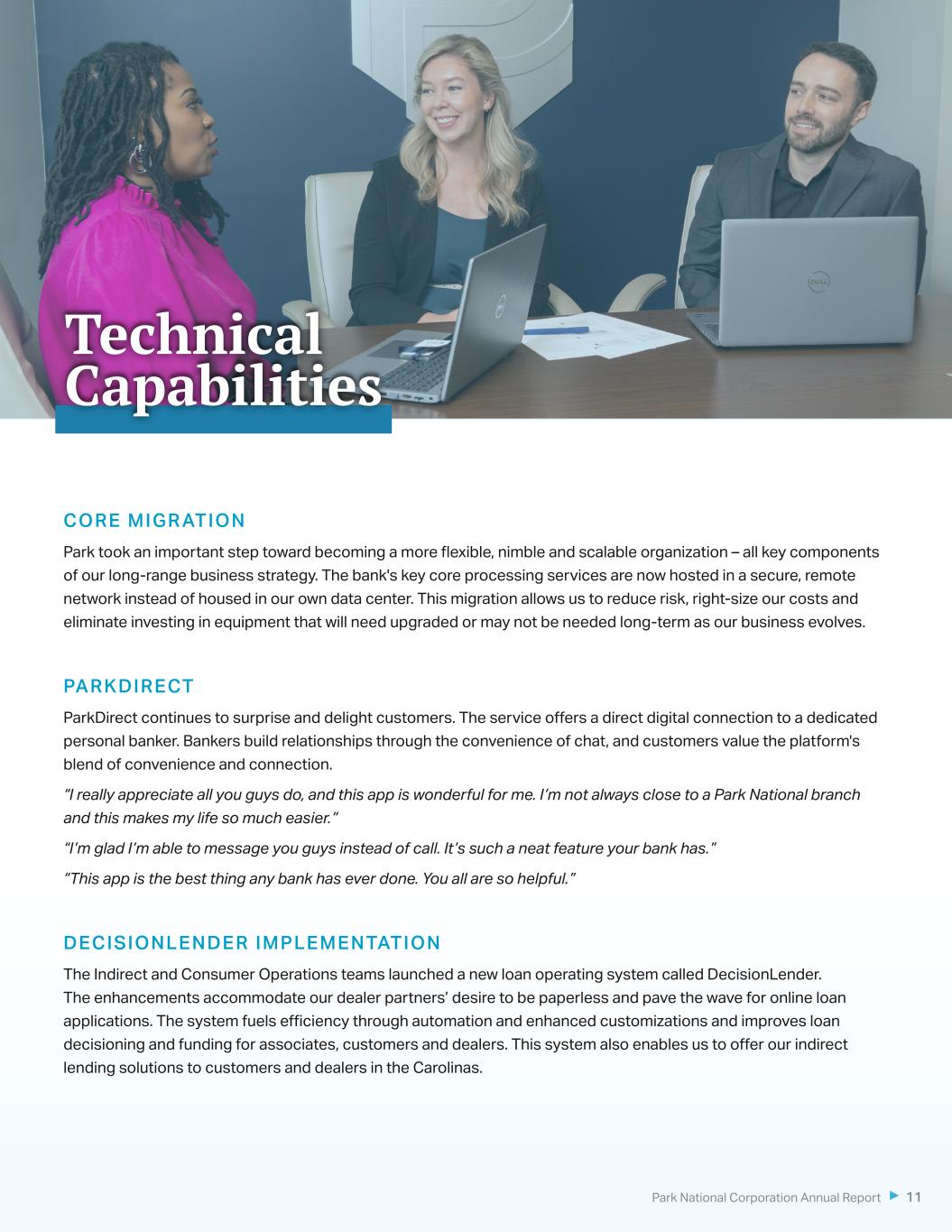 Park National Corporation Annual Report ▶ 11 CORE MIGR ATION Park took an important step toward becoming a more flexible, nimble and scalable organization – all key components of our long-range business strategy. The bank's key core processing services are now hosted in a secure, remote network instead of housed in our own data center. This migration allows us to reduce risk, right-size our costs and eliminate investing in equipment that will need upgraded or may not be needed long-term as our business evolves. PARKDIRECT ParkDirect continues to surprise and delight customers. The service offers a direct digital connection to a dedicated personal banker. Bankers build relationships through the convenience of chat, and customers value the platform's blend of convenience and connection. “I really appreciate all you guys do, and this app is wonderful for me. I’m not always close to a Park National branch and this makes my life so much easier.” “I’m glad I’m able to message you guys instead of call. It’s such a neat feature your bank has.” “This app is the best thing any bank has ever done. You all are so helpful.” DECISIONLENDER IMPLEMENTATION The Indirect and Consumer Operations teams launched a new loan operating system called DecisionLender. The enhancements accommodate our dealer partners’ desire to be paperless and pave the wave for online loan applications. The system fuels efficiency through automation and enhanced customizations and improves loan decisioning and funding for associates, customers and dealers. This system also enables us to offer our indirect lending solutions to customers and dealers in the Carolinas. Technical Capabilities