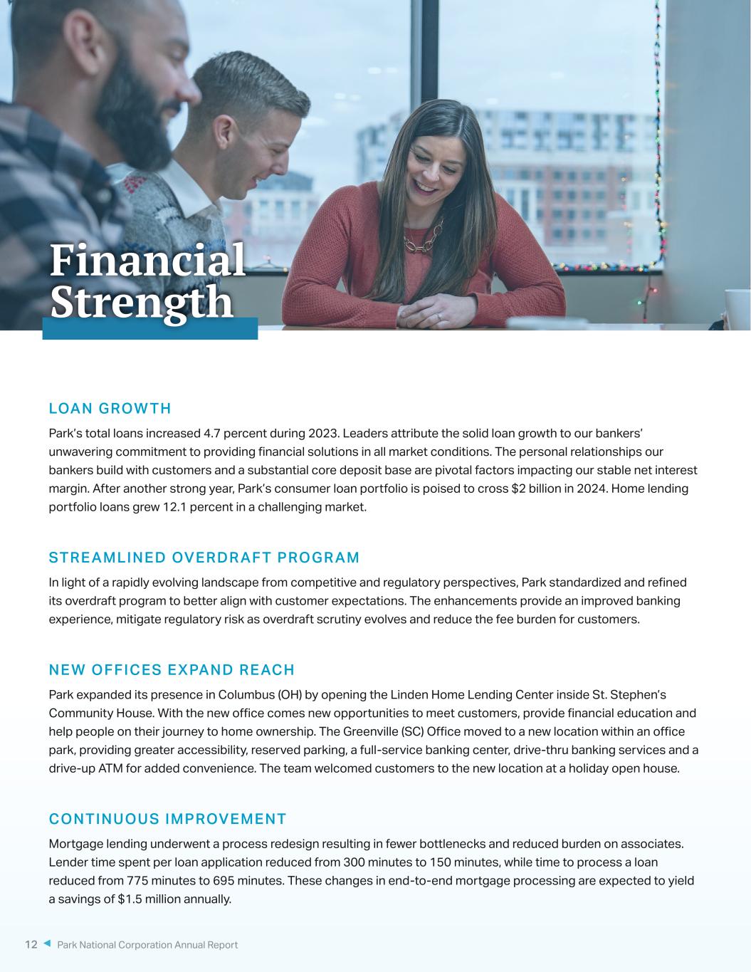 12 ◀ Park National Corporation Annual Report LOAN GROW TH Park’s total loans increased 4.7 percent during 2023. Leaders attribute the solid loan growth to our bankers’ unwavering commitment to providing financial solutions in all market conditions. The personal relationships our bankers build with customers and a substantial core deposit base are pivotal factors impacting our stable net interest margin. After another strong year, Park’s consumer loan portfolio is poised to cross $2 billion in 2024. Home lending portfolio loans grew 12.1 percent in a challenging market. STRE AMLINED OVERDR AFT PROGR AM In light of a rapidly evolving landscape from competitive and regulatory perspectives, Park standardized and refined its overdraft program to better align with customer expectations. The enhancements provide an improved banking experience, mitigate regulatory risk as overdraft scrutiny evolves and reduce the fee burden for customers. NE W OFFICES E XPAND RE ACH Park expanded its presence in Columbus (OH) by opening the Linden Home Lending Center inside St. Stephen’s Community House. With the new office comes new opportunities to meet customers, provide financial education and help people on their journey to home ownership. The Greenville (SC) Office moved to a new location within an office park, providing greater accessibility, reserved parking, a full-service banking center, drive-thru banking services and a drive-up ATM for added convenience. The team welcomed customers to the new location at a holiday open house. CONTINUOUS IMPROVEMENT Mortgage lending underwent a process redesign resulting in fewer bottlenecks and reduced burden on associates. Lender time spent per loan application reduced from 300 minutes to 150 minutes, while time to process a loan reduced from 775 minutes to 695 minutes. These changes in end-to-end mortgage processing are expected to yield a savings of $1.5 million annually. Financial Strength