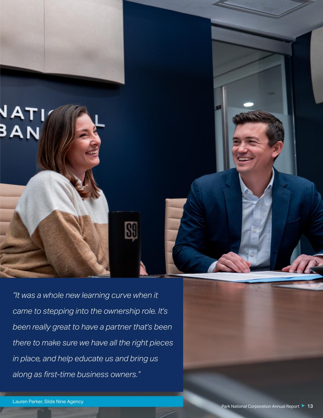 Park National Corporation Annual Report ▶ 13 “It was a whole new learning curve when it came to stepping into the ownership role. It's been really great to have a partner that's been there to make sure we have all the right pieces in place, and help educate us and bring us along as first-time business owners.” Lauren Parker, Slide Nine Agency