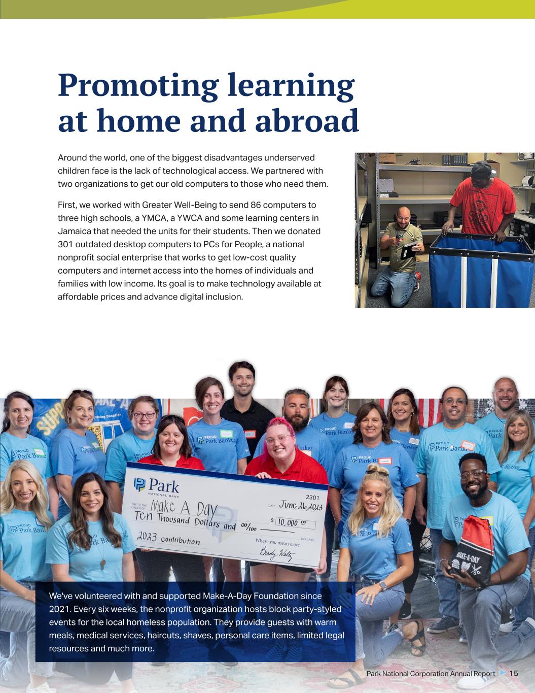 Promoting learning at home and abroad Around the world, one of the biggest disadvantages underserved children face is the lack of technological access. We partnered with two organizations to get our old computers to those who need them. First, we worked with Greater Well-Being to send 86 computers to three high schools, a YMCA, a YWCA and some learning centers in Jamaica that needed the units for their students. Then we donated 301 outdated desktop computers to PCs for People, a national nonprofit social enterprise that works to get low-cost quality computers and internet access into the homes of individuals and families with low income. Its goal is to make technology available at affordable prices and advance digital inclusion. Park National Corporation Annual Report ▶ 15 We've volunteered with and supported Make-A-Day Foundation since 2021. Every six weeks, the nonprofit organization hosts block party-styled events for the local homeless population. They provide guests with warm meals, medical services, haircuts, shaves, personal care items, limited legal resources and much more.