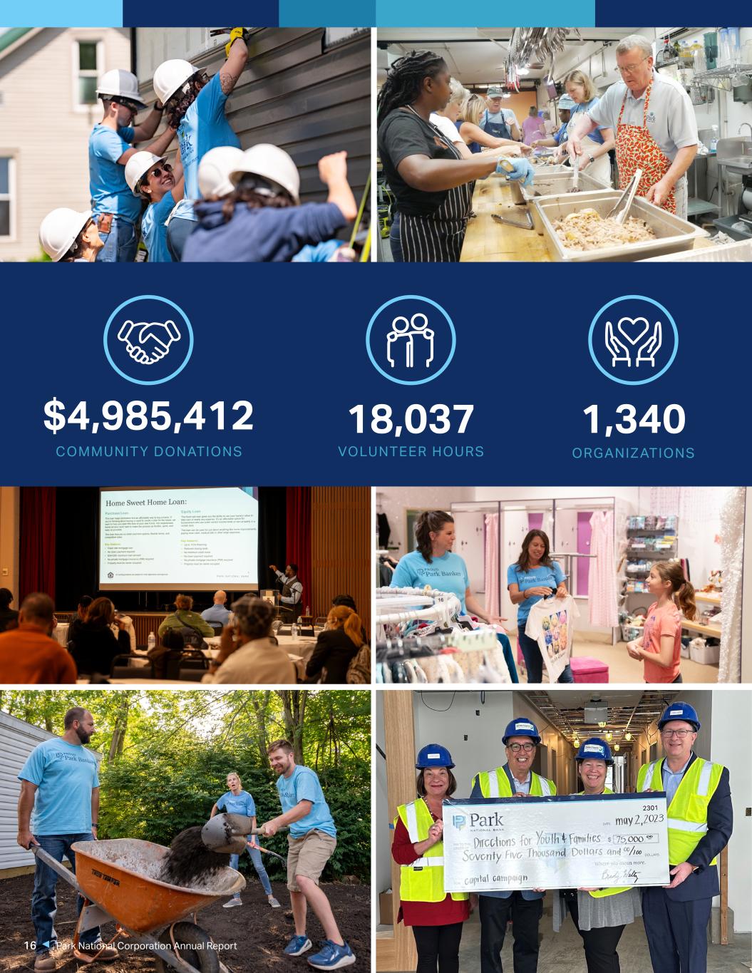 16 ◀ Park National Corporation Annual Report $4,985,412 COMMUNIT Y DONATIONS 18,037 VOLUNTEER HOURS 1,340 ORGANIZ ATIONS
