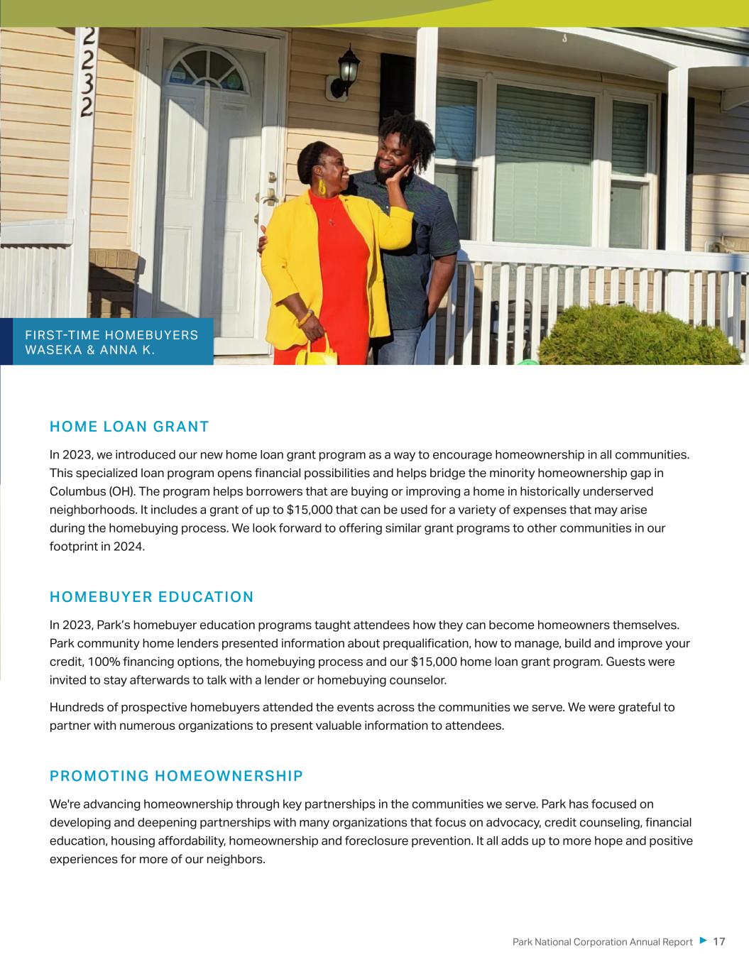 Park National Corporation Annual Report ▶ 17 HOME LOAN GR ANT In 2023, we introduced our new home loan grant program as a way to encourage homeownership in all communities. This specialized loan program opens financial possibilities and helps bridge the minority homeownership gap in Columbus (OH). The program helps borrowers that are buying or improving a home in historically underserved neighborhoods. It includes a grant of up to $15,000 that can be used for a variety of expenses that may arise during the homebuying process. We look forward to offering similar grant programs to other communities in our footprint in 2024. HOMEBUYER EDUCATION In 2023, Park’s homebuyer education programs taught attendees how they can become homeowners themselves. Park community home lenders presented information about prequalification, how to manage, build and improve your credit, 100% financing options, the homebuying process and our $15,000 home loan grant program. Guests were invited to stay afterwards to talk with a lender or homebuying counselor. Hundreds of prospective homebuyers attended the events across the communities we serve. We were grateful to partner with numerous organizations to present valuable information to attendees. PROMOTING HOMEOWNERSHIP We're advancing homeownership through key partnerships in the communities we serve. Park has focused on developing and deepening partnerships with many organizations that focus on advocacy, credit counseling, financial education, housing affordability, homeownership and foreclosure prevention. It all adds up to more hope and positive experiences for more of our neighbors. FIRST-TIME HOMEBUYERS WASEK A & ANNA K .