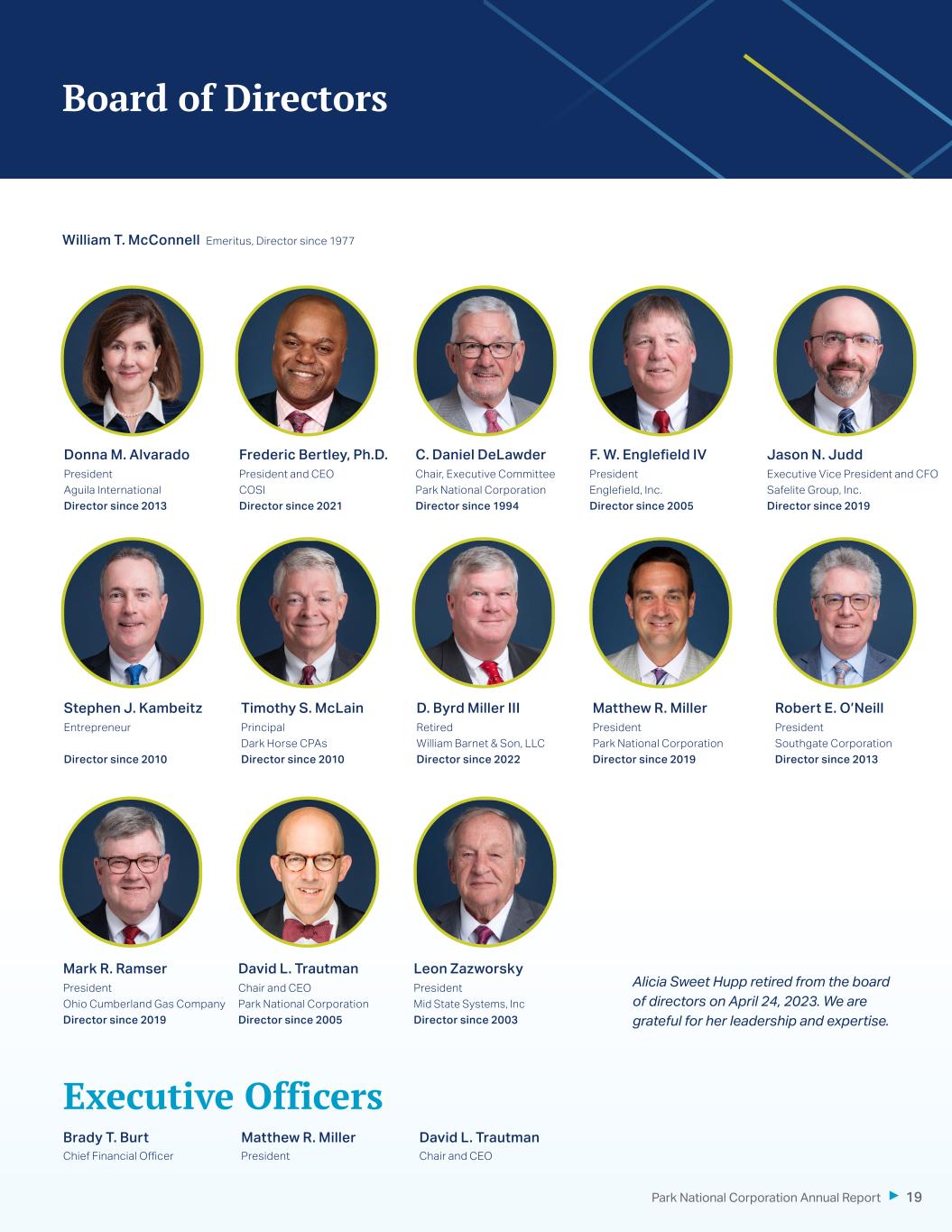 Park National Corporation Annual Report ▶ 19 Donna M. Alvarado Frederic Bertley, Ph.D. C. Daniel DeLawder F. W. Englefield IV Jason N. Judd President President and CEO Chair, Executive Committee President Executive Vice President and CFO Aguila International COSI Park National Corporation Englefield, Inc. Safelite Group, Inc. Director since 2013 Director since 2021 Director since 1994 Director since 2005 Director since 2019 Mark R. Ramser David L. Trautman Leon Zazworsky President Chair and CEO President Ohio Cumberland Gas Company Park National Corporation Mid State Systems, Inc Director since 2019 Director since 2005 Director since 2003 Stephen J. Kambeitz Timothy S. McLain D. Byrd Miller III Matthew R. Miller Robert E. O’Neill Entrepreneur Principal Retired President President Dark Horse CPAs William Barnet & Son, LLC Park National Corporation Southgate Corporation Director since 2010 Director since 2010 Director since 2022 Director since 2019 Director since 2013 Executive Officers Brady T. Burt Matthew R. Miller David L. Trautman Chief Financial Officer President Chair and CEO Board of Directors William T. McConnell Emeritus, Director since 1977 Alicia Sweet Hupp retired from the board of directors on April 24, 2023. We are grateful for her leadership and expertise.