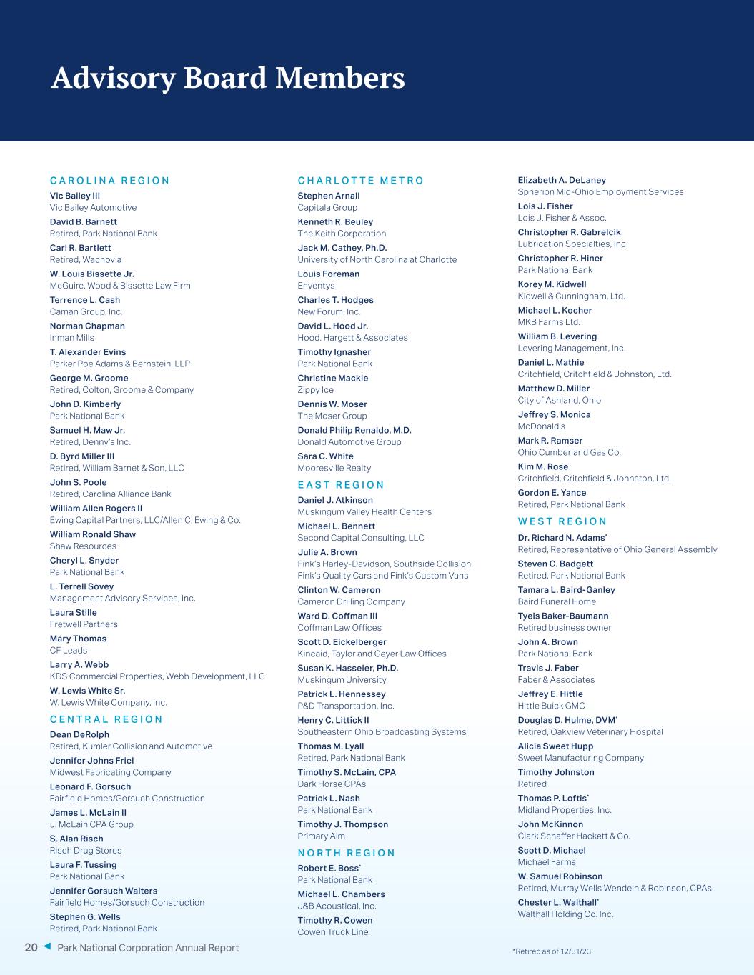 20 ◀ Park National Corporation Annual Report Advisory Board Members C A R O L I N A R E G I O N Vic Bailey III Vic Bailey Automotive David B. Barnett Retired, Park National Bank Carl R. Bartlett Retired, Wachovia W. Louis Bissette Jr. McGuire, Wood & Bissette Law Firm Terrence L. Cash Caman Group, Inc. Norman Chapman Inman Mills T. Alexander Evins Parker Poe Adams & Bernstein, LLP George M. Groome Retired, Colton, Groome & Company John D. Kimberly Park National Bank Samuel H. Maw Jr. Retired, Denny’s Inc. D. Byrd Miller III Retired, William Barnet & Son, LLC John S. Poole Retired, Carolina Alliance Bank William Allen Rogers II Ewing Capital Partners, LLC/Allen C. Ewing & Co. William Ronald Shaw Shaw Resources Cheryl L. Snyder Park National Bank L. Terrell Sovey Management Advisory Services, Inc. Laura Stille Fretwell Partners Mary Thomas CF Leads Larry A. Webb KDS Commercial Properties, Webb Development, LLC W. Lewis White Sr. W. Lewis White Company, Inc. C E N T R A L R E G I O N Dean DeRolph Retired, Kumler Collision and Automotive Jennifer Johns Friel Midwest Fabricating Company Leonard F. Gorsuch Fairfield Homes/Gorsuch Construction James L. McLain II J. McLain CPA Group S. Alan Risch Risch Drug Stores Laura F. Tussing Park National Bank Jennifer Gorsuch Walters Fairfield Homes/Gorsuch Construction Stephen G. Wells Retired, Park National Bank C H A R L O T T E M E T R O Stephen Arnall Capitala Group Kenneth R. Beuley The Keith Corporation Jack M. Cathey, Ph.D. University of North Carolina at Charlotte Louis Foreman Enventys Charles T. Hodges New Forum, Inc. David L. Hood Jr. Hood, Hargett & Associates Timothy Ignasher Park National Bank Christine Mackie Zippy Ice Dennis W. Moser The Moser Group Donald Philip Renaldo, M.D. Donald Automotive Group Sara C. White Mooresville Realty E A S T R E G I O N Daniel J. Atkinson Muskingum Valley Health Centers Michael L. Bennett Second Capital Consulting, LLC Julie A. Brown Fink’s Harley-Davidson, Southside Collision, Fink’s Quality Cars and Fink’s Custom Vans Clinton W. Cameron Cameron Drilling Company Ward D. Coffman III Coffman Law Offices Scott D. Eickelberger Kincaid, Taylor and Geyer Law Offices Susan K. Hasseler, Ph.D. Muskingum University Patrick L. Hennessey P&D Transportation, Inc. Henry C. Littick II Southeastern Ohio Broadcasting Systems Thomas M. Lyall Retired, Park National Bank Timothy S. McLain, CPA Dark Horse CPAs Patrick L. Nash Park National Bank Timothy J. Thompson Primary Aim N O R T H R E G I O N Robert E. Boss* Park National Bank Michael L. Chambers J&B Acoustical, Inc. Timothy R. Cowen Cowen Truck Line Elizabeth A. DeLaney Spherion Mid-Ohio Employment Services Lois J. Fisher Lois J. Fisher & Assoc. Christopher R. Gabrelcik Lubrication Specialties, Inc. Christopher R. Hiner Park National Bank Korey M. Kidwell Kidwell & Cunningham, Ltd. Michael L. Kocher MKB Farms Ltd. William B. Levering Levering Management, Inc. Daniel L. Mathie Critchfield, Critchfield & Johnston, Ltd. Matthew D. Miller City of Ashland, Ohio Jeffrey S. Monica McDonald’s Mark R. Ramser Ohio Cumberland Gas Co. Kim M. Rose Critchfield, Critchfield & Johnston, Ltd. Gordon E. Yance Retired, Park National Bank W E S T R E G I O N Dr. Richard N. Adams* Retired, Representative of Ohio General Assembly Steven C. Badgett Retired, Park National Bank Tamara L. Baird-Ganley Baird Funeral Home Tyeis Baker-Baumann Retired business owner John A. Brown Park National Bank Travis J. Faber Faber & Associates Jeffrey E. Hittle Hittle Buick GMC Douglas D. Hulme, DVM* Retired, Oakview Veterinary Hospital Alicia Sweet Hupp Sweet Manufacturing Company Timothy Johnston Retired Thomas P. Loftis* Midland Properties, Inc. John McKinnon Clark Schaffer Hackett & Co. Scott D. Michael Michael Farms W. Samuel Robinson Retired, Murray Wells Wendeln & Robinson, CPAs Chester L. Walthall* Walthall Holding Co. Inc. *Retired as of 12/31/23