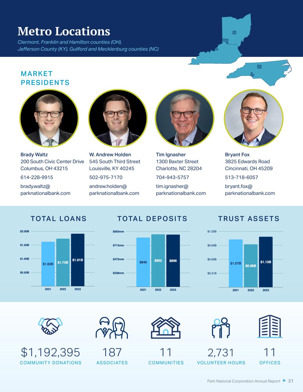 Park National Corporation Annual Report ▶ 21 Brady Waltz 200 South Civic Center Drive Columbus, OH 43215 614-228-9915 brady.waltz@ parknationalbank.com Metro Locations Clermont, Franklin and Hamilton counties (OH), Jefferson County (KY), Guilford and Mecklenburg counties (NC) W. Andrew Holden 545 South Third Street Louisville, KY 40245 502-975-7170 andrew.holden@ parknationalbank.com Tim Ignasher 1300 Baxter Street Charlotte, NC 28204 704-943-5757 tim.ignasher@ parknationalbank.com Bryant Fox 3825 Edwards Road Cincinnati, OH 45209 513-718-6057 bryant.fox@ parknationalbank.com $1,192,395 COMMUNIT Y DONATIONS 187 AS SOCIATES 11 COMMUNITIES 11 OFFICES TOTA L LOA N S TOTA L D E P O S I T S T R U S T A S S E T S MARKET PRESIDENTS 2,731 VOLUNTEER HOURS