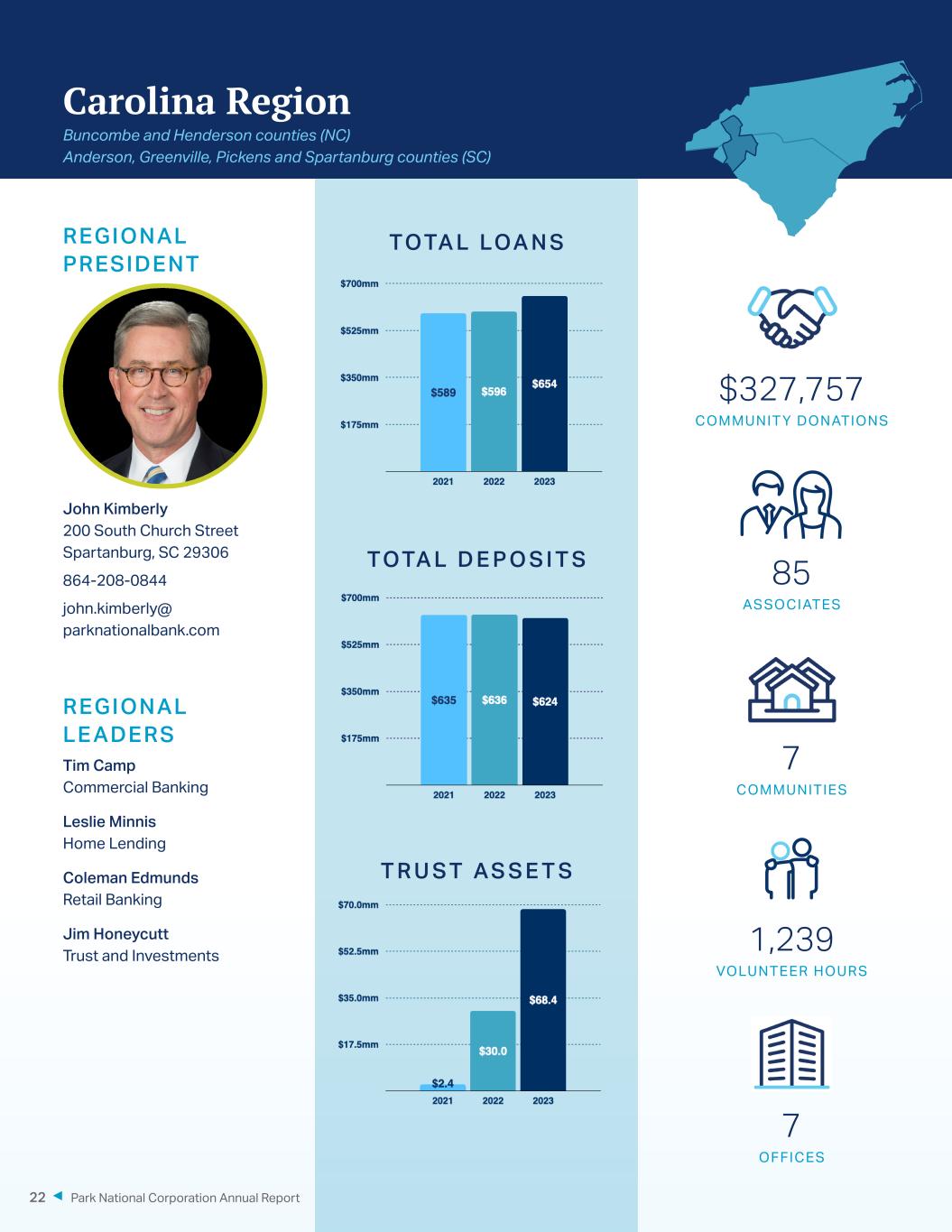22 ◀ Park National Corporation Annual Report REGIONAL PRESIDENT John Kimberly 200 South Church Street Spartanburg, SC 29306 864-208-0844 john.kimberly@ parknationalbank.com REGIONAL LE ADERS Tim Camp Commercial Banking Leslie Minnis Home Lending Coleman Edmunds Retail Banking Jim Honeycutt Trust and Investments $327,757 COMMUNIT Y DONATIONS 85 AS SOCIATES 7 COMMUNITIES 7 OFFICES Carolina Region Buncombe and Henderson counties (NC) Anderson, Greenville, Pickens and Spartanburg counties (SC) TOTA L LOA N S TOTA L D E P O S I T S T R U S T A S S E T S 1,239 VOLUNTEER HOURS