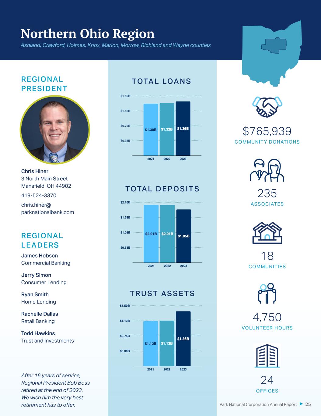 Park National Corporation Annual Report ▶ 25 REGIONAL PRESIDENT Chris Hiner 3 North Main Street Mansfield, OH 44902 419-524-3370 chris.hiner@ parknationalbank.com REGIONAL LE ADERS James Hobson Commercial Banking Jerry Simon Consumer Lending Ryan Smith Home Lending Rachelle Dallas Retail Banking Todd Hawkins Trust and Investments $765,939 COMMUNIT Y DONATIONS 235 AS SOCIATES 18 COMMUNITIES 24 OFFICES Northern Ohio Region Ashland, Crawford, Holmes, Knox, Marion, Morrow, Richland and Wayne counties TOTA L LOA N S TOTA L D E P O S I T S T R U S T A S S E T S 4,750 VOLUNTEER HOURS After 16 years of service, Regional President Bob Boss retired at the end of 2023. We wish him the very best retirement has to offer.