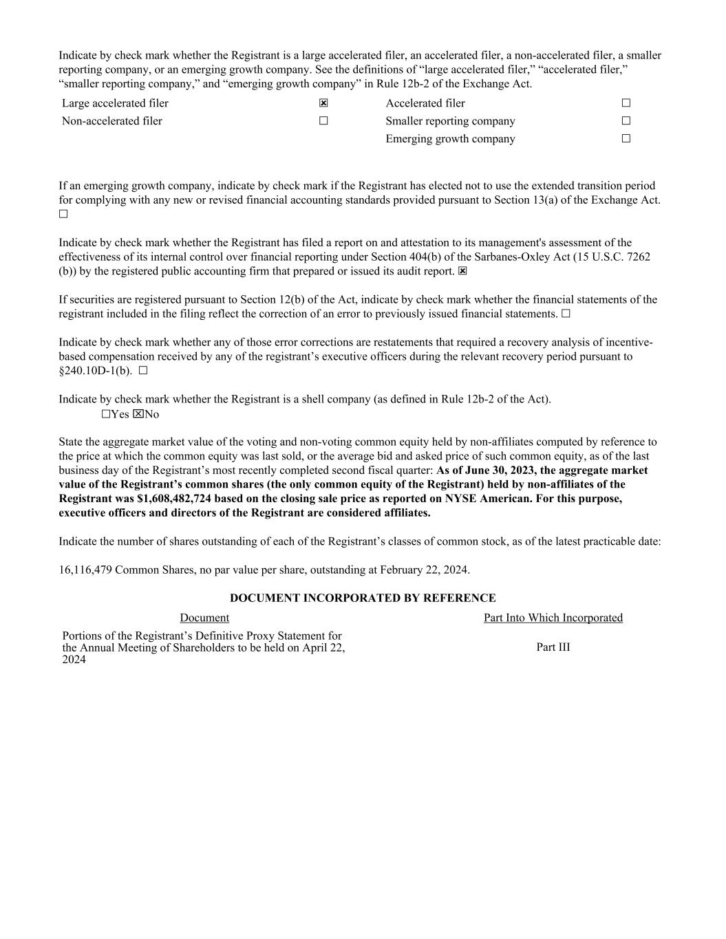 Indicate by check mark whether the Registrant is a large accelerated filer, an accelerated filer, a non-accelerated filer, a smaller reporting company, or an emerging growth company. See the definitions of “large accelerated filer,” “accelerated filer,” “smaller reporting company,” and “emerging growth company” in Rule 12b-2 of the Exchange Act. Large accelerated filer ☒ Accelerated filer ☐ Non-accelerated filer ☐ Smaller reporting company ☐ Emerging growth company ☐ If an emerging growth company, indicate by check mark if the Registrant has elected not to use the extended transition period for complying with any new or revised financial accounting standards provided pursuant to Section 13(a) of the Exchange Act. ☐ Indicate by check mark whether the Registrant has filed a report on and attestation to its management's assessment of the effectiveness of its internal control over financial reporting under Section 404(b) of the Sarbanes-Oxley Act (15 U.S.C. 7262 (b)) by the registered public accounting firm that prepared or issued its audit report. ☒ If securities are registered pursuant to Section 12(b) of the Act, indicate by check mark whether the financial statements of the registrant included in the filing reflect the correction of an error to previously issued financial statements. ☐ Indicate by check mark whether any of those error corrections are restatements that required a recovery analysis of incentive- based compensation received by any of the registrant’s executive officers during the relevant recovery period pursuant to §240.10D-1(b). ☐ Indicate by check mark whether the Registrant is a shell company (as defined in Rule 12b-2 of the Act). ☐Yes xNo State the aggregate market value of the voting and non-voting common equity held by non-affiliates computed by reference to the price at which the common equity was last sold, or the average bid and asked price of such common equity, as of the last business day of the Registrant’s most recently completed second fiscal quarter: As of June 30, 2023, the aggregate market value of the Registrant’s common shares (the only common equity of the Registrant) held by non-affiliates of the Registrant was $1,608,482,724 based on the closing sale price as reported on NYSE American. For this purpose, executive officers and directors of the Registrant are considered affiliates. Indicate the number of shares outstanding of each of the Registrant’s classes of common stock, as of the latest practicable date: 16,116,479 Common Shares, no par value per share, outstanding at February 22, 2024. DOCUMENT INCORPORATED BY REFERENCE Document Part Into Which Incorporated Portions of the Registrant’s Definitive Proxy Statement for the Annual Meeting of Shareholders to be held on April 22, 2024 Part III