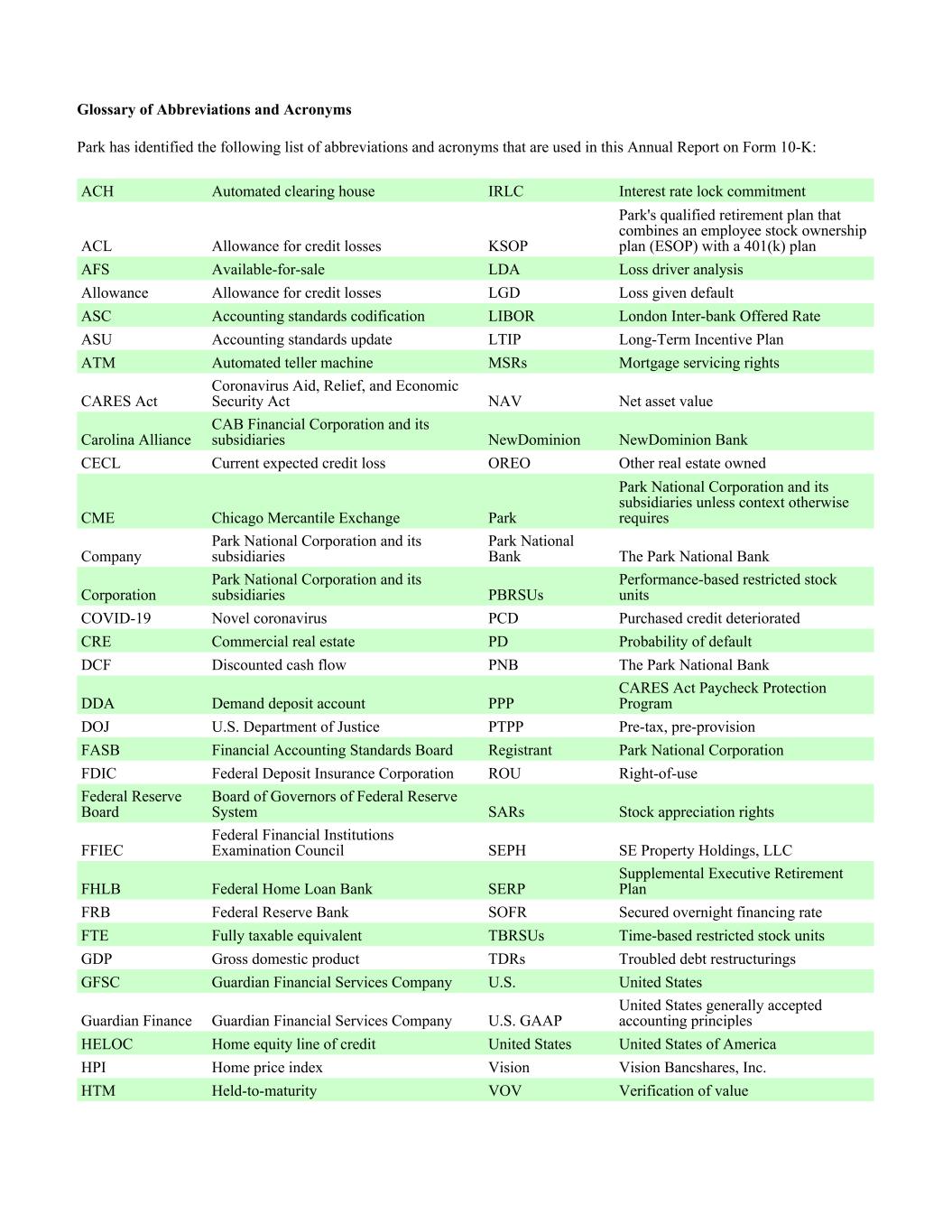 Glossary of Abbreviations and Acronyms Park has identified the following list of abbreviations and acronyms that are used in this Annual Report on Form 10-K: ACH Automated clearing house IRLC Interest rate lock commitment ACL Allowance for credit losses KSOP Park's qualified retirement plan that combines an employee stock ownership plan (ESOP) with a 401(k) plan AFS Available-for-sale LDA Loss driver analysis Allowance Allowance for credit losses LGD Loss given default ASC Accounting standards codification LIBOR London Inter-bank Offered Rate ASU Accounting standards update LTIP Long-Term Incentive Plan ATM Automated teller machine MSRs Mortgage servicing rights CARES Act Coronavirus Aid, Relief, and Economic Security Act NAV Net asset value Carolina Alliance CAB Financial Corporation and its subsidiaries NewDominion NewDominion Bank CECL Current expected credit loss OREO Other real estate owned CME Chicago Mercantile Exchange Park Park National Corporation and its subsidiaries unless context otherwise requires Company Park National Corporation and its subsidiaries Park National Bank The Park National Bank Corporation Park National Corporation and its subsidiaries PBRSUs Performance-based restricted stock units COVID-19 Novel coronavirus PCD Purchased credit deteriorated CRE Commercial real estate PD Probability of default DCF Discounted cash flow PNB The Park National Bank DDA Demand deposit account PPP CARES Act Paycheck Protection Program DOJ U.S. Department of Justice PTPP Pre-tax, pre-provision FASB Financial Accounting Standards Board Registrant Park National Corporation FDIC Federal Deposit Insurance Corporation ROU Right-of-use Federal Reserve Board Board of Governors of Federal Reserve System SARs Stock appreciation rights FFIEC Federal Financial Institutions Examination Council SEPH SE Property Holdings, LLC FHLB Federal Home Loan Bank SERP Supplemental Executive Retirement Plan FRB Federal Reserve Bank SOFR Secured overnight financing rate FTE Fully taxable equivalent TBRSUs Time-based restricted stock units GDP Gross domestic product TDRs Troubled debt restructurings GFSC Guardian Financial Services Company U.S. United States Guardian Finance Guardian Financial Services Company U.S. GAAP United States generally accepted accounting principles HELOC Home equity line of credit United States United States of America HPI Home price index Vision Vision Bancshares, Inc. HTM Held-to-maturity VOV Verification of value