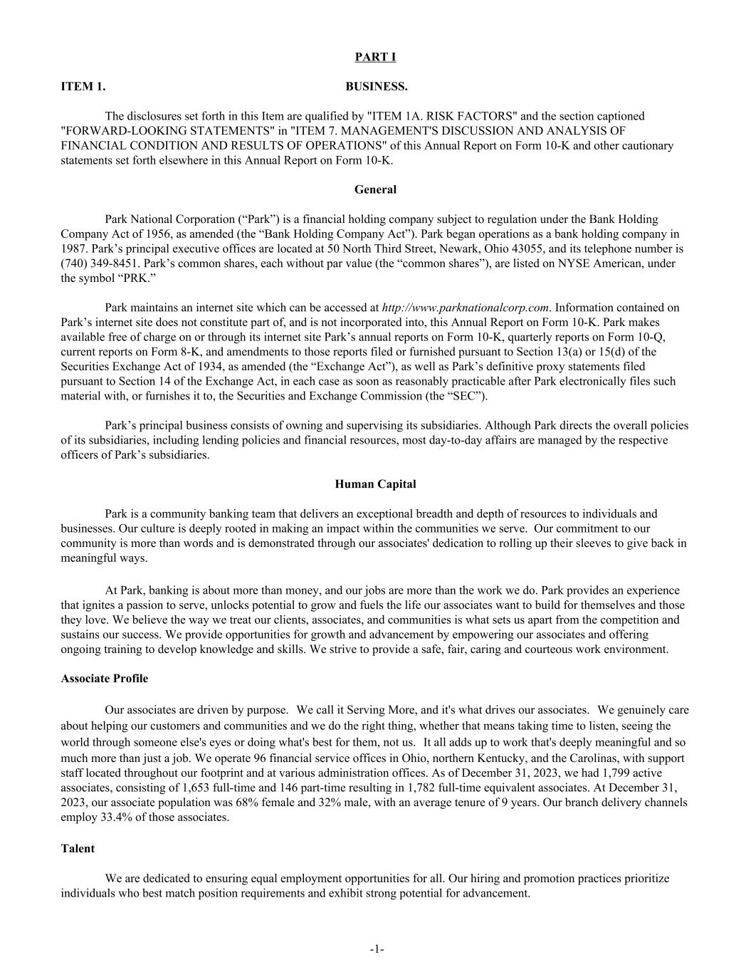 PART I ITEM 1. BUSINESS. The disclosures set forth in this Item are qualified by "ITEM 1A. RISK FACTORS" and the section captioned "FORWARD-LOOKING STATEMENTS" in "ITEM 7. MANAGEMENT'S DISCUSSION AND ANALYSIS OF FINANCIAL CONDITION AND RESULTS OF OPERATIONS" of this Annual Report on Form 10-K and other cautionary statements set forth elsewhere in this Annual Report on Form 10-K. General Park National Corporation (“Park”) is a financial holding company subject to regulation under the Bank Holding Company Act of 1956, as amended (the “Bank Holding Company Act”). Park began operations as a bank holding company in 1987. Park’s principal executive offices are located at 50 North Third Street, Newark, Ohio 43055, and its telephone number is (740) 349-8451. Park’s common shares, each without par value (the “common shares”), are listed on NYSE American, under the symbol “PRK.” Park maintains an internet site which can be accessed at http://www.parknationalcorp.com. Information contained on Park’s internet site does not constitute part of, and is not incorporated into, this Annual Report on Form 10-K. Park makes available free of charge on or through its internet site Park’s annual reports on Form 10-K, quarterly reports on Form 10-Q, current reports on Form 8-K, and amendments to those reports filed or furnished pursuant to Section 13(a) or 15(d) of the Securities Exchange Act of 1934, as amended (the “Exchange Act”), as well as Park’s definitive proxy statements filed pursuant to Section 14 of the Exchange Act, in each case as soon as reasonably practicable after Park electronically files such material with, or furnishes it to, the Securities and Exchange Commission (the “SEC”). Park’s principal business consists of owning and supervising its subsidiaries. Although Park directs the overall policies of its subsidiaries, including lending policies and financial resources, most day-to-day affairs are managed by the respective officers of Park’s subsidiaries. Human Capital Park is a community banking team that delivers an exceptional breadth and depth of resources to individuals and businesses. Our culture is deeply rooted in making an impact within the communities we serve. Our commitment to our community is more than words and is demonstrated through our associates' dedication to rolling up their sleeves to give back in meaningful ways. At Park, banking is about more than money, and our jobs are more than the work we do. Park provides an experience that ignites a passion to serve, unlocks potential to grow and fuels the life our associates want to build for themselves and those they love. We believe the way we treat our clients, associates, and communities is what sets us apart from the competition and sustains our success. We provide opportunities for growth and advancement by empowering our associates and offering ongoing training to develop knowledge and skills. We strive to provide a safe, fair, caring and courteous work environment. Associate Profile Our associates are driven by purpose. We call it Serving More, and it's what drives our associates. We genuinely care about helping our customers and communities and we do the right thing, whether that means taking time to listen, seeing the world through someone else's eyes or doing what's best for them, not us. It all adds up to work that's deeply meaningful and so much more than just a job. We operate 96 financial service offices in Ohio, northern Kentucky, and the Carolinas, with support staff located throughout our footprint and at various administration offices. As of December 31, 2023, we had 1,799 active associates, consisting of 1,653 full-time and 146 part-time resulting in 1,782 full-time equivalent associates. At December 31, 2023, our associate population was 68% female and 32% male, with an average tenure of 9 years. Our branch delivery channels employ 33.4% of those associates. Talent We are dedicated to ensuring equal employment opportunities for all. Our hiring and promotion practices prioritize individuals who best match position requirements and exhibit strong potential for advancement. -1-