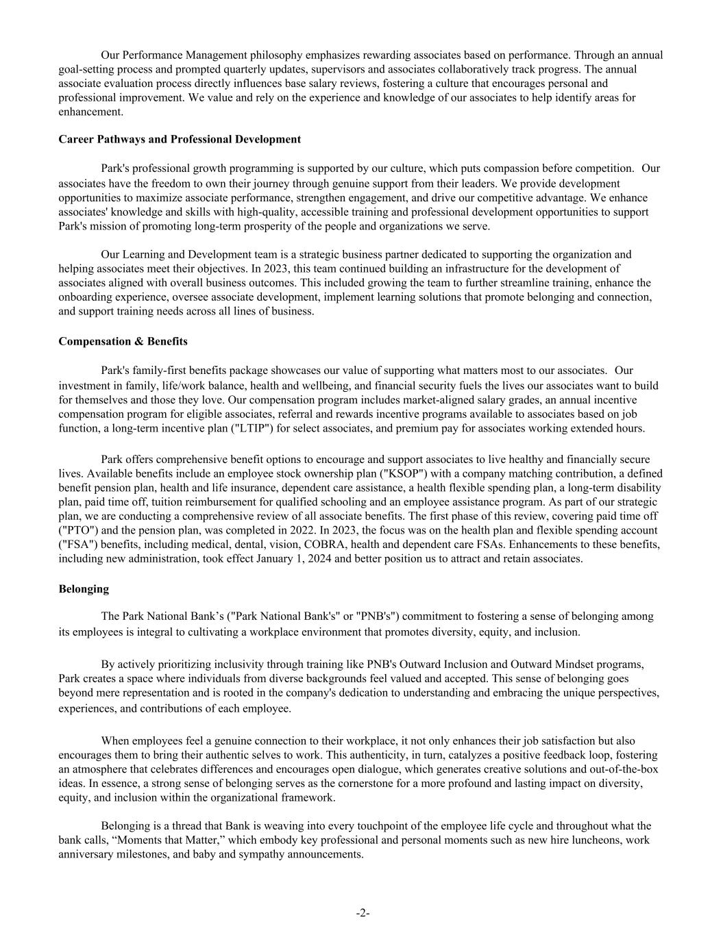 Our Performance Management philosophy emphasizes rewarding associates based on performance. Through an annual goal-setting process and prompted quarterly updates, supervisors and associates collaboratively track progress. The annual associate evaluation process directly influences base salary reviews, fostering a culture that encourages personal and professional improvement. We value and rely on the experience and knowledge of our associates to help identify areas for enhancement. Career Pathways and Professional Development Park's professional growth programming is supported by our culture, which puts compassion before competition. Our associates have the freedom to own their journey through genuine support from their leaders. We provide development opportunities to maximize associate performance, strengthen engagement, and drive our competitive advantage. We enhance associates' knowledge and skills with high-quality, accessible training and professional development opportunities to support Park's mission of promoting long-term prosperity of the people and organizations we serve. Our Learning and Development team is a strategic business partner dedicated to supporting the organization and helping associates meet their objectives. In 2023, this team continued building an infrastructure for the development of associates aligned with overall business outcomes. This included growing the team to further streamline training, enhance the onboarding experience, oversee associate development, implement learning solutions that promote belonging and connection, and support training needs across all lines of business. Compensation & Benefits Park's family-first benefits package showcases our value of supporting what matters most to our associates. Our investment in family, life/work balance, health and wellbeing, and financial security fuels the lives our associates want to build for themselves and those they love. Our compensation program includes market-aligned salary grades, an annual incentive compensation program for eligible associates, referral and rewards incentive programs available to associates based on job function, a long-term incentive plan ("LTIP") for select associates, and premium pay for associates working extended hours. Park offers comprehensive benefit options to encourage and support associates to live healthy and financially secure lives. Available benefits include an employee stock ownership plan ("KSOP") with a company matching contribution, a defined benefit pension plan, health and life insurance, dependent care assistance, a health flexible spending plan, a long-term disability plan, paid time off, tuition reimbursement for qualified schooling and an employee assistance program. As part of our strategic plan, we are conducting a comprehensive review of all associate benefits. The first phase of this review, covering paid time off ("PTO") and the pension plan, was completed in 2022. In 2023, the focus was on the health plan and flexible spending account ("FSA") benefits, including medical, dental, vision, COBRA, health and dependent care FSAs. Enhancements to these benefits, including new administration, took effect January 1, 2024 and better position us to attract and retain associates. Belonging The Park National Bank’s ("Park National Bank's" or "PNB's") commitment to fostering a sense of belonging among its employees is integral to cultivating a workplace environment that promotes diversity, equity, and inclusion. By actively prioritizing inclusivity through training like PNB's Outward Inclusion and Outward Mindset programs, Park creates a space where individuals from diverse backgrounds feel valued and accepted. This sense of belonging goes beyond mere representation and is rooted in the company's dedication to understanding and embracing the unique perspectives, experiences, and contributions of each employee. When employees feel a genuine connection to their workplace, it not only enhances their job satisfaction but also encourages them to bring their authentic selves to work. This authenticity, in turn, catalyzes a positive feedback loop, fostering an atmosphere that celebrates differences and encourages open dialogue, which generates creative solutions and out-of-the-box ideas. In essence, a strong sense of belonging serves as the cornerstone for a more profound and lasting impact on diversity, equity, and inclusion within the organizational framework. Belonging is a thread that Bank is weaving into every touchpoint of the employee life cycle and throughout what the bank calls, “Moments that Matter,” which embody key professional and personal moments such as new hire luncheons, work anniversary milestones, and baby and sympathy announcements. -2-