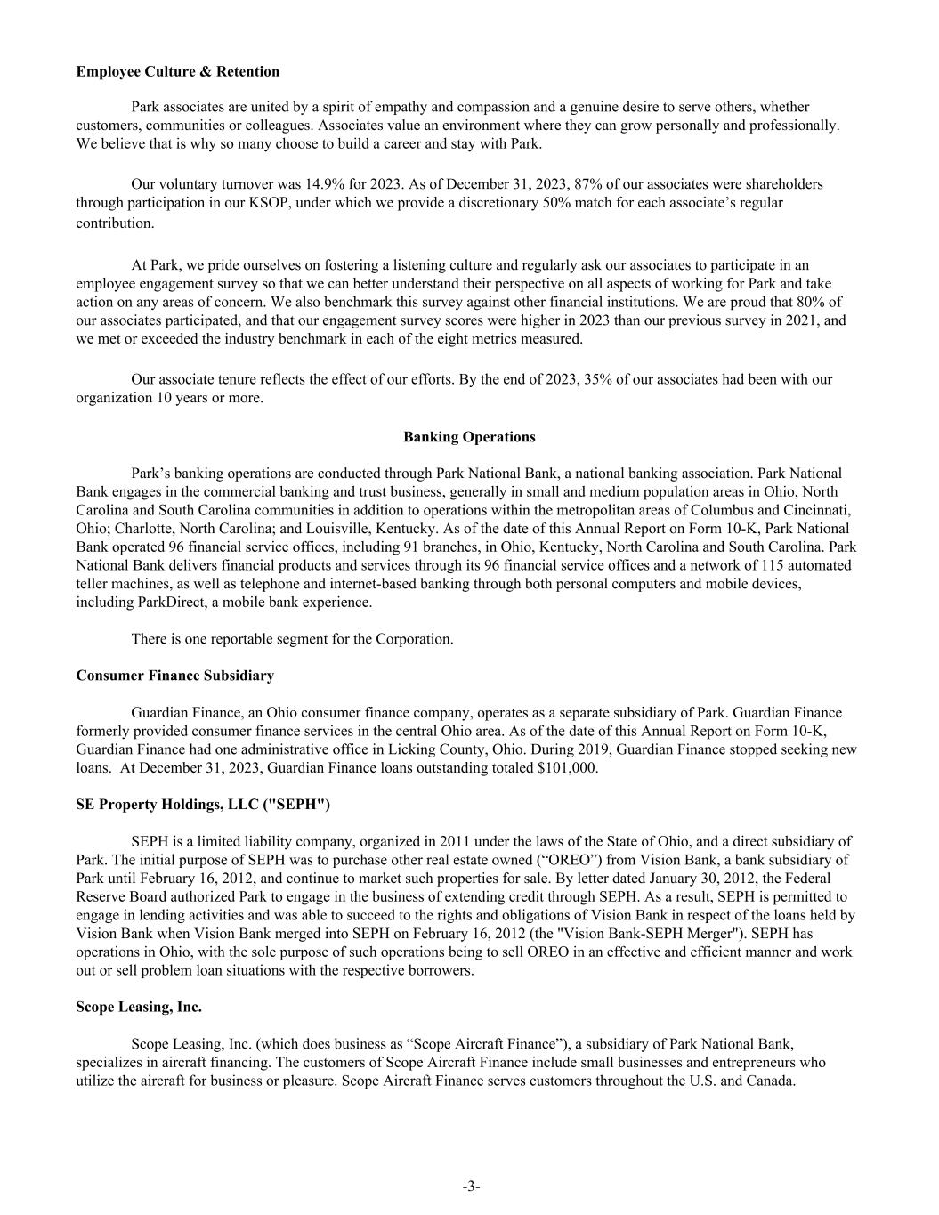 Employee Culture & Retention Park associates are united by a spirit of empathy and compassion and a genuine desire to serve others, whether customers, communities or colleagues. Associates value an environment where they can grow personally and professionally. We believe that is why so many choose to build a career and stay with Park. Our voluntary turnover was 14.9% for 2023. As of December 31, 2023, 87% of our associates were shareholders through participation in our KSOP, under which we provide a discretionary 50% match for each associate’s regular contribution. At Park, we pride ourselves on fostering a listening culture and regularly ask our associates to participate in an employee engagement survey so that we can better understand their perspective on all aspects of working for Park and take action on any areas of concern. We also benchmark this survey against other financial institutions. We are proud that 80% of our associates participated, and that our engagement survey scores were higher in 2023 than our previous survey in 2021, and we met or exceeded the industry benchmark in each of the eight metrics measured. Our associate tenure reflects the effect of our efforts. By the end of 2023, 35% of our associates had been with our organization 10 years or more. Banking Operations Park’s banking operations are conducted through Park National Bank, a national banking association. Park National Bank engages in the commercial banking and trust business, generally in small and medium population areas in Ohio, North Carolina and South Carolina communities in addition to operations within the metropolitan areas of Columbus and Cincinnati, Ohio; Charlotte, North Carolina; and Louisville, Kentucky. As of the date of this Annual Report on Form 10-K, Park National Bank operated 96 financial service offices, including 91 branches, in Ohio, Kentucky, North Carolina and South Carolina. Park National Bank delivers financial products and services through its 96 financial service offices and a network of 115 automated teller machines, as well as telephone and internet-based banking through both personal computers and mobile devices, including ParkDirect, a mobile bank experience. There is one reportable segment for the Corporation. Consumer Finance Subsidiary Guardian Finance, an Ohio consumer finance company, operates as a separate subsidiary of Park. Guardian Finance formerly provided consumer finance services in the central Ohio area. As of the date of this Annual Report on Form 10-K, Guardian Finance had one administrative office in Licking County, Ohio. During 2019, Guardian Finance stopped seeking new loans. At December 31, 2023, Guardian Finance loans outstanding totaled $101,000. SE Property Holdings, LLC ("SEPH") SEPH is a limited liability company, organized in 2011 under the laws of the State of Ohio, and a direct subsidiary of Park. The initial purpose of SEPH was to purchase other real estate owned (“OREO”) from Vision Bank, a bank subsidiary of Park until February 16, 2012, and continue to market such properties for sale. By letter dated January 30, 2012, the Federal Reserve Board authorized Park to engage in the business of extending credit through SEPH. As a result, SEPH is permitted to engage in lending activities and was able to succeed to the rights and obligations of Vision Bank in respect of the loans held by Vision Bank when Vision Bank merged into SEPH on February 16, 2012 (the "Vision Bank-SEPH Merger"). SEPH has operations in Ohio, with the sole purpose of such operations being to sell OREO in an effective and efficient manner and work out or sell problem loan situations with the respective borrowers. Scope Leasing, Inc. Scope Leasing, Inc. (which does business as “Scope Aircraft Finance”), a subsidiary of Park National Bank, specializes in aircraft financing. The customers of Scope Aircraft Finance include small businesses and entrepreneurs who utilize the aircraft for business or pleasure. Scope Aircraft Finance serves customers throughout the U.S. and Canada. -3-