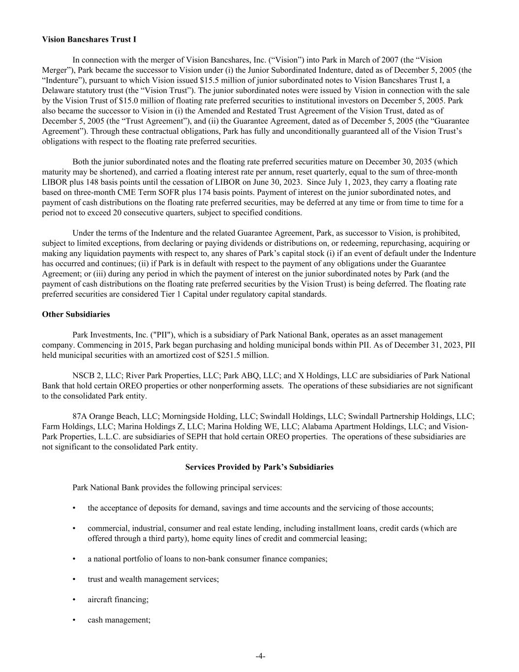 Vision Bancshares Trust I In connection with the merger of Vision Bancshares, Inc. (“Vision”) into Park in March of 2007 (the “Vision Merger”), Park became the successor to Vision under (i) the Junior Subordinated Indenture, dated as of December 5, 2005 (the “Indenture”), pursuant to which Vision issued $15.5 million of junior subordinated notes to Vision Bancshares Trust I, a Delaware statutory trust (the “Vision Trust”). The junior subordinated notes were issued by Vision in connection with the sale by the Vision Trust of $15.0 million of floating rate preferred securities to institutional investors on December 5, 2005. Park also became the successor to Vision in (i) the Amended and Restated Trust Agreement of the Vision Trust, dated as of December 5, 2005 (the “Trust Agreement”), and (ii) the Guarantee Agreement, dated as of December 5, 2005 (the “Guarantee Agreement”). Through these contractual obligations, Park has fully and unconditionally guaranteed all of the Vision Trust’s obligations with respect to the floating rate preferred securities. Both the junior subordinated notes and the floating rate preferred securities mature on December 30, 2035 (which maturity may be shortened), and carried a floating interest rate per annum, reset quarterly, equal to the sum of three-month LIBOR plus 148 basis points until the cessation of LIBOR on June 30, 2023. Since July 1, 2023, they carry a floating rate based on three-month CME Term SOFR plus 174 basis points. Payment of interest on the junior subordinated notes, and payment of cash distributions on the floating rate preferred securities, may be deferred at any time or from time to time for a period not to exceed 20 consecutive quarters, subject to specified conditions. Under the terms of the Indenture and the related Guarantee Agreement, Park, as successor to Vision, is prohibited, subject to limited exceptions, from declaring or paying dividends or distributions on, or redeeming, repurchasing, acquiring or making any liquidation payments with respect to, any shares of Park’s capital stock (i) if an event of default under the Indenture has occurred and continues; (ii) if Park is in default with respect to the payment of any obligations under the Guarantee Agreement; or (iii) during any period in which the payment of interest on the junior subordinated notes by Park (and the payment of cash distributions on the floating rate preferred securities by the Vision Trust) is being deferred. The floating rate preferred securities are considered Tier 1 Capital under regulatory capital standards. Other Subsidiaries Park Investments, Inc. ("PII"), which is a subsidiary of Park National Bank, operates as an asset management company. Commencing in 2015, Park began purchasing and holding municipal bonds within PII. As of December 31, 2023, PII held municipal securities with an amortized cost of $251.5 million. NSCB 2, LLC; River Park Properties, LLC; Park ABQ, LLC; and X Holdings, LLC are subsidiaries of Park National Bank that hold certain OREO properties or other nonperforming assets. The operations of these subsidiaries are not significant to the consolidated Park entity. 87A Orange Beach, LLC; Morningside Holding, LLC; Swindall Holdings, LLC; Swindall Partnership Holdings, LLC; Farm Holdings, LLC; Marina Holdings Z, LLC; Marina Holding WE, LLC; Alabama Apartment Holdings, LLC; and Vision- Park Properties, L.L.C. are subsidiaries of SEPH that hold certain OREO properties. The operations of these subsidiaries are not significant to the consolidated Park entity. Services Provided by Park’s Subsidiaries Park National Bank provides the following principal services: • the acceptance of deposits for demand, savings and time accounts and the servicing of those accounts; • commercial, industrial, consumer and real estate lending, including installment loans, credit cards (which are offered through a third party), home equity lines of credit and commercial leasing; • a national portfolio of loans to non-bank consumer finance companies; • trust and wealth management services; • aircraft financing; • cash management; -4-