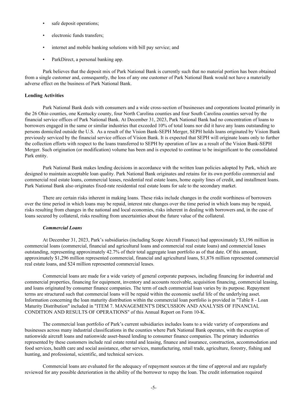 • safe deposit operations; • electronic funds transfers; • internet and mobile banking solutions with bill pay service; and • ParkDirect, a personal banking app. Park believes that the deposit mix of Park National Bank is currently such that no material portion has been obtained from a single customer and, consequently, the loss of any one customer of Park National Bank would not have a materially adverse effect on the business of Park National Bank. Lending Activities Park National Bank deals with consumers and a wide cross-section of businesses and corporations located primarily in the 26 Ohio counties, one Kentucky county, four North Carolina counties and four South Carolina counties served by the financial service offices of Park National Bank. At December 31, 2023, Park National Bank had no concentration of loans to borrowers engaged in the same or similar industries that exceeded 10% of total loans nor did it have any loans outstanding to persons domiciled outside the U.S. As a result of the Vision Bank-SEPH Merger, SEPH holds loans originated by Vision Bank previously serviced by the financial service offices of Vision Bank. It is expected that SEPH will originate loans only to further the collection efforts with respect to the loans transferred to SEPH by operation of law as a result of the Vision Bank-SEPH Merger. Such origination (or modification) volume has been and is expected to continue to be insignificant to the consolidated Park entity. Park National Bank makes lending decisions in accordance with the written loan policies adopted by Park, which are designed to maintain acceptable loan quality. Park National Bank originates and retains for its own portfolio commercial and commercial real estate loans, commercial leases, residential real estate loans, home equity lines of credit, and installment loans. Park National Bank also originates fixed-rate residential real estate loans for sale to the secondary market. There are certain risks inherent in making loans. These risks include changes in the credit worthiness of borrowers over the time period in which loans may be repaid, interest rate changes over the time period in which loans may be repaid, risks resulting from changes in the national and local economies, risks inherent in dealing with borrowers and, in the case of loans secured by collateral, risks resulting from uncertainties about the future value of the collateral. Commercial Loans At December 31, 2023, Park’s subsidiaries (including Scope Aircraft Finance) had approximately $3,196 million in commercial loans (commercial, financial and agricultural loans and commercial real estate loans) and commercial leases outstanding, representing approximately 42.7% of their total aggregate loan portfolio as of that date. Of this amount, approximately $1,296 million represented commercial, financial and agricultural loans, $1,876 million represented commercial real estate loans, and $24 million represented commercial leases. Commercial loans are made for a wide variety of general corporate purposes, including financing for industrial and commercial properties, financing for equipment, inventory and accounts receivable, acquisition financing, commercial leasing, and loans originated by consumer finance companies. The term of each commercial loan varies by its purpose. Repayment terms are structured such that commercial loans will be repaid within the economic useful life of the underlying asset. Information concerning the loan maturity distribution within the commercial loan portfolio is provided in "Table 8 - Loan Maturity Distribution" included in "ITEM 7. MANAGEMENT'S DISCUSSION AND ANALYSIS OF FINANCIAL CONDITION AND RESULTS OF OPERATIONS" of this Annual Report on Form 10-K. The commercial loan portfolio of Park’s current subsidiaries includes loans to a wide variety of corporations and businesses across many industrial classifications in the counties where Park National Bank operates, with the exception of nationwide aircraft loans and nationwide asset-based lending to consumer finance companies. The primary industries represented by these customers include real estate rental and leasing, finance and insurance, construction, accommodation and food services, health care and social assistance, other services, manufacturing, retail trade, agriculture, forestry, fishing and hunting, and professional, scientific, and technical services. Commercial loans are evaluated for the adequacy of repayment sources at the time of approval and are regularly reviewed for any possible deterioration in the ability of the borrower to repay the loan. The credit information required -5-