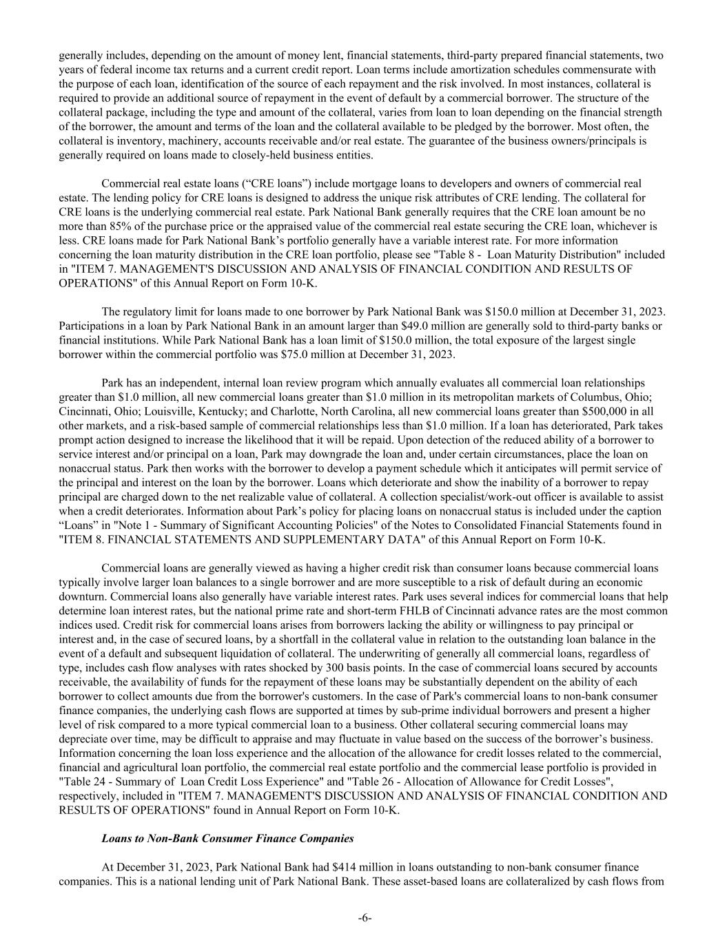 generally includes, depending on the amount of money lent, financial statements, third-party prepared financial statements, two years of federal income tax returns and a current credit report. Loan terms include amortization schedules commensurate with the purpose of each loan, identification of the source of each repayment and the risk involved. In most instances, collateral is required to provide an additional source of repayment in the event of default by a commercial borrower. The structure of the collateral package, including the type and amount of the collateral, varies from loan to loan depending on the financial strength of the borrower, the amount and terms of the loan and the collateral available to be pledged by the borrower. Most often, the collateral is inventory, machinery, accounts receivable and/or real estate. The guarantee of the business owners/principals is generally required on loans made to closely-held business entities. Commercial real estate loans (“CRE loans”) include mortgage loans to developers and owners of commercial real estate. The lending policy for CRE loans is designed to address the unique risk attributes of CRE lending. The collateral for CRE loans is the underlying commercial real estate. Park National Bank generally requires that the CRE loan amount be no more than 85% of the purchase price or the appraised value of the commercial real estate securing the CRE loan, whichever is less. CRE loans made for Park National Bank’s portfolio generally have a variable interest rate. For more information concerning the loan maturity distribution in the CRE loan portfolio, please see "Table 8 - Loan Maturity Distribution" included in "ITEM 7. MANAGEMENT'S DISCUSSION AND ANALYSIS OF FINANCIAL CONDITION AND RESULTS OF OPERATIONS" of this Annual Report on Form 10-K. The regulatory limit for loans made to one borrower by Park National Bank was $150.0 million at December 31, 2023. Participations in a loan by Park National Bank in an amount larger than $49.0 million are generally sold to third-party banks or financial institutions. While Park National Bank has a loan limit of $150.0 million, the total exposure of the largest single borrower within the commercial portfolio was $75.0 million at December 31, 2023. Park has an independent, internal loan review program which annually evaluates all commercial loan relationships greater than $1.0 million, all new commercial loans greater than $1.0 million in its metropolitan markets of Columbus, Ohio; Cincinnati, Ohio; Louisville, Kentucky; and Charlotte, North Carolina, all new commercial loans greater than $500,000 in all other markets, and a risk-based sample of commercial relationships less than $1.0 million. If a loan has deteriorated, Park takes prompt action designed to increase the likelihood that it will be repaid. Upon detection of the reduced ability of a borrower to service interest and/or principal on a loan, Park may downgrade the loan and, under certain circumstances, place the loan on nonaccrual status. Park then works with the borrower to develop a payment schedule which it anticipates will permit service of the principal and interest on the loan by the borrower. Loans which deteriorate and show the inability of a borrower to repay principal are charged down to the net realizable value of collateral. A collection specialist/work-out officer is available to assist when a credit deteriorates. Information about Park’s policy for placing loans on nonaccrual status is included under the caption “Loans” in "Note 1 - Summary of Significant Accounting Policies" of the Notes to Consolidated Financial Statements found in "ITEM 8. FINANCIAL STATEMENTS AND SUPPLEMENTARY DATA" of this Annual Report on Form 10-K. Commercial loans are generally viewed as having a higher credit risk than consumer loans because commercial loans typically involve larger loan balances to a single borrower and are more susceptible to a risk of default during an economic downturn. Commercial loans also generally have variable interest rates. Park uses several indices for commercial loans that help determine loan interest rates, but the national prime rate and short-term FHLB of Cincinnati advance rates are the most common indices used. Credit risk for commercial loans arises from borrowers lacking the ability or willingness to pay principal or interest and, in the case of secured loans, by a shortfall in the collateral value in relation to the outstanding loan balance in the event of a default and subsequent liquidation of collateral. The underwriting of generally all commercial loans, regardless of type, includes cash flow analyses with rates shocked by 300 basis points. In the case of commercial loans secured by accounts receivable, the availability of funds for the repayment of these loans may be substantially dependent on the ability of each borrower to collect amounts due from the borrower's customers. In the case of Park's commercial loans to non-bank consumer finance companies, the underlying cash flows are supported at times by sub-prime individual borrowers and present a higher level of risk compared to a more typical commercial loan to a business. Other collateral securing commercial loans may depreciate over time, may be difficult to appraise and may fluctuate in value based on the success of the borrower’s business. Information concerning the loan loss experience and the allocation of the allowance for credit losses related to the commercial, financial and agricultural loan portfolio, the commercial real estate portfolio and the commercial lease portfolio is provided in "Table 24 - Summary of Loan Credit Loss Experience" and "Table 26 - Allocation of Allowance for Credit Losses", respectively, included in "ITEM 7. MANAGEMENT'S DISCUSSION AND ANALYSIS OF FINANCIAL CONDITION AND RESULTS OF OPERATIONS" found in Annual Report on Form 10-K. Loans to Non-Bank Consumer Finance Companies At December 31, 2023, Park National Ban