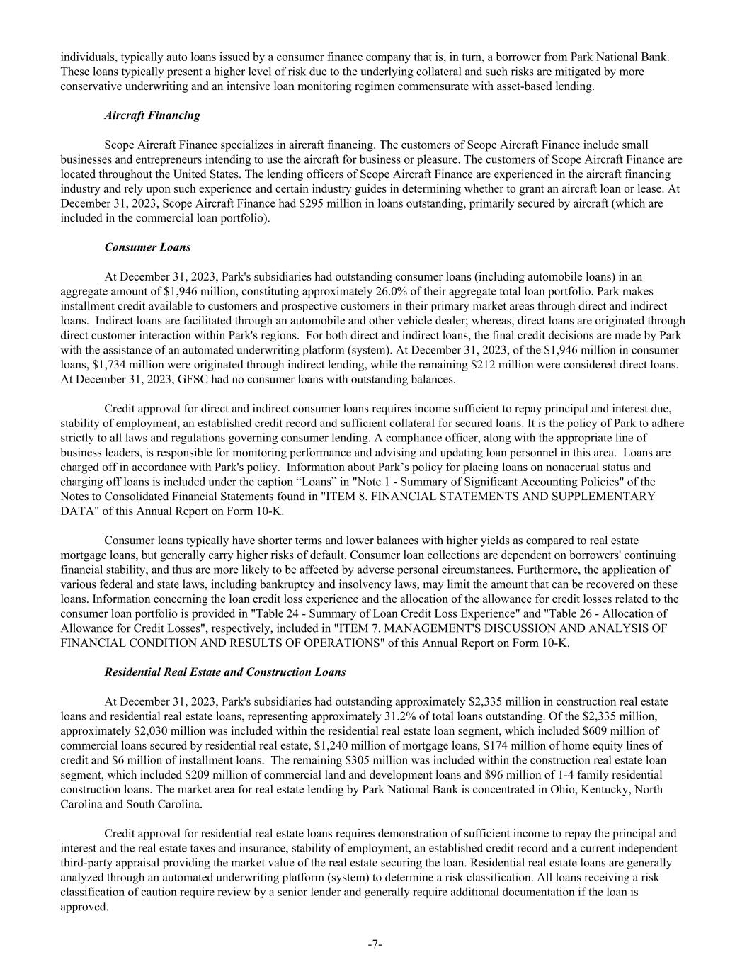 individuals, typically auto loans issued by a consumer finance company that is, in turn, a borrower from Park National Bank. These loans typically present a higher level of risk due to the underlying collateral and such risks are mitigated by more conservative underwriting and an intensive loan monitoring regimen commensurate with asset-based lending. Aircraft Financing Scope Aircraft Finance specializes in aircraft financing. The customers of Scope Aircraft Finance include small businesses and entrepreneurs intending to use the aircraft for business or pleasure. The customers of Scope Aircraft Finance are located throughout the United States. The lending officers of Scope Aircraft Finance are experienced in the aircraft financing industry and rely upon such experience and certain industry guides in determining whether to grant an aircraft loan or lease. At December 31, 2023, Scope Aircraft Finance had $295 million in loans outstanding, primarily secured by aircraft (which are included in the commercial loan portfolio). Consumer Loans At December 31, 2023, Park's subsidiaries had outstanding consumer loans (including automobile loans) in an aggregate amount of $1,946 million, constituting approximately 26.0% of their aggregate total loan portfolio. Park makes installment credit available to customers and prospective customers in their primary market areas through direct and indirect loans. Indirect loans are facilitated through an automobile and other vehicle dealer; whereas, direct loans are originated through direct customer interaction within Park's regions. For both direct and indirect loans, the final credit decisions are made by Park with the assistance of an automated underwriting platform (system). At December 31, 2023, of the $1,946 million in consumer loans, $1,734 million were originated through indirect lending, while the remaining $212 million were considered direct loans. At December 31, 2023, GFSC had no consumer loans with outstanding balances. Credit approval for direct and indirect consumer loans requires income sufficient to repay principal and interest due, stability of employment, an established credit record and sufficient collateral for secured loans. It is the policy of Park to adhere strictly to all laws and regulations governing consumer lending. A compliance officer, along with the appropriate line of business leaders, is responsible for monitoring performance and advising and updating loan personnel in this area. Loans are charged off in accordance with Park's policy. Information about Park’s policy for placing loans on nonaccrual status and charging off loans is included under the caption “Loans” in "Note 1 - Summary of Significant Accounting Policies" of the Notes to Consolidated Financial Statements found in "ITEM 8. FINANCIAL STATEMENTS AND SUPPLEMENTARY DATA" of this Annual Report on Form 10-K. Consumer loans typically have shorter terms and lower balances with higher yields as compared to real estate mortgage loans, but generally carry higher risks of default. Consumer loan collections are dependent on borrowers' continuing financial stability, and thus are more likely to be affected by adverse personal circumstances. Furthermore, the application of various federal and state laws, including bankruptcy and insolvency laws, may limit the amount that can be recovered on these loans. Information concerning the loan credit loss experience and the allocation of the allowance for credit losses related to the consumer loan portfolio is provided in "Table 24 - Summary of Loan Credit Loss Experience" and "Table 26 - Allocation of Allowance for Credit Losses", respectively, included in "ITEM 7. MANAGEMENT'S DISCUSSION AND ANALYSIS OF FINANCIAL CONDITION AND RESULTS OF OPERATIONS" of this Annual Report on Form 10-K. Residential Real Estate and Construction Loans At December 31, 2023, Park's subsidiaries had outstanding approximately $2,335 million in construction real estate loans and residential real estate loans, representing approximately 31.2% of total loans outstanding. Of the $2,335 million, approximately $2,030 million was included within the residential real estate loan segment, which included $609 million of commercial loans secured by residential real estate, $1,240 million of mortgage loans, $174 million of home equity lines of credit and $6 million of installment loans. The remaining $305 million was included within the construction real estate loan segment, which included $209 million of commercial land and development loans and $96 million of 1-4 family residential construction loans. The market area for real estate lending by Park National Bank is concentrated in Ohio, Kentucky, North Carolina and South Carolina. Credit approval for residential real estate loans requires demonstration of sufficient income to repay the principal and interest and the real estate taxes and insurance, stability of employment, an established credit record and a current independent third-party appraisal providing the market value of the real estate securing the loan. Residential real estate loans are generally analyzed through an automated underwriting platform (system) to determine a risk classification. All loans receiving a risk classification of caution require review by a senior lender and generally require additional documentation if the loan is approved. -7-