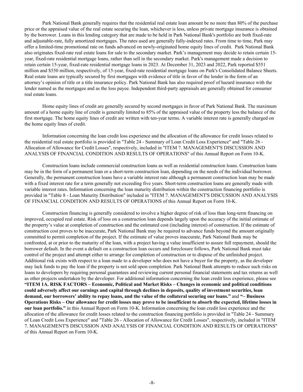 Park National Bank generally requires that the residential real estate loan amount be no more than 80% of the purchase price or the appraised value of the real estate securing the loan, whichever is less, unless private mortgage insurance is obtained by the borrower. Loans in this lending category that are made to be held in Park National Bank's portfolio are both fixed-rate and adjustable-rate, fully amortized mortgages. The rates used are generally fully-indexed rates. From time to time, Park may offer a limited-time promotional rate on funds advanced on newly-originated home equity lines of credit. Park National Bank also originates fixed-rate real estate loans for sale to the secondary market. Park’s management may decide to retain certain 15- year, fixed-rate residential mortgage loans, rather than sell in the secondary market. Park's management made a decision to retain certain 15-year, fixed-rate residential mortgage loans in 2023. At December 31, 2023 and 2022, Park reported $551 million and $550 million, respectively, of 15-year, fixed-rate residential mortgage loans on Park's Consolidated Balance Sheets. Real estate loans are typically secured by first mortgages with evidence of title in favor of the lender in the form of an attorney’s opinion of title or a title insurance policy. Park National Bank has also required proof of hazard insurance with the lender named as the mortgagee and as the loss payee. Independent third-party appraisals are generally obtained for consumer real estate loans. Home equity lines of credit are generally secured by second mortgages in favor of Park National Bank. The maximum amount of a home equity line of credit is generally limited to 85% of the appraised value of the property less the balance of the first mortgage. The home equity lines of credit are written with ten-year terms. A variable interest rate is generally charged on the home equity lines of credit. Information concerning the loan credit loss experience and the allocation of the allowance for credit losses related to the residential real estate portfolio is provided in "Table 24 - Summary of Loan Credit Loss Experience" and "Table 26 - Allocation of Allowance for Credit Losses", respectively, included in "ITEM 7. MANAGEMENT'S DISCUSSION AND ANALYSIS OF FINANCIAL CONDITION AND RESULTS OF OPERATIONS" of this Annual Report on Form 10-K. Construction loans include commercial construction loans as well as residential construction loans. Construction loans may be in the form of a permanent loan or a short-term construction loan, depending on the needs of the individual borrower. Generally, the permanent construction loans have a variable interest rate although a permanent construction loan may be made with a fixed interest rate for a term generally not exceeding five years. Short-term construction loans are generally made with variable interest rates. Information concerning the loan maturity distribution within the construction financing portfolio is provided in "Table 8 - Loan Maturity Distribution" included in "ITEM 7. MANAGEMENT'S DISCUSSION AND ANALYSIS OF FINANCIAL CONDITION AND RESULTS OF OPERATIONS of this Annual Report on Form 10-K. Construction financing is generally considered to involve a higher degree of risk of loss than long-term financing on improved, occupied real estate. Risk of loss on a construction loan depends largely upon the accuracy of the initial estimate of the property’s value at completion of construction and the estimated cost (including interest) of construction. If the estimate of construction cost proves to be inaccurate, Park National Bank may be required to advance funds beyond the amount originally committed to permit completion of the project. If the estimate of value proves inaccurate, Park National Bank may be confronted, at or prior to the maturity of the loan, with a project having a value insufficient to assure full repayment, should the borrower default. In the event a default on a construction loan occurs and foreclosure follows, Park National Bank must take control of the project and attempt either to arrange for completion of construction or to dispose of the unfinished project. Additional risk exists with respect to a loan made to a developer who does not have a buyer for the property, as the developer may lack funds to pay the loan if the property is not sold upon completion. Park National Bank attempts to reduce such risks on loans to developers by requiring personal guarantees and reviewing current personal financial statements and tax returns as well as other projects undertaken by the developer. For additional information concerning the loan credit loss experience, please see “ITEM 1A. RISK FACTORS – Economic, Political and Market Risks – Changes in economic and political conditions could adversely affect our earnings and capital through declines in deposits, quality of investment securities, loan demand, our borrowers’ ability to repay loans, and the value of the collateral securing our loans.” and “– Business Operations Risks – Our allowance for credit losses may prove to be insufficient to absorb the expected, lifetime losses in our loan portfolio.” in this Annual Report on Form 10-K. Information concerning the loan credit loss experience and the allocation of the allowance for credit losses related to the construction financing portfolio is provided in "Table 24 - Summary of Loan Credit Loss Experience" and "Table 26 - Allocation of Allowance for Credit Losses", respectively, included in "ITEM 7. MANAGEMENT'S DISCUSSION AND ANALYSIS OF FINANCIAL CONDITION AND RESULTS OF OPERATIONS" of this Annual Report on Form 10-K. -8-