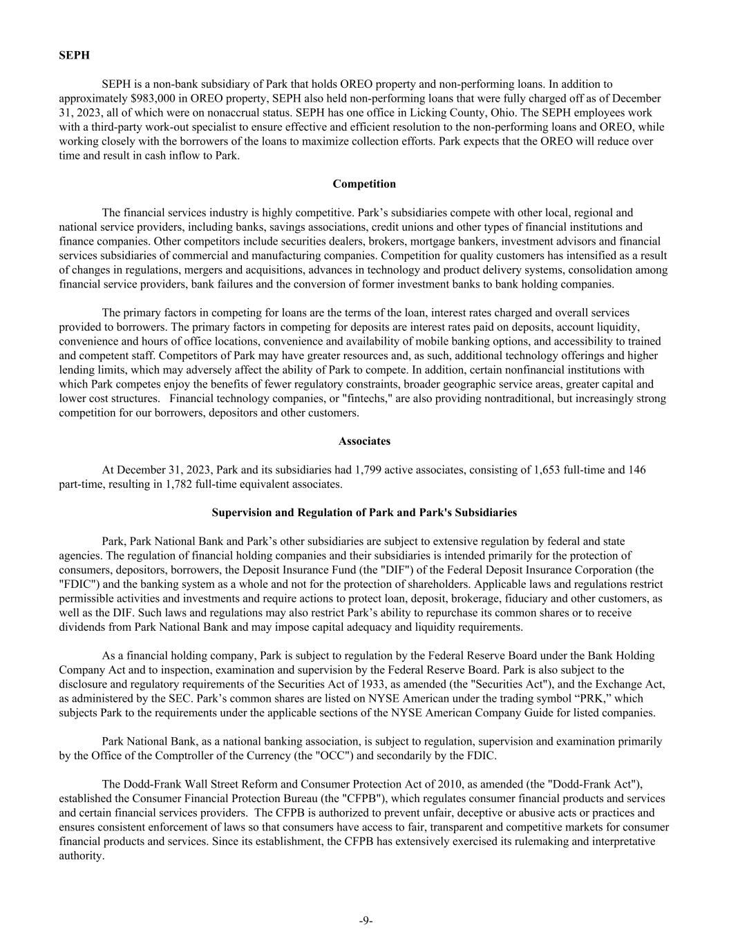 SEPH SEPH is a non-bank subsidiary of Park that holds OREO property and non-performing loans. In addition to approximately $983,000 in OREO property, SEPH also held non-performing loans that were fully charged off as of December 31, 2023, all of which were on nonaccrual status. SEPH has one office in Licking County, Ohio. The SEPH employees work with a third-party work-out specialist to ensure effective and efficient resolution to the non-performing loans and OREO, while working closely with the borrowers of the loans to maximize collection efforts. Park expects that the OREO will reduce over time and result in cash inflow to Park. Competition The financial services industry is highly competitive. Park’s subsidiaries compete with other local, regional and national service providers, including banks, savings associations, credit unions and other types of financial institutions and finance companies. Other competitors include securities dealers, brokers, mortgage bankers, investment advisors and financial services subsidiaries of commercial and manufacturing companies. Competition for quality customers has intensified as a result of changes in regulations, mergers and acquisitions, advances in technology and product delivery systems, consolidation among financial service providers, bank failures and the conversion of former investment banks to bank holding companies. The primary factors in competing for loans are the terms of the loan, interest rates charged and overall services provided to borrowers. The primary factors in competing for deposits are interest rates paid on deposits, account liquidity, convenience and hours of office locations, convenience and availability of mobile banking options, and accessibility to trained and competent staff. Competitors of Park may have greater resources and, as such, additional technology offerings and higher lending limits, which may adversely affect the ability of Park to compete. In addition, certain nonfinancial institutions with which Park competes enjoy the benefits of fewer regulatory constraints, broader geographic service areas, greater capital and lower cost structures. Financial technology companies, or "fintechs," are also providing nontraditional, but increasingly strong competition for our borrowers, depositors and other customers. Associates At December 31, 2023, Park and its subsidiaries had 1,799 active associates, consisting of 1,653 full-time and 146 part-time, resulting in 1,782 full-time equivalent associates. Supervision and Regulation of Park and Park's Subsidiaries Park, Park National Bank and Park’s other subsidiaries are subject to extensive regulation by federal and state agencies. The regulation of financial holding companies and their subsidiaries is intended primarily for the protection of consumers, depositors, borrowers, the Deposit Insurance Fund (the "DIF") of the Federal Deposit Insurance Corporation (the "FDIC") and the banking system as a whole and not for the protection of shareholders. Applicable laws and regulations restrict permissible activities and investments and require actions to protect loan, deposit, brokerage, fiduciary and other customers, as well as the DIF. Such laws and regulations may also restrict Park’s ability to repurchase its common shares or to receive dividends from Park National Bank and may impose capital adequacy and liquidity requirements. As a financial holding company, Park is subject to regulation by the Federal Reserve Board under the Bank Holding Company Act and to inspection, examination and supervision by the Federal Reserve Board. Park is also subject to the disclosure and regulatory requirements of the Securities Act of 1933, as amended (the "Securities Act"), and the Exchange Act, as administered by the SEC. Park’s common shares are listed on NYSE American under the trading symbol “PRK,” which subjects Park to the requirements under the applicable sections of the NYSE American Company Guide for listed companies. Park National Bank, as a national banking association, is subject to regulation, supervision and examination primarily by the Office of the Comptroller of the Currency (the "OCC") and secondarily by the FDIC. The Dodd-Frank Wall Street Reform and Consumer Protection Act of 2010, as amended (the "Dodd-Frank Act"), established the Consumer Financial Protection Bureau (the "CFPB"), which regulates consumer financial products and services and certain financial services providers. The CFPB is authorized to prevent unfair, deceptive or abusive acts or practices and ensures consistent enforcement of laws so that consumers have access to fair, transparent and competitive markets for consumer financial products and services. Since its establishment, the CFPB has extensively exercised its rulemaking and interpretative authority. -9-