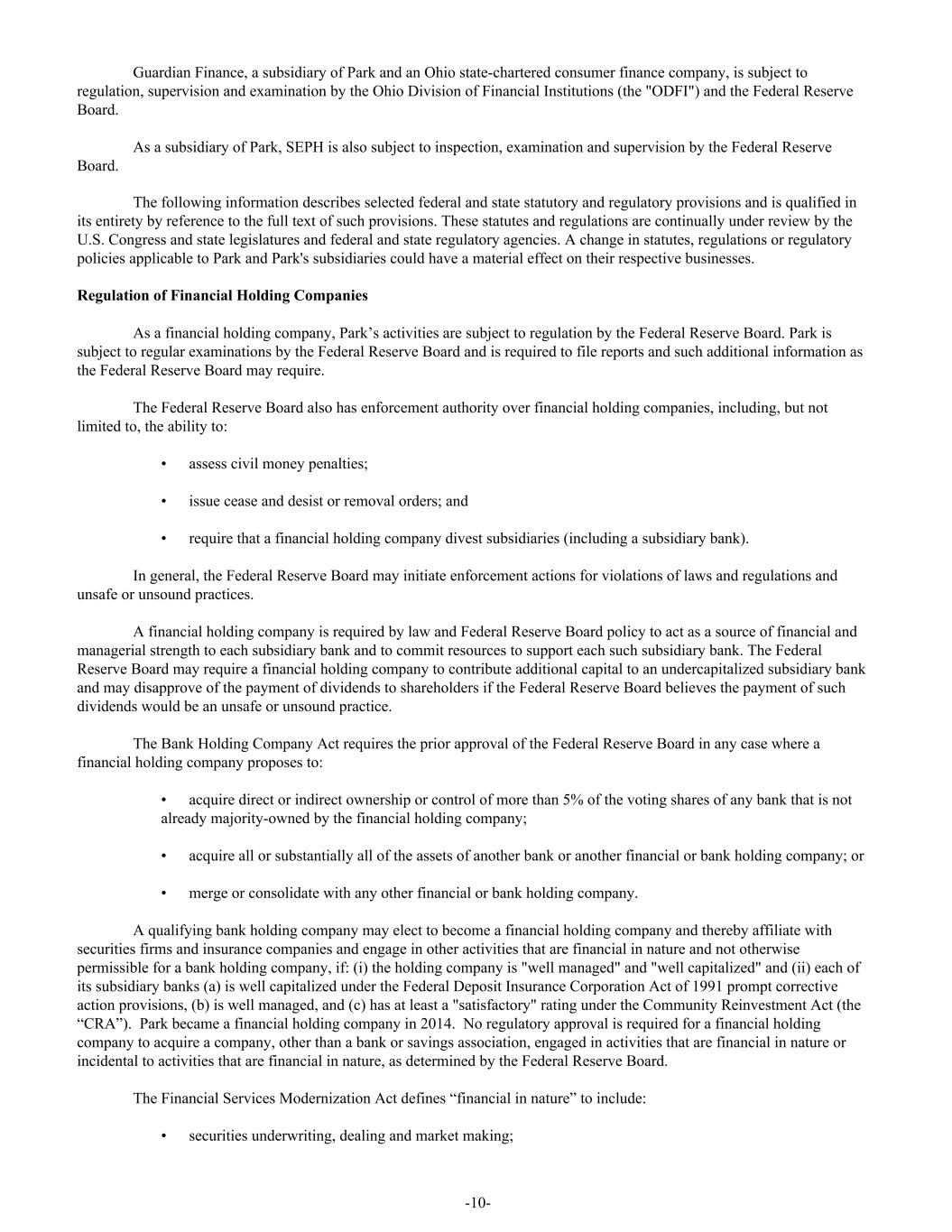 Guardian Finance, a subsidiary of Park and an Ohio state-chartered consumer finance company, is subject to regulation, supervision and examination by the Ohio Division of Financial Institutions (the "ODFI") and the Federal Reserve Board. As a subsidiary of Park, SEPH is also subject to inspection, examination and supervision by the Federal Reserve Board. The following information describes selected federal and state statutory and regulatory provisions and is qualified in its entirety by reference to the full text of such provisions. These statutes and regulations are continually under review by the U.S. Congress and state legislatures and federal and state regulatory agencies. A change in statutes, regulations or regulatory policies applicable to Park and Park's subsidiaries could have a material effect on their respective businesses. Regulation of Financial Holding Companies As a financial holding company, Park’s activities are subject to regulation by the Federal Reserve Board. Park is subject to regular examinations by the Federal Reserve Board and is required to file reports and such additional information as the Federal Reserve Board may require. The Federal Reserve Board also has enforcement authority over financial holding companies, including, but not limited to, the ability to: • assess civil money penalties; • issue cease and desist or removal orders; and • require that a financial holding company divest subsidiaries (including a subsidiary bank). In general, the Federal Reserve Board may initiate enforcement actions for violations of laws and regulations and unsafe or unsound practices. A financial holding company is required by law and Federal Reserve Board policy to act as a source of financial and managerial strength to each subsidiary bank and to commit resources to support each such subsidiary bank. The Federal Reserve Board may require a financial holding company to contribute additional capital to an undercapitalized subsidiary bank and may disapprove of the payment of dividends to shareholders if the Federal Reserve Board believes the payment of such dividends would be an unsafe or unsound practice. The Bank Holding Company Act requires the prior approval of the Federal Reserve Board in any case where a financial holding company proposes to: • acquire direct or indirect ownership or control of more than 5% of the voting shares of any bank that is not already majority-owned by the financial holding company; • acquire all or substantially all of the assets of another bank or another financial or bank holding company; or • merge or consolidate with any other financial or bank holding company. A qualifying bank holding company may elect to become a financial holding company and thereby affiliate with securities firms and insurance companies and engage in other activities that are financial in nature and not otherwise permissible for a bank holding company, if: (i) the holding company is "well managed" and "well capitalized" and (ii) each of its subsidiary banks (a) is well capitalized under the Federal Deposit Insurance Corporation Act of 1991 prompt corrective action provisions, (b) is well managed, and (c) has at least a "satisfactory" rating under the Community Reinvestment Act (the “CRA”). Park became a financial holding company in 2014. No regulatory approval is required for a financial holding company to acquire a company, other than a bank or savings association, engaged in activities that are financial in nature or incidental to activities that are financial in nature, as determined by the Federal Reserve Board. The Financial Services Modernization Act defines “financial in nature” to include: • securities underwriting, dealing and market making; -10-