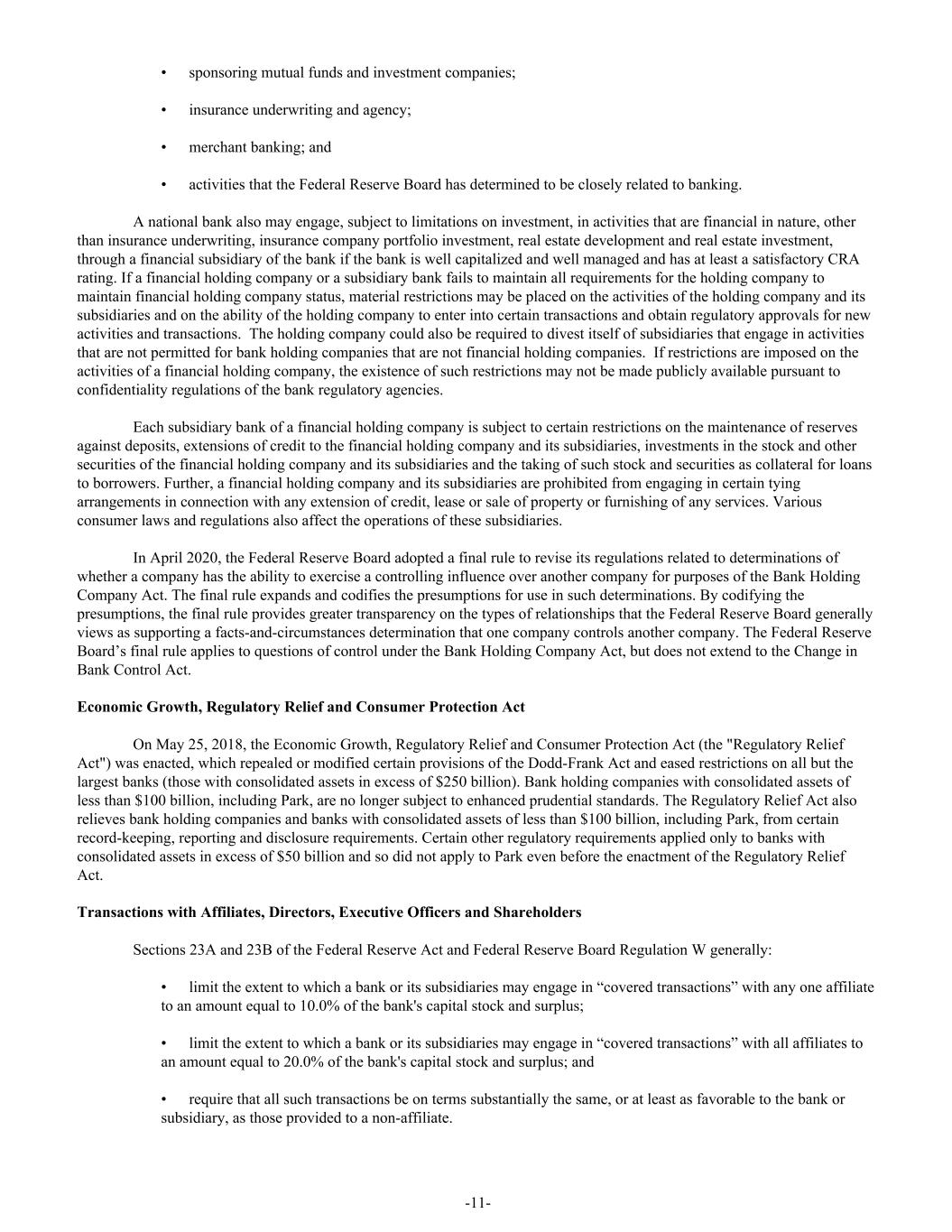 • sponsoring mutual funds and investment companies; • insurance underwriting and agency; • merchant banking; and • activities that the Federal Reserve Board has determined to be closely related to banking. A national bank also may engage, subject to limitations on investment, in activities that are financial in nature, other than insurance underwriting, insurance company portfolio investment, real estate development and real estate investment, through a financial subsidiary of the bank if the bank is well capitalized and well managed and has at least a satisfactory CRA rating. If a financial holding company or a subsidiary bank fails to maintain all requirements for the holding company to maintain financial holding company status, material restrictions may be placed on the activities of the holding company and its subsidiaries and on the ability of the holding company to enter into certain transactions and obtain regulatory approvals for new activities and transactions. The holding company could also be required to divest itself of subsidiaries that engage in activities that are not permitted for bank holding companies that are not financial holding companies. If restrictions are imposed on the activities of a financial holding company, the existence of such restrictions may not be made publicly available pursuant to confidentiality regulations of the bank regulatory agencies. Each subsidiary bank of a financial holding company is subject to certain restrictions on the maintenance of reserves against deposits, extensions of credit to the financial holding company and its subsidiaries, investments in the stock and other securities of the financial holding company and its subsidiaries and the taking of such stock and securities as collateral for loans to borrowers. Further, a financial holding company and its subsidiaries are prohibited from engaging in certain tying arrangements in connection with any extension of credit, lease or sale of property or furnishing of any services. Various consumer laws and regulations also affect the operations of these subsidiaries. In April 2020, the Federal Reserve Board adopted a final rule to revise its regulations related to determinations of whether a company has the ability to exercise a controlling influence over another company for purposes of the Bank Holding Company Act. The final rule expands and codifies the presumptions for use in such determinations. By codifying the presumptions, the final rule provides greater transparency on the types of relationships that the Federal Reserve Board generally views as supporting a facts-and-circumstances determination that one company controls another company. The Federal Reserve Board’s final rule applies to questions of control under the Bank Holding Company Act, but does not extend to the Change in Bank Control Act. Economic Growth, Regulatory Relief and Consumer Protection Act On May 25, 2018, the Economic Growth, Regulatory Relief and Consumer Protection Act (the "Regulatory Relief Act") was enacted, which repealed or modified certain provisions of the Dodd-Frank Act and eased restrictions on all but the largest banks (those with consolidated assets in excess of $250 billion). Bank holding companies with consolidated assets of less than $100 billion, including Park, are no longer subject to enhanced prudential standards. The Regulatory Relief Act also relieves bank holding companies and banks with consolidated assets of less than $100 billion, including Park, from certain record-keeping, reporting and disclosure requirements. Certain other regulatory requirements applied only to banks with consolidated assets in excess of $50 billion and so did not apply to Park even before the enactment of the Regulatory Relief Act. Transactions with Affiliates, Directors, Executive Officers and Shareholders Sections 23A and 23B of the Federal Reserve Act and Federal Reserve Board Regulation W generally: • limit the extent to which a bank or its subsidiaries may engage in “covered transactions” with any one affiliate to an amount equal to 10.0% of the bank's capital stock and surplus; • limit the extent to which a bank or its subsidiaries may engage in “covered transactions” with all affiliates to an amount equal to 20.0% of the bank's capital stock and surplus; and • require that all such transactions be on terms substantially the same, or at least as favorable to the bank or subsidiary, as those provided to a non-affiliate. -11-