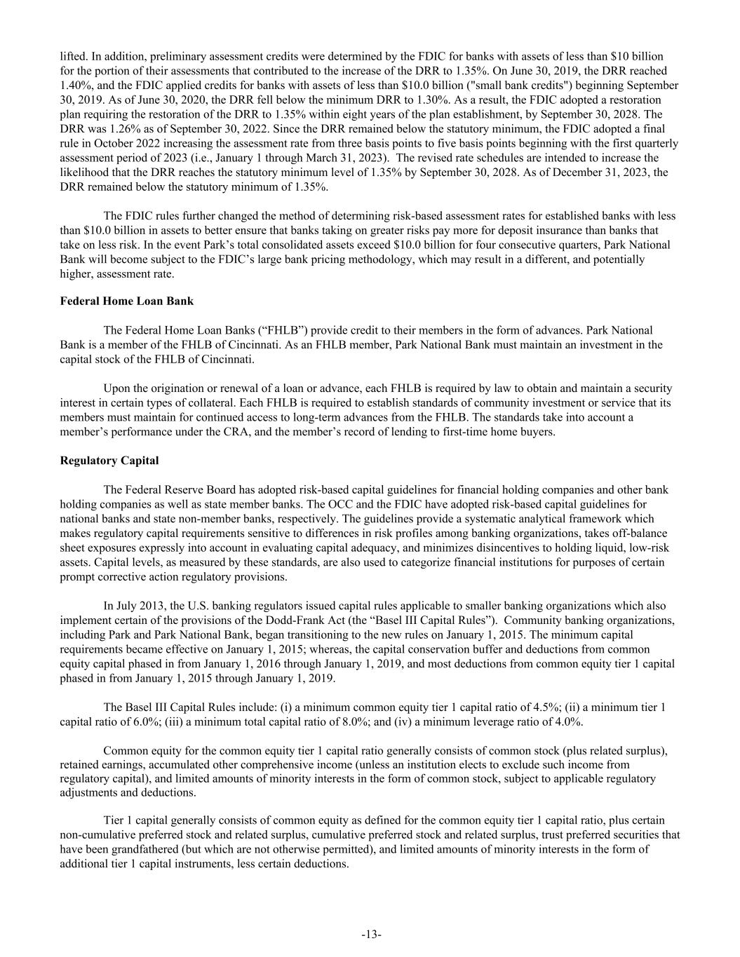 lifted. In addition, preliminary assessment credits were determined by the FDIC for banks with assets of less than $10 billion for the portion of their assessments that contributed to the increase of the DRR to 1.35%. On June 30, 2019, the DRR reached 1.40%, and the FDIC applied credits for banks with assets of less than $10.0 billion ("small bank credits") beginning September 30, 2019. As of June 30, 2020, the DRR fell below the minimum DRR to 1.30%. As a result, the FDIC adopted a restoration plan requiring the restoration of the DRR to 1.35% within eight years of the plan establishment, by September 30, 2028. The DRR was 1.26% as of September 30, 2022. Since the DRR remained below the statutory minimum, the FDIC adopted a final rule in October 2022 increasing the assessment rate from three basis points to five basis points beginning with the first quarterly assessment period of 2023 (i.e., January 1 through March 31, 2023). The revised rate schedules are intended to increase the likelihood that the DRR reaches the statutory minimum level of 1.35% by September 30, 2028. As of December 31, 2023, the DRR remained below the statutory minimum of 1.35%. The FDIC rules further changed the method of determining risk-based assessment rates for established banks with less than $10.0 billion in assets to better ensure that banks taking on greater risks pay more for deposit insurance than banks that take on less risk. In the event Park’s total consolidated assets exceed $10.0 billion for four consecutive quarters, Park National Bank will become subject to the FDIC’s large bank pricing methodology, which may result in a different, and potentially higher, assessment rate. Federal Home Loan Bank The Federal Home Loan Banks (“FHLB”) provide credit to their members in the form of advances. Park National Bank is a member of the FHLB of Cincinnati. As an FHLB member, Park National Bank must maintain an investment in the capital stock of the FHLB of Cincinnati. Upon the origination or renewal of a loan or advance, each FHLB is required by law to obtain and maintain a security interest in certain types of collateral. Each FHLB is required to establish standards of community investment or service that its members must maintain for continued access to long-term advances from the FHLB. The standards take into account a member’s performance under the CRA, and the member’s record of lending to first-time home buyers. Regulatory Capital The Federal Reserve Board has adopted risk-based capital guidelines for financial holding companies and other bank holding companies as well as state member banks. The OCC and the FDIC have adopted risk-based capital guidelines for national banks and state non-member banks, respectively. The guidelines provide a systematic analytical framework which makes regulatory capital requirements sensitive to differences in risk profiles among banking organizations, takes off-balance sheet exposures expressly into account in evaluating capital adequacy, and minimizes disincentives to holding liquid, low-risk assets. Capital levels, as measured by these standards, are also used to categorize financial institutions for purposes of certain prompt corrective action regulatory provisions. In July 2013, the U.S. banking regulators issued capital rules applicable to smaller banking organizations which also implement certain of the provisions of the Dodd-Frank Act (the “Basel III Capital Rules”). Community banking organizations, including Park and Park National Bank, began transitioning to the new rules on January 1, 2015. The minimum capital requirements became effective on January 1, 2015; whereas, the capital conservation buffer and deductions from common equity capital phased in from January 1, 2016 through January 1, 2019, and most deductions from common equity tier 1 capital phased in from January 1, 2015 through January 1, 2019. The Basel III Capital Rules include: (i) a minimum common equity tier 1 capital ratio of 4.5%; (ii) a minimum tier 1 capital ratio of 6.0%; (iii) a minimum total capital ratio of 8.0%; and (iv) a minimum leverage ratio of 4.0%. Common equity for the common equity tier 1 capital ratio generally consists of common stock (plus related surplus), retained earnings, accumulated other comprehensive income (unless an institution elects to exclude such income from regulatory capital), and limited amounts of minority interests in the form of common stock, subject to applicable regulatory adjustments and deductions. Tier 1 capital generally consists of common equity as defined for the common equity tier 1 capital ratio, plus certain non-cumulative preferred stock and related surplus, cumulative preferred stock and related surplus, trust preferred securities that have been grandfathered (but which are not otherwise permitted), and limited amounts of minority interests in the form of additional tier 1 capital instruments, less certain deductions. -13-
