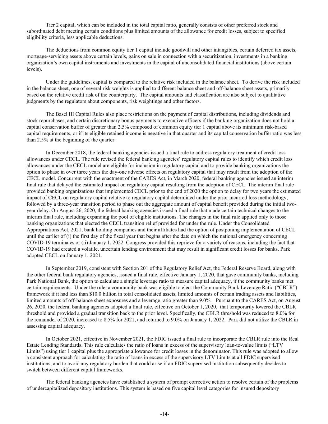 Tier 2 capital, which can be included in the total capital ratio, generally consists of other preferred stock and subordinated debt meeting certain conditions plus limited amounts of the allowance for credit losses, subject to specified eligibility criteria, less applicable deductions. The deductions from common equity tier 1 capital include goodwill and other intangibles, certain deferred tax assets, mortgage-servicing assets above certain levels, gains on sale in connection with a securitization, investments in a banking organization’s own capital instruments and investments in the capital of unconsolidated financial institutions (above certain levels). Under the guidelines, capital is compared to the relative risk included in the balance sheet. To derive the risk included in the balance sheet, one of several risk weights is applied to different balance sheet and off-balance sheet assets, primarily based on the relative credit risk of the counterparty. The capital amounts and classification are also subject to qualitative judgments by the regulators about components, risk weightings and other factors. The Basel III Capital Rules also place restrictions on the payment of capital distributions, including dividends and stock repurchases, and certain discretionary bonus payments to executive officers if the banking organization does not hold a capital conservation buffer of greater than 2.5% composed of common equity tier 1 capital above its minimum risk-based capital requirements, or if its eligible retained income is negative in that quarter and its capital conservation buffer ratio was less than 2.5% at the beginning of the quarter. In December 2018, the federal banking agencies issued a final rule to address regulatory treatment of credit loss allowances under CECL. The rule revised the federal banking agencies’ regulatory capital rules to identify which credit loss allowances under the CECL model are eligible for inclusion in regulatory capital and to provide banking organizations the option to phase in over three years the day-one adverse effects on regulatory capital that may result from the adoption of the CECL model. Concurrent with the enactment of the CARES Act, in March 2020, federal banking agencies issued an interim final rule that delayed the estimated impact on regulatory capital resulting from the adoption of CECL. The interim final rule provided banking organizations that implemented CECL prior to the end of 2020 the option to delay for two years the estimated impact of CECL on regulatory capital relative to regulatory capital determined under the prior incurred loss methodology, followed by a three-year transition period to phase out the aggregate amount of capital benefit provided during the initial two- year delay. On August 26, 2020, the federal banking agencies issued a final rule that made certain technical changes to the interim final rule, including expanding the pool of eligible institutions. The changes in the final rule applied only to those banking organizations that elected the CECL transition relief provided for under the rule. Under the Consolidated Appropriations Act, 2021, bank holding companies and their affiliates had the option of postponing implementation of CECL until the earlier of (i) the first day of the fiscal year that begins after the date on which the national emergency concerning COVID-19 terminates or (ii) January 1, 2022. Congress provided this reprieve for a variety of reasons, including the fact that COVID-19 had created a volatile, uncertain lending environment that may result in significant credit losses for banks. Park adopted CECL on January 1, 2021. In September 2019, consistent with Section 201 of the Regulatory Relief Act, the Federal Reserve Board, along with the other federal bank regulatory agencies, issued a final rule, effective January 1, 2020, that gave community banks, including Park National Bank, the option to calculate a simple leverage ratio to measure capital adequacy, if the community banks met certain requirements. Under the rule, a community bank was eligible to elect the Community Bank Leverage Ratio (“CBLR”) framework if it had less than $10.0 billion in total consolidated assets, limited amounts of certain trading assets and liabilities, limited amounts of off-balance sheet exposures and a leverage ratio greater than 9.0%. Pursuant to the CARES Act, on August 26, 2020, the federal banking agencies adopted a final rule, effective on October 1, 2020, that temporarily lowered the CBLR threshold and provided a gradual transition back to the prior level. Specifically, the CBLR threshold was reduced to 8.0% for the remainder of 2020, increased to 8.5% for 2021, and returned to 9.0% on January 1, 2022. Park did not utilize the CBLR in assessing capital adequacy. In October 2021, effective in November 2021, the FDIC issued a final rule to incorporate the CBLR rule into the Real Estate Lending Standards. This rule calculates the ratio of loans in excess of the supervisory loan-to-value limits (“LTV Limits”) using tier 1 capital plus the appropriate allowance for credit losses in the denominator. This rule was adopted to allow a consistent approach for calculating the ratio of loans in excess of the supervisory LTV Limits at all FDIC supervised institutions, and to avoid any regulatory burden that could arise if an FDIC supervised institution subsequently decides to switch between different capital frameworks. The federal banking agencies have established a system of prompt corrective action to resolve certain of the problems of undercapitalized depository institutions. This system is based on five capital level categories for insured depository -14-