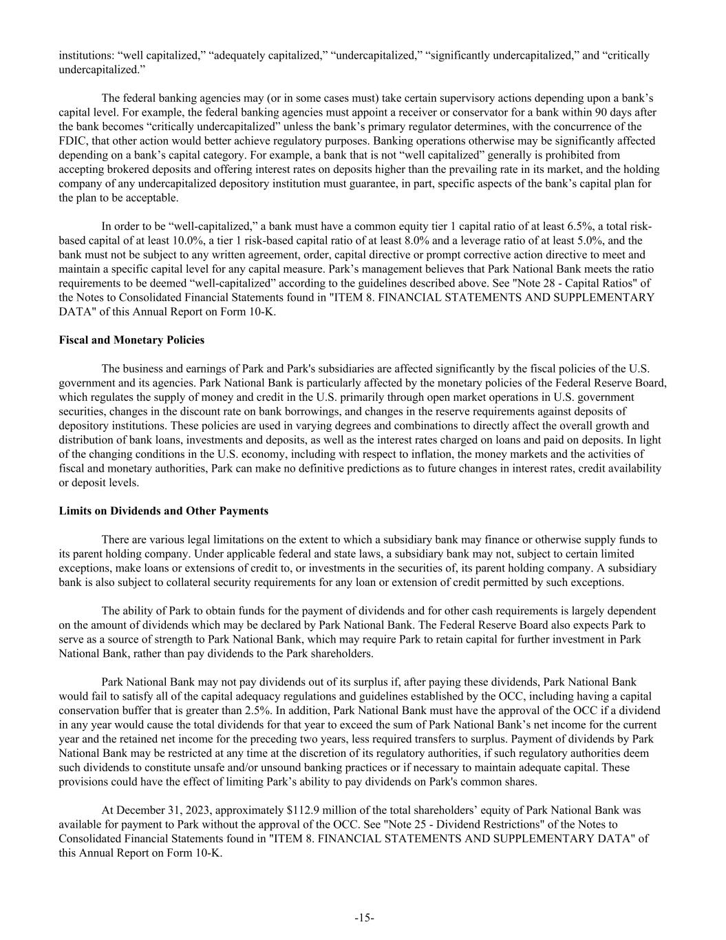 institutions: “well capitalized,” “adequately capitalized,” “undercapitalized,” “significantly undercapitalized,” and “critically undercapitalized.” The federal banking agencies may (or in some cases must) take certain supervisory actions depending upon a bank’s capital level. For example, the federal banking agencies must appoint a receiver or conservator for a bank within 90 days after the bank becomes “critically undercapitalized” unless the bank’s primary regulator determines, with the concurrence of the FDIC, that other action would better achieve regulatory purposes. Banking operations otherwise may be significantly affected depending on a bank’s capital category. For example, a bank that is not “well capitalized” generally is prohibited from accepting brokered deposits and offering interest rates on deposits higher than the prevailing rate in its market, and the holding company of any undercapitalized depository institution must guarantee, in part, specific aspects of the bank’s capital plan for the plan to be acceptable. In order to be “well-capitalized,” a bank must have a common equity tier 1 capital ratio of at least 6.5%, a total risk- based capital of at least 10.0%, a tier 1 risk-based capital ratio of at least 8.0% and a leverage ratio of at least 5.0%, and the bank must not be subject to any written agreement, order, capital directive or prompt corrective action directive to meet and maintain a specific capital level for any capital measure. Park’s management believes that Park National Bank meets the ratio requirements to be deemed “well-capitalized” according to the guidelines described above. See "Note 28 - Capital Ratios" of the Notes to Consolidated Financial Statements found in "ITEM 8. FINANCIAL STATEMENTS AND SUPPLEMENTARY DATA" of this Annual Report on Form 10-K. Fiscal and Monetary Policies The business and earnings of Park and Park's subsidiaries are affected significantly by the fiscal policies of the U.S. government and its agencies. Park National Bank is particularly affected by the monetary policies of the Federal Reserve Board, which regulates the supply of money and credit in the U.S. primarily through open market operations in U.S. government securities, changes in the discount rate on bank borrowings, and changes in the reserve requirements against deposits of depository institutions. These policies are used in varying degrees and combinations to directly affect the overall growth and distribution of bank loans, investments and deposits, as well as the interest rates charged on loans and paid on deposits. In light of the changing conditions in the U.S. economy, including with respect to inflation, the money markets and the activities of fiscal and monetary authorities, Park can make no definitive predictions as to future changes in interest rates, credit availability or deposit levels. Limits on Dividends and Other Payments There are various legal limitations on the extent to which a subsidiary bank may finance or otherwise supply funds to its parent holding company. Under applicable federal and state laws, a subsidiary bank may not, subject to certain limited exceptions, make loans or extensions of credit to, or investments in the securities of, its parent holding company. A subsidiary bank is also subject to collateral security requirements for any loan or extension of credit permitted by such exceptions. The ability of Park to obtain funds for the payment of dividends and for other cash requirements is largely dependent on the amount of dividends which may be declared by Park National Bank. The Federal Reserve Board also expects Park to serve as a source of strength to Park National Bank, which may require Park to retain capital for further investment in Park National Bank, rather than pay dividends to the Park shareholders. Park National Bank may not pay dividends out of its surplus if, after paying these dividends, Park National Bank would fail to satisfy all of the capital adequacy regulations and guidelines established by the OCC, including having a capital conservation buffer that is greater than 2.5%. In addition, Park National Bank must have the approval of the OCC if a dividend in any year would cause the total dividends for that year to exceed the sum of Park National Bank’s net income for the current year and the retained net income for the preceding two years, less required transfers to surplus. Payment of dividends by Park National Bank may be restricted at any time at the discretion of its regulatory authorities, if such regulatory authorities deem such dividends to constitute unsafe and/or unsound banking practices or if necessary to maintain adequate capital. These provisions could have the effect of limiting Park’s ability to pay dividends on Park's common shares. At December 31, 2023, approximately $112.9 million of the total shareholders’ equity of Park National Bank was available for payment to Park without the approval of the OCC. See "Note 25 - Dividend Restrictions" of the Notes to Consolidated Financial Statements found in "ITEM 8. FINANCIAL STATEMENTS AND SUPPLEMENTARY DATA" of this Annual Report on Form 10-K. -15-