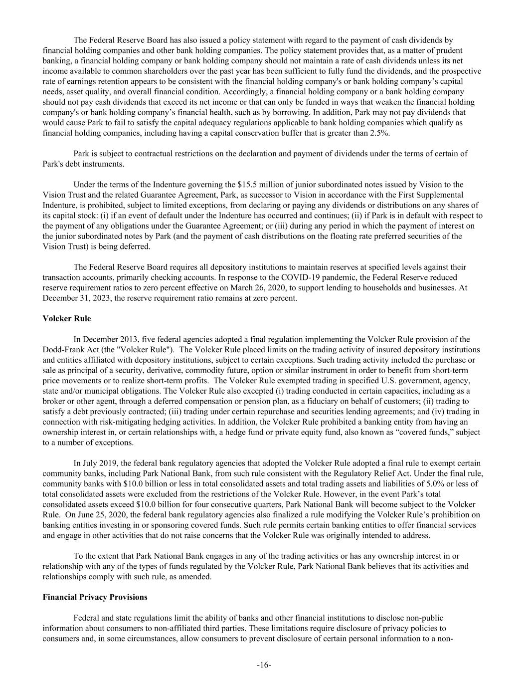 The Federal Reserve Board has also issued a policy statement with regard to the payment of cash dividends by financial holding companies and other bank holding companies. The policy statement provides that, as a matter of prudent banking, a financial holding company or bank holding company should not maintain a rate of cash dividends unless its net income available to common shareholders over the past year has been sufficient to fully fund the dividends, and the prospective rate of earnings retention appears to be consistent with the financial holding company's or bank holding company’s capital needs, asset quality, and overall financial condition. Accordingly, a financial holding company or a bank holding company should not pay cash dividends that exceed its net income or that can only be funded in ways that weaken the financial holding company's or bank holding company’s financial health, such as by borrowing. In addition, Park may not pay dividends that would cause Park to fail to satisfy the capital adequacy regulations applicable to bank holding companies which qualify as financial holding companies, including having a capital conservation buffer that is greater than 2.5%. Park is subject to contractual restrictions on the declaration and payment of dividends under the terms of certain of Park's debt instruments. Under the terms of the Indenture governing the $15.5 million of junior subordinated notes issued by Vision to the Vision Trust and the related Guarantee Agreement, Park, as successor to Vision in accordance with the First Supplemental Indenture, is prohibited, subject to limited exceptions, from declaring or paying any dividends or distributions on any shares of its capital stock: (i) if an event of default under the Indenture has occurred and continues; (ii) if Park is in default with respect to the payment of any obligations under the Guarantee Agreement; or (iii) during any period in which the payment of interest on the junior subordinated notes by Park (and the payment of cash distributions on the floating rate preferred securities of the Vision Trust) is being deferred. The Federal Reserve Board requires all depository institutions to maintain reserves at specified levels against their transaction accounts, primarily checking accounts. In response to the COVID-19 pandemic, the Federal Reserve reduced reserve requirement ratios to zero percent effective on March 26, 2020, to support lending to households and businesses. At December 31, 2023, the reserve requirement ratio remains at zero percent. Volcker Rule In December 2013, five federal agencies adopted a final regulation implementing the Volcker Rule provision of the Dodd-Frank Act (the "Volcker Rule"). The Volcker Rule placed limits on the trading activity of insured depository institutions and entities affiliated with depository institutions, subject to certain exceptions. Such trading activity included the purchase or sale as principal of a security, derivative, commodity future, option or similar instrument in order to benefit from short-term price movements or to realize short-term profits. The Volcker Rule exempted trading in specified U.S. government, agency, state and/or municipal obligations. The Volcker Rule also excepted (i) trading conducted in certain capacities, including as a broker or other agent, through a deferred compensation or pension plan, as a fiduciary on behalf of customers; (ii) trading to satisfy a debt previously contracted; (iii) trading under certain repurchase and securities lending agreements; and (iv) trading in connection with risk-mitigating hedging activities. In addition, the Volcker Rule prohibited a banking entity from having an ownership interest in, or certain relationships with, a hedge fund or private equity fund, also known as “covered funds,” subject to a number of exceptions. In July 2019, the federal bank regulatory agencies that adopted the Volcker Rule adopted a final rule to exempt certain community banks, including Park National Bank, from such rule consistent with the Regulatory Relief Act. Under the final rule, community banks with $10.0 billion or less in total consolidated assets and total trading assets and liabilities of 5.0% or less of total consolidated assets were excluded from the restrictions of the Volcker Rule. However, in the event Park’s total consolidated assets exceed $10.0 billion for four consecutive quarters, Park National Bank will become subject to the Volcker Rule. On June 25, 2020, the federal bank regulatory agencies also finalized a rule modifying the Volcker Rule’s prohibition on banking entities investing in or sponsoring covered funds. Such rule permits certain banking entities to offer financial services and engage in other activities that do not raise concerns that the Volcker Rule was originally intended to address. To the extent that Park National Bank engages in any of the trading activities or has any ownership interest in or relationship with any of the types of funds regulated by the Volcker Rule, Park National Bank believes that its activities and relationships comply with such rule, as amended. Financial Privacy Provisions Federal and state regulations limit the ability of banks and other financial institutions to disclose non-public information about consumers to non-affiliated third parties. These limitations require disclosure of privacy policies to consumers and, in some circumstances, allow consumers to prevent disclosure of certain personal information to a non- -16-